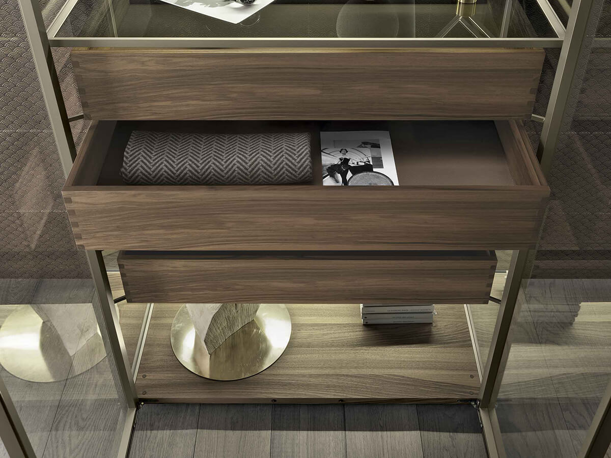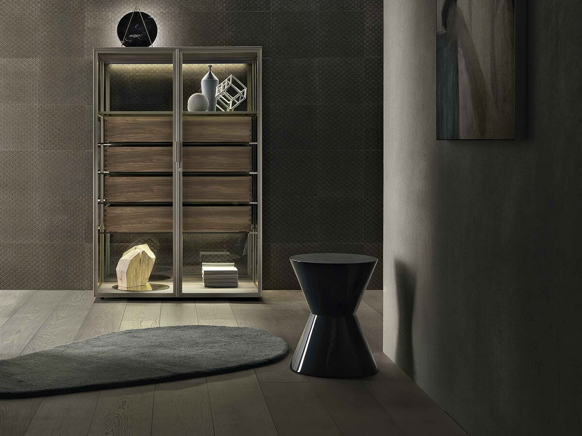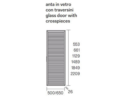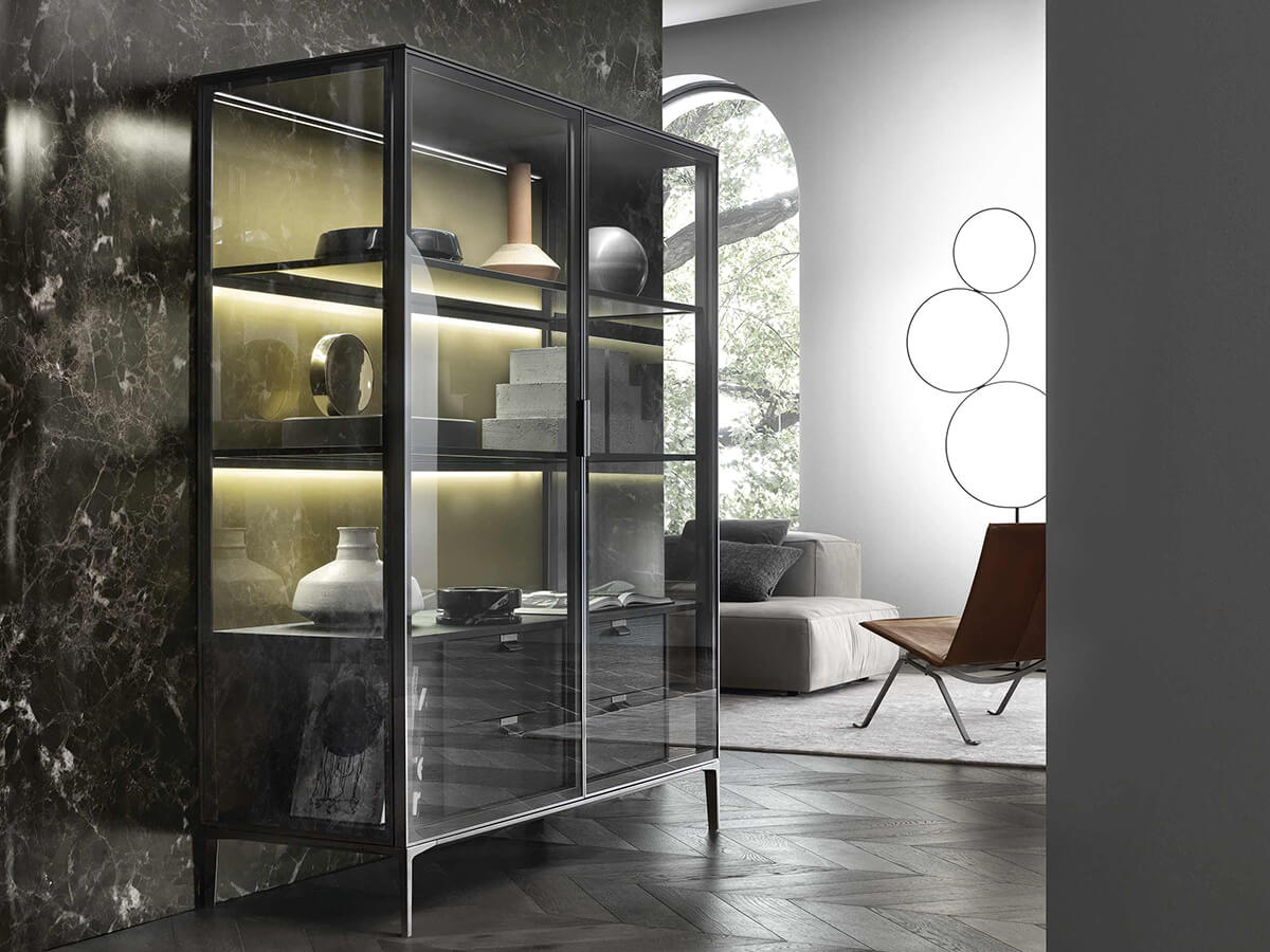 The Alambra system by Rimadesio is a very modern reinterpretation of the traditional concept of sideboard and display cabinet. The aluminium structure, very thin and unobtrusive, leaves all the attention to the finish of the doors: these can be in transparent glass, in a mood to enhance the contents of the sideboard, or in painted glass in the numerous colors of the Rimadesio Ecolorsystem range. In another version, the door is partially covered by a dense succession of parallel crosspieces that partially conceal the view of the interior in a highly refined "see-through effect" effect. Particular attention was paid by Rimadesio in the engineering of the opening and closing system, practical and silent, totally devoid of screws and gaskets.* Technical features: also available with LED lighting