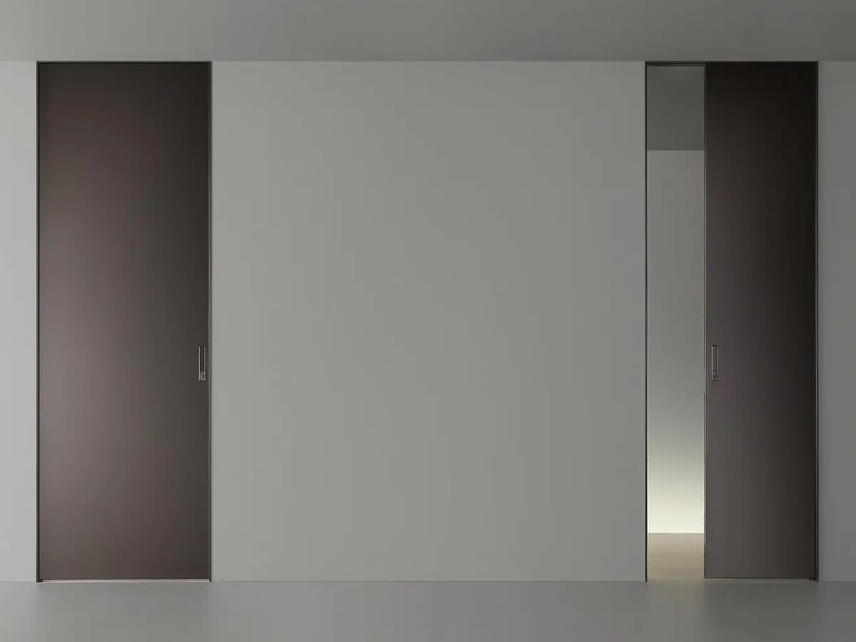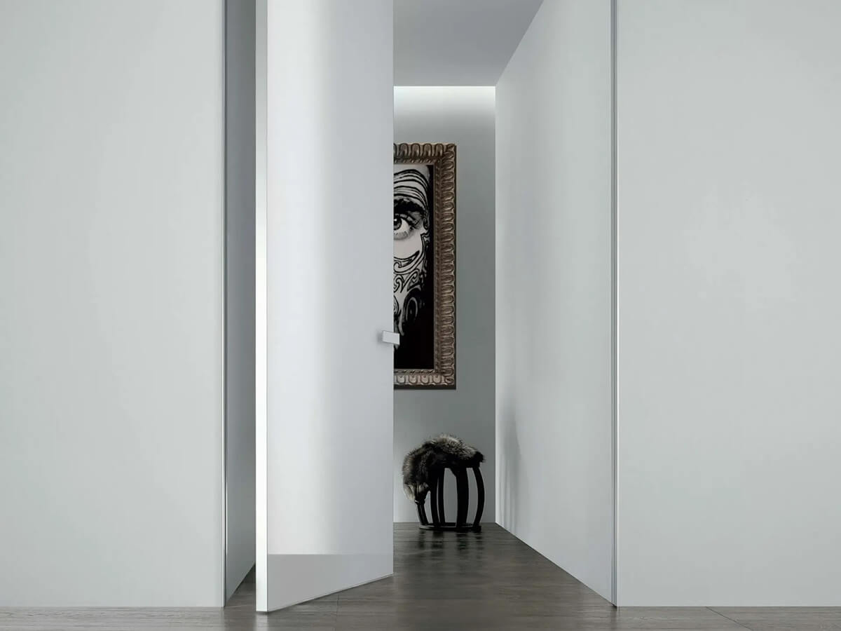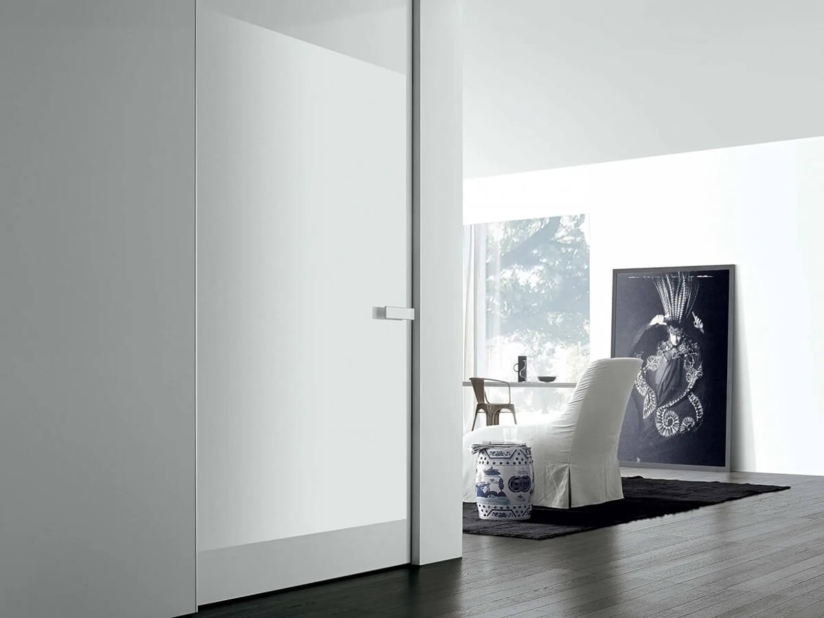 The Aura door by Rimadesio was born in the name of essentiality and minimalism. In fact, it provides for a reduction to the essential of the structural elements such as jambs and frames, emphasizing the innate elegance of the glass panel that makes up the door and letting it be framed only by a very thin perimeter jamb. The door panel is available in a wide choice of different finishes, from lacquered glass from Rimadesio's Ecolorsystem collection to fine woods such as walnut or oak. The opening, very light and silent, is bidirectional, while the closure is available both through an exclusive magnetic closure profile and with a more traditional magnetic lock. In addition to the classic hinged version, the Aura door is also available in a sliding configuration.