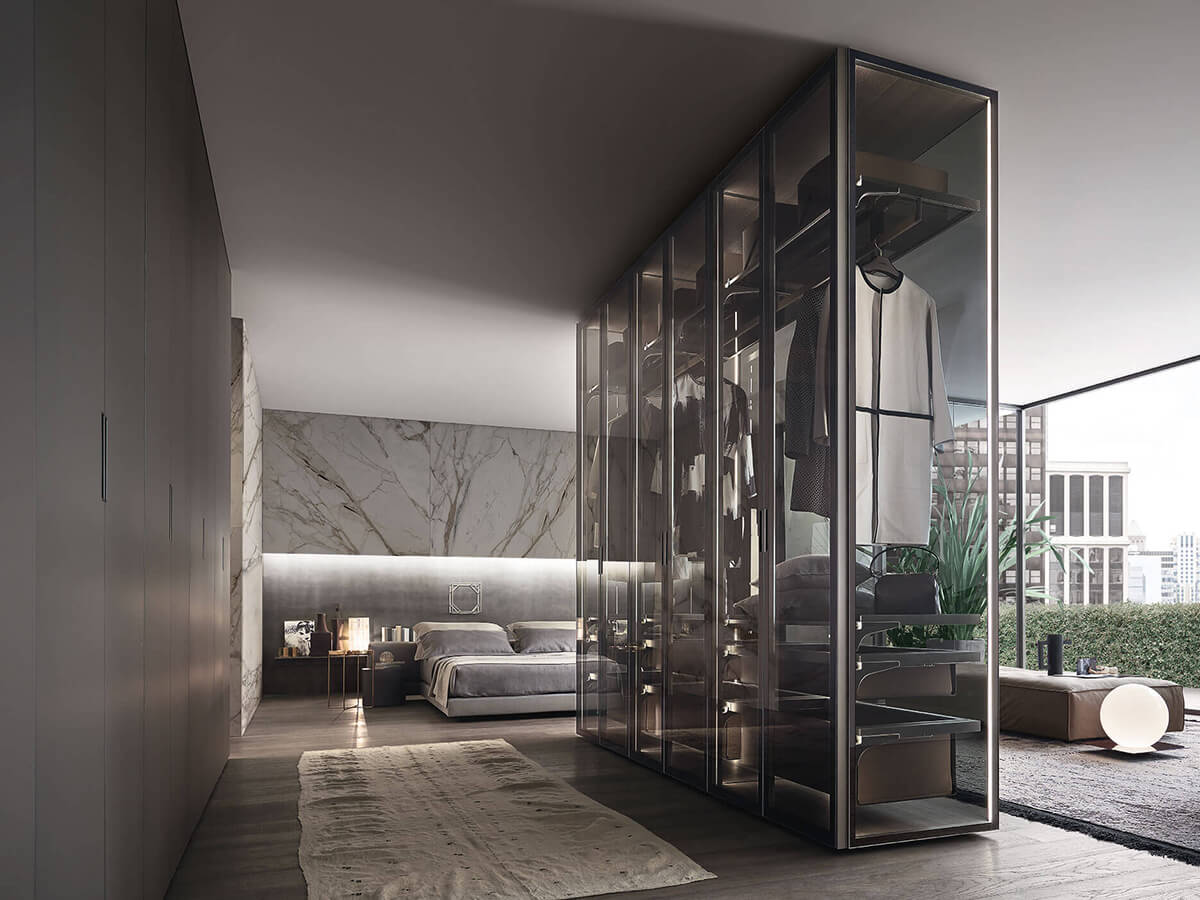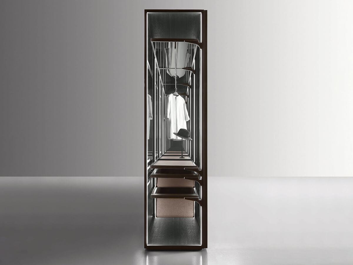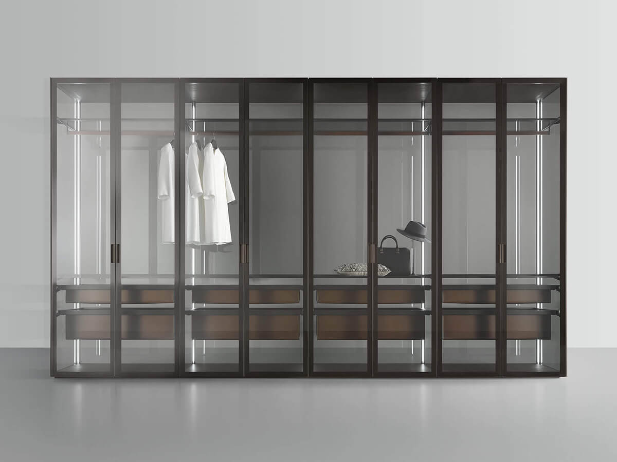 The Cover Freestanding wardrobe incorporates the characteristic doors and frame of the successful Rimadesio Cover series, increasing its versatility thanks to the possibility of adding side panels and back panels. The ingenious and elegant fastening system to the frame of doors and internal equipment is thus maintained, but the compositional possibilities multiply, passing from linear or corner wardrobes to compositions between the walls or in the center of the room.The great variety of Cover Freestanding is emphasized by the choice of finishes, both customizablein the treatment of the aluminum of the frame and in the hinged doors, available in glossy or opaque tempered glass in over 70 colors, or even transparent, etched, reflective, mirrored and much more.