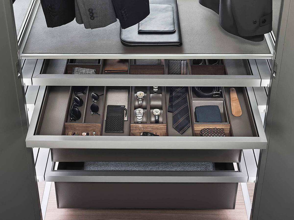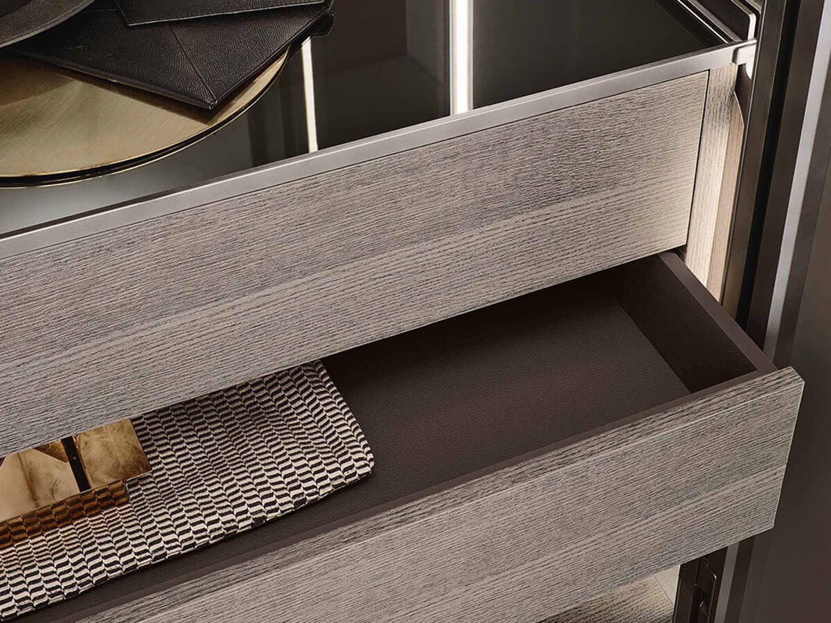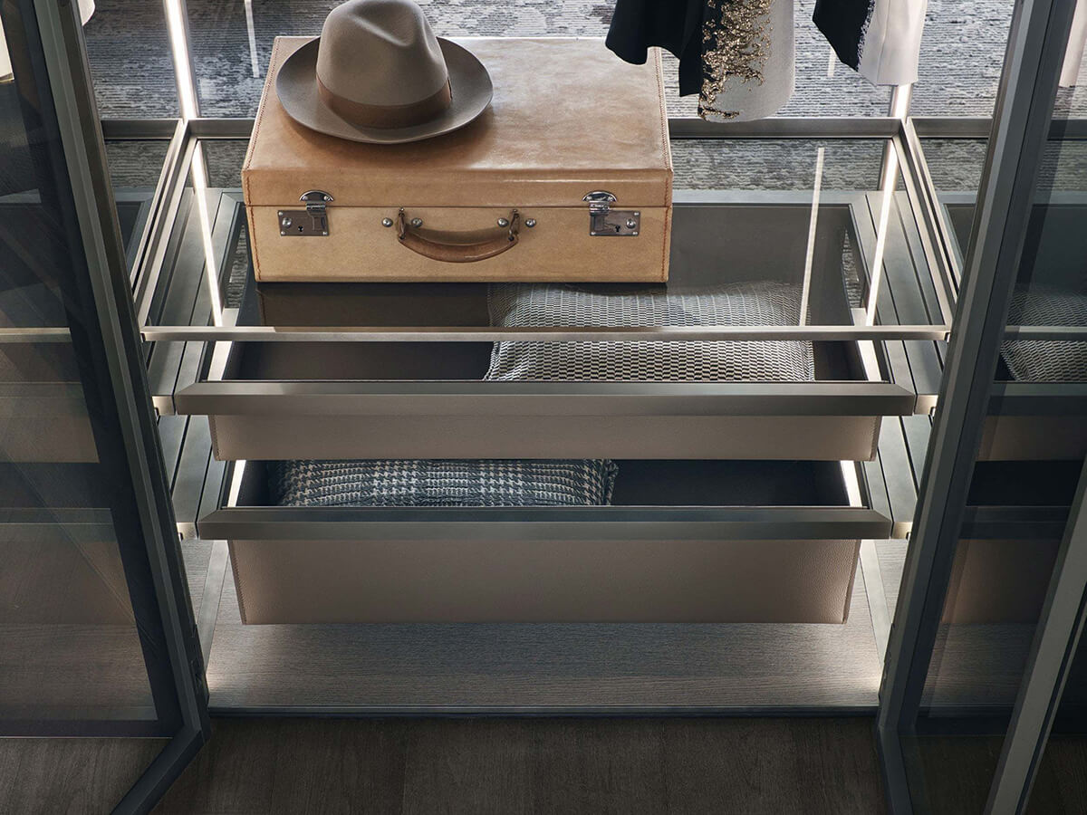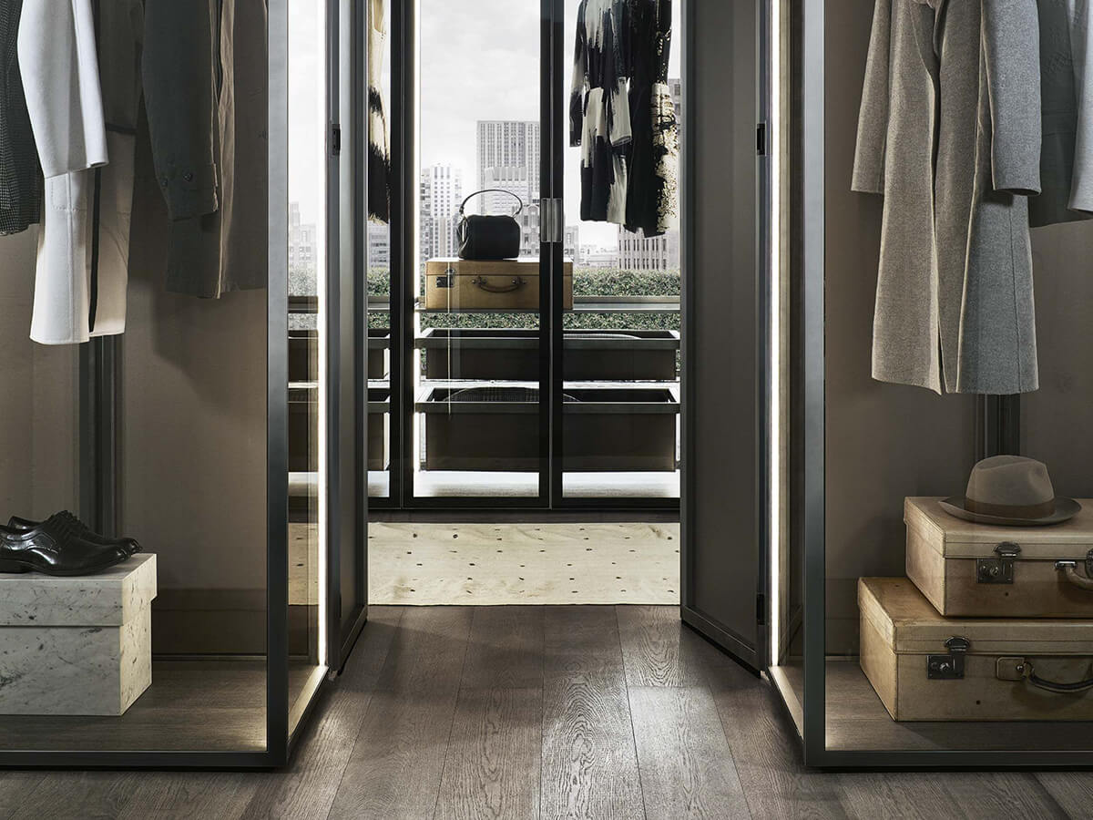 The Cover Freestanding wardrobe incorporates the characteristic doors and frame of the successful Rimadesio Cover series, increasing its versatility thanks to the possibility of adding side panels and back panels. The ingenious and elegant fastening system to the frame of doors and internal equipment is thus maintained, but the compositional possibilities multiply, passing from linear or corner wardrobes to compositions between the walls or in the center of the room.The great variety of Cover Freestanding is emphasized by the choice of finishes, both customizablein the treatment of the aluminum of the frame and in the hinged doors, available in glossy or opaque tempered glass in over 70 colors, or even transparent, etched, reflective, mirrored and much more.