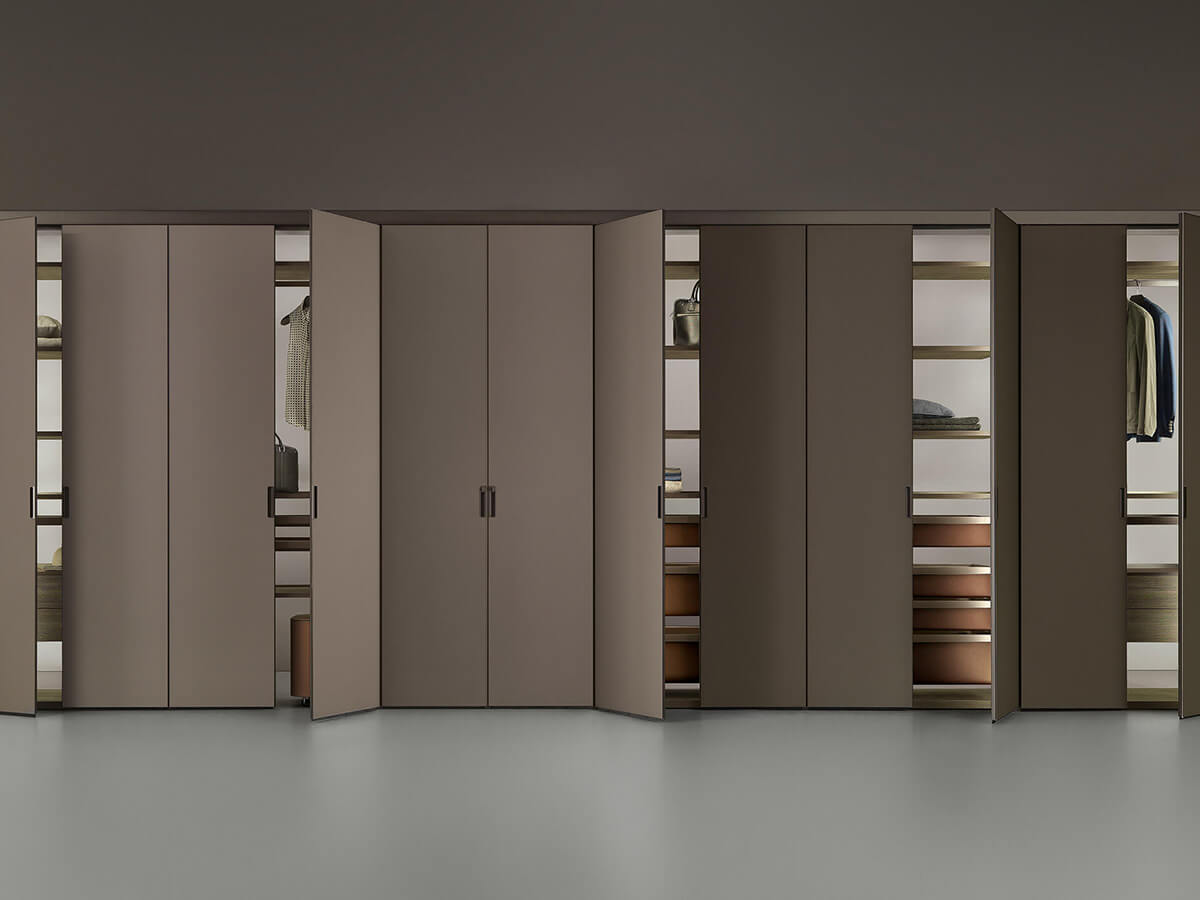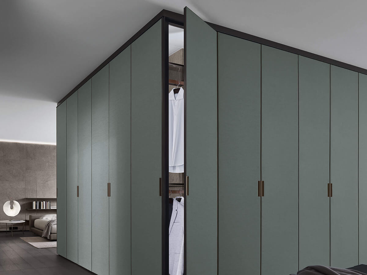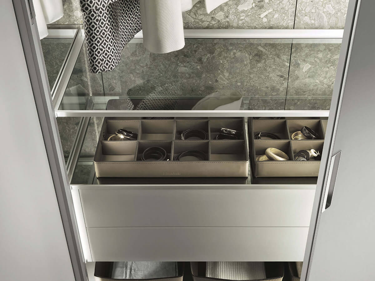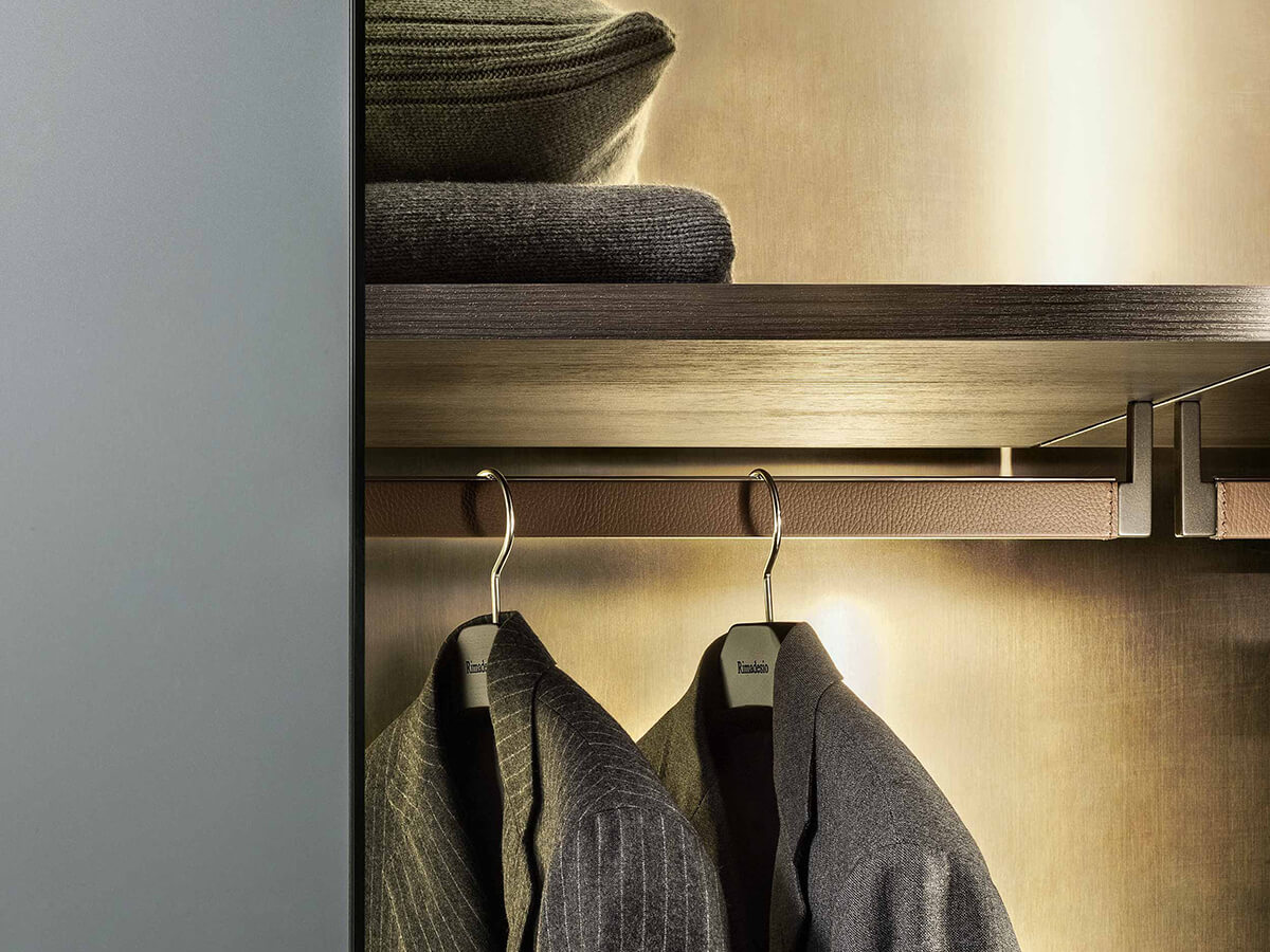 The Cover wardrobe by Giuseppe Bavuso takes its inspiration from Rimadesio's renowned expertise in the door sector to create a wardrobe that turns out to be a small technical jewel. From a structural point of view it is in fact profoundly different from any other wardrobe on the market: without shoulders, it finds its fulcrum in the load-bearing structure fixed to the ceiling and floor, on which both the invisible hinges of the doors and the mounting brackets rest. equipped with an exclusive internal led lighting system. Each element is hooked to the frame thanks to an interlocking system, without visible screws, which allows you to continuously change the internal configuration with extreme ease.Cover is only available with hinged doors, made of precious materials such as glass, Litech, fabric and imitation leather.