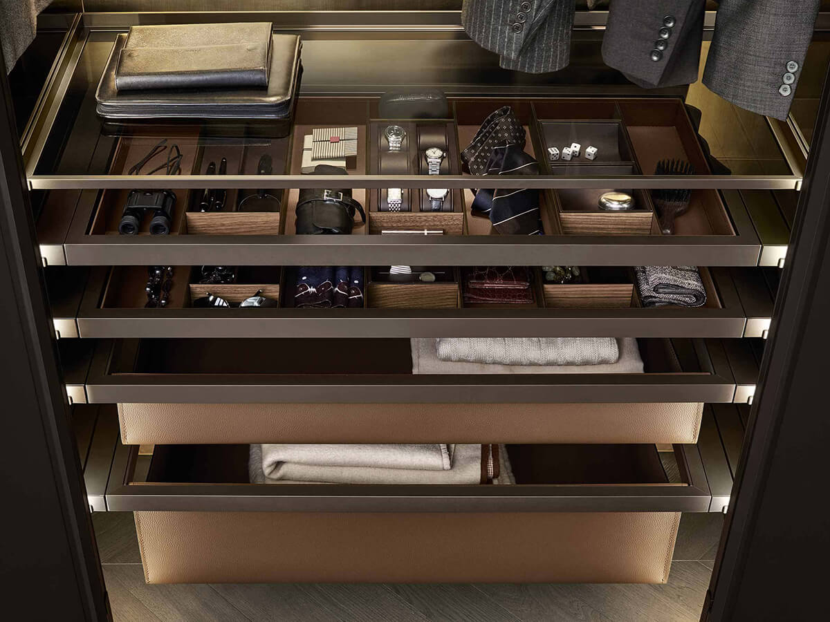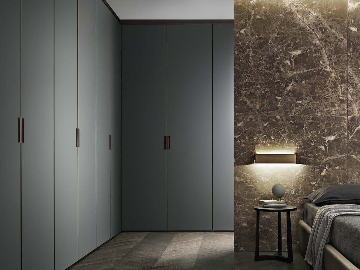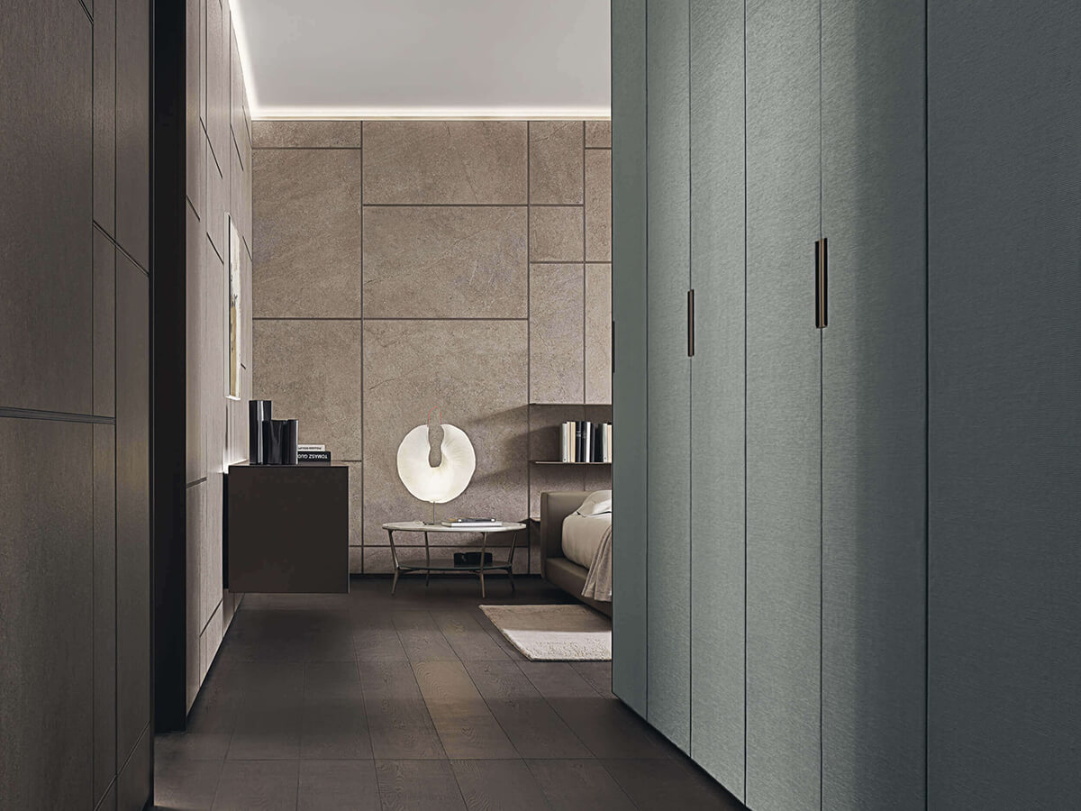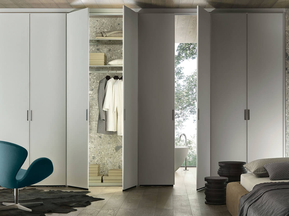 The Cover wardrobe by Giuseppe Bavuso takes its inspiration from Rimadesio's renowned expertise in the door sector to create a wardrobe that turns out to be a small technical jewel. From a structural point of view it is in fact profoundly different from any other wardrobe on the market: without shoulders, it finds its fulcrum in the load-bearing structure fixed to the ceiling and floor, on which both the invisible hinges of the doors and the mounting brackets rest. equipped with an exclusive internal led lighting system. Each element is hooked to the frame thanks to an interlocking system, without visible screws, which allows you to continuously change the internal configuration with extreme ease.Cover is only available with hinged doors, made of precious materials such as glass, Litech, fabric and imitation leather.
