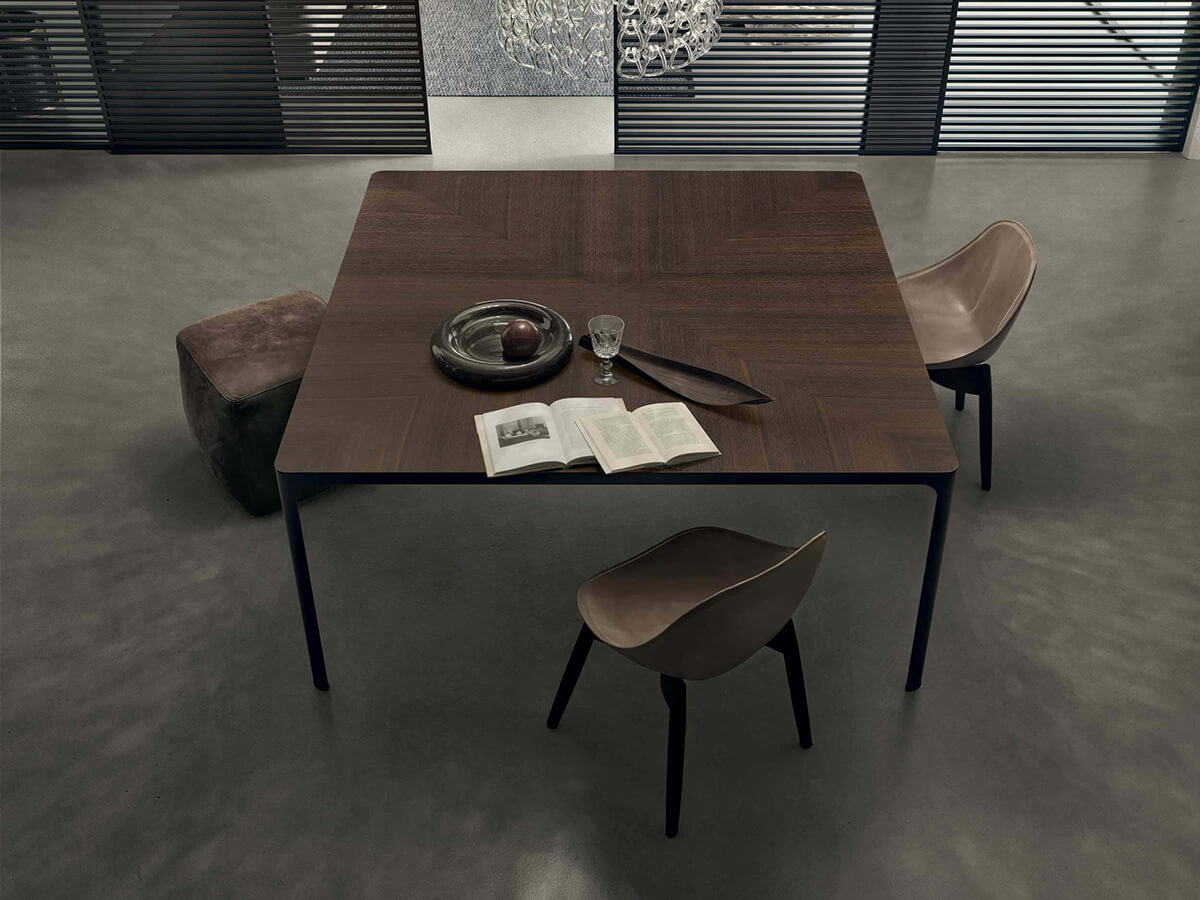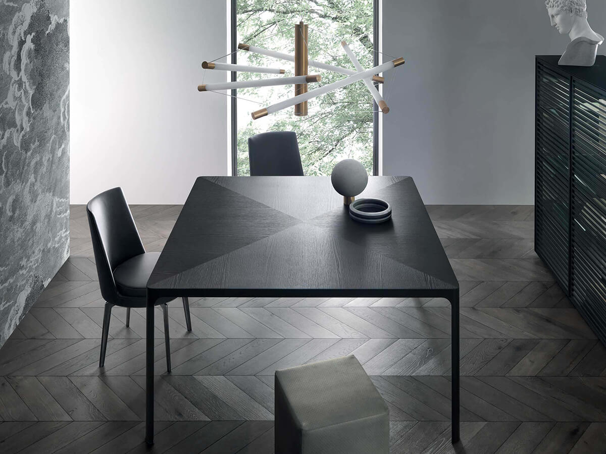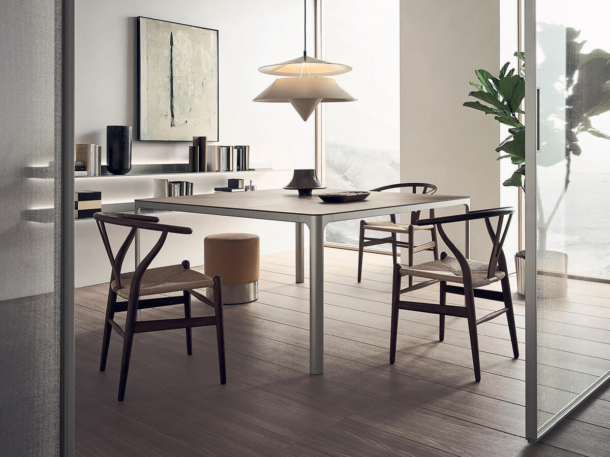 The Flat table by Rimadesio, sober in its shapes and versatile in its possibilities of use, is perfect for both domestic and professional use. The rigor of its lines is softened by the particular rounded design of the corners and legs, which also act as a distinctive stylistic element. It is completely demountable and has invisible joints which give its shape a monolithic appearance. The wide variety of finishes available allows the Flat line of tables to integrate perfectly with the rest of the Rimadesio collections, creating coordinated environments in a game of shapes and materials.* Technical features: the versions with glass top can be equipped with cable ducts