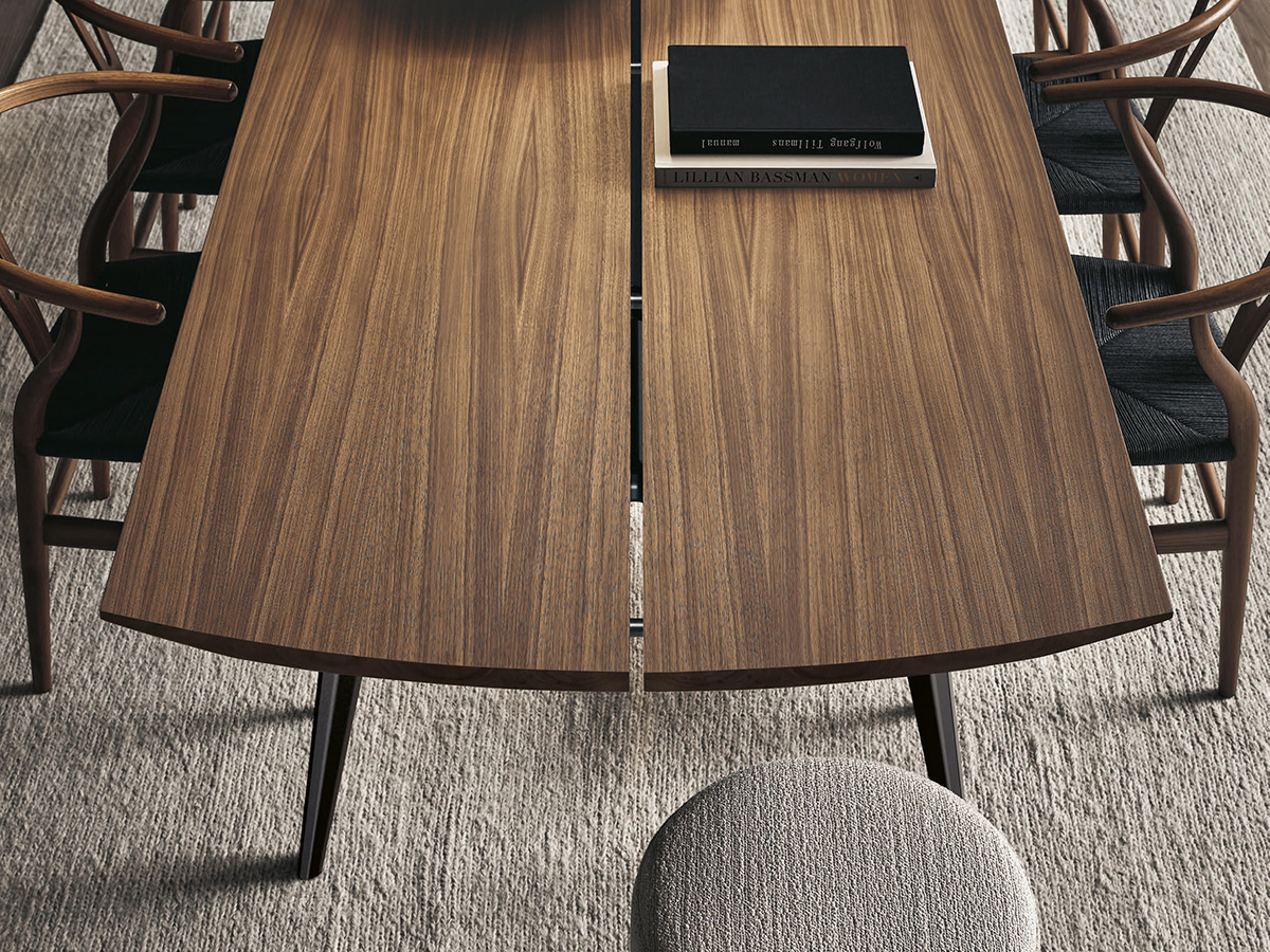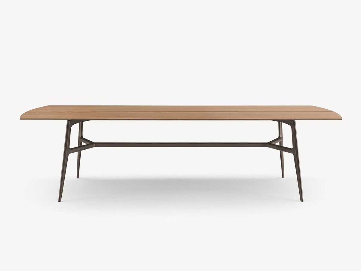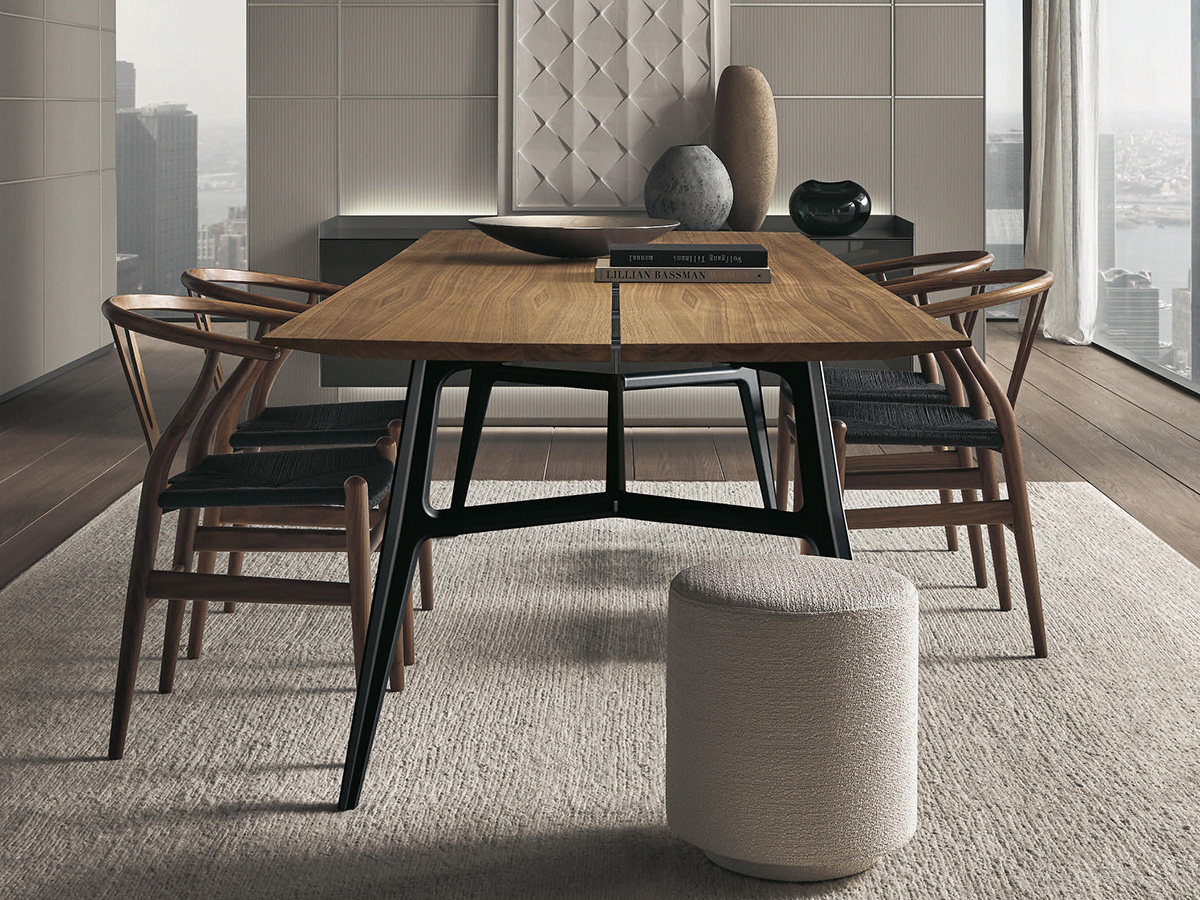 A contemporary furnishing element that seems to want to reinterpret and modernize the more classic refectory tables, large and firm for the convenience of more people. The structure is in die-cast aluminum with octagonal section legs and tie rod designed to guarantee stability in the different rectangular, round and square dimensions. The beauty of Francis arises precisely from the skilful use of wood and its essences, deliberately worked and modeled to bring out its most valuable and elegant part. The shapes and proportions of this object place it in living environments but above all in large dining rooms where a good number of seats is required.