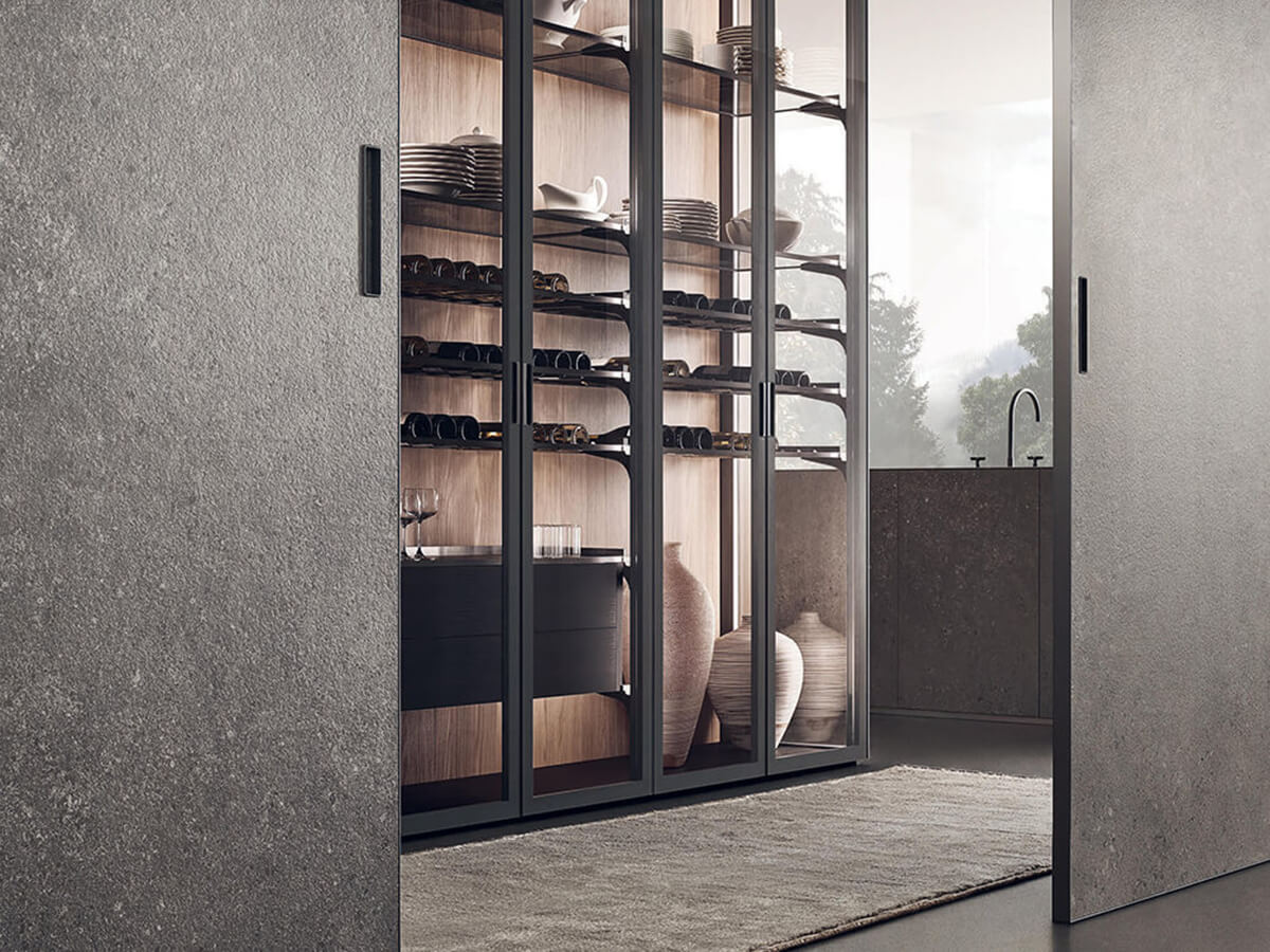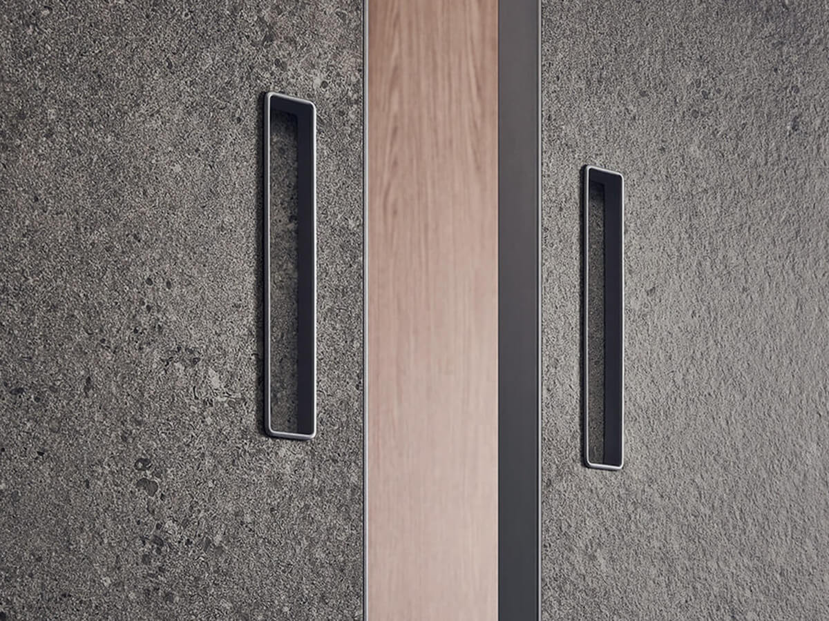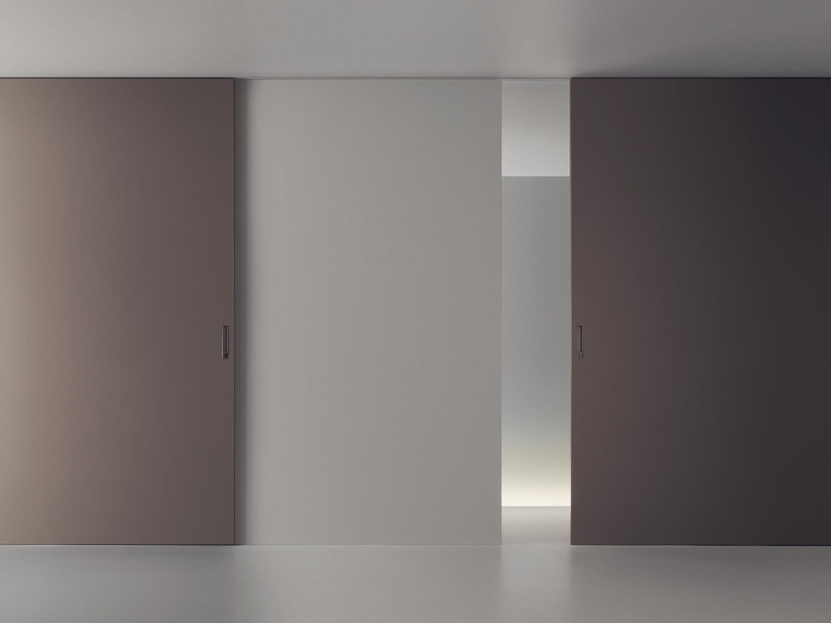 Graphis Plus is a Rimadesio sliding door system characterized by a minimalist and essential aesthetic. The panels, which can be perfectly made to measure, are totally devoid of any decorative tinsel and constitute a uniform surface interrupted only by the small graphic sign of the handle. They are therefore perfect to best express the charm of a material and, for this reason, they have a very wide range of finishes to choose from, starting from dozens of variants of classic Rimadesio glass (with all its Ecolorsystem lacquering system and countless reflective, mirroring, etched and much more variants), passing through imitation leather up to warmer materials such as wood.