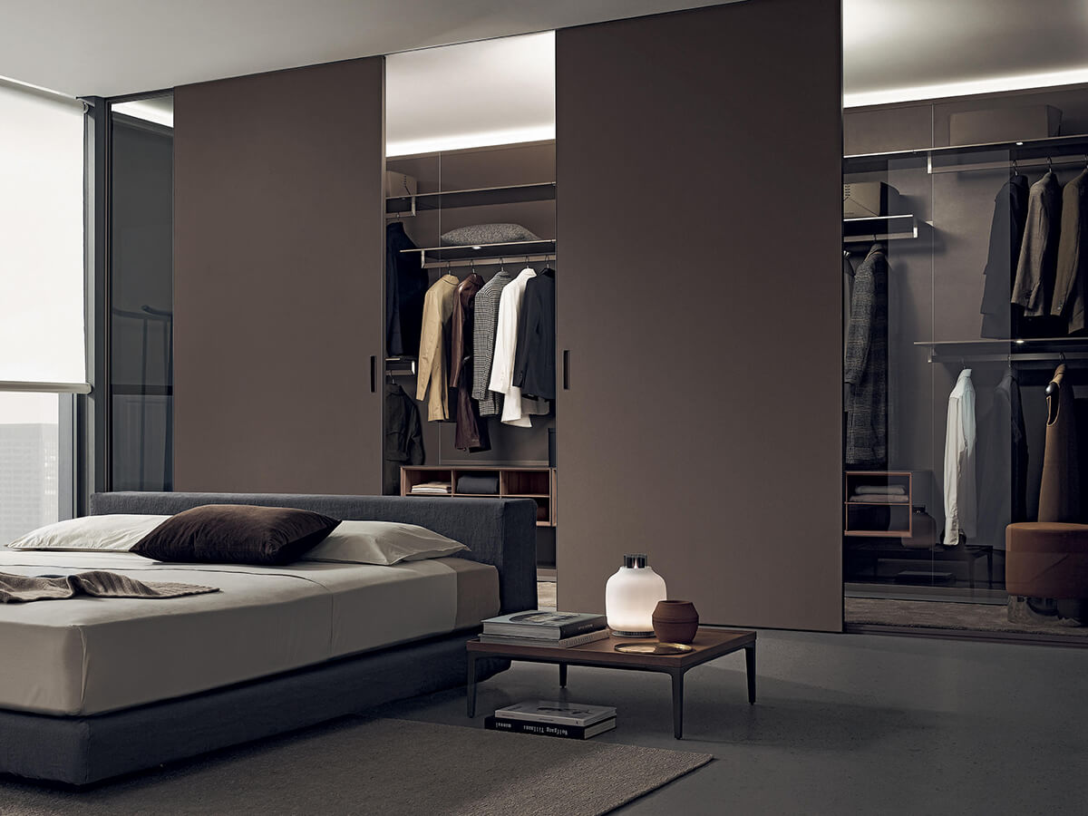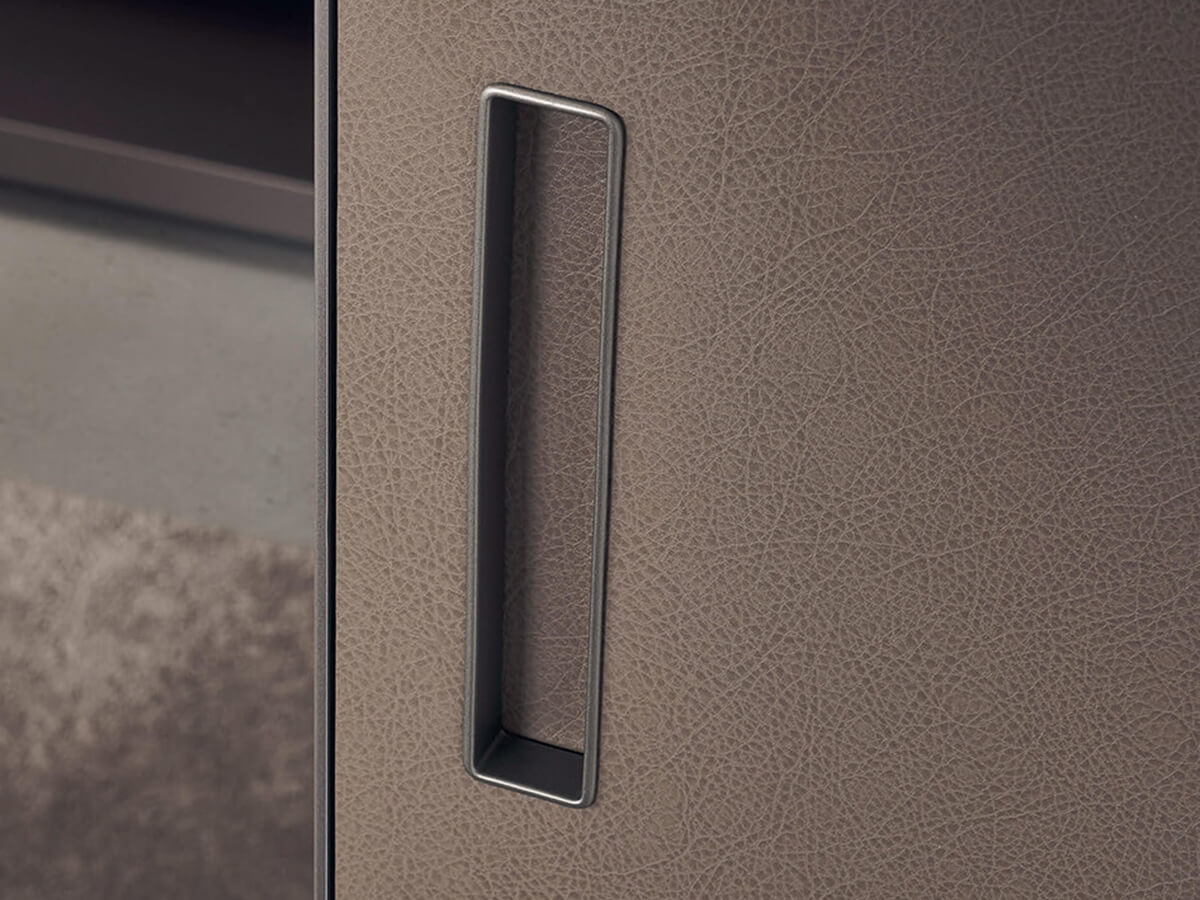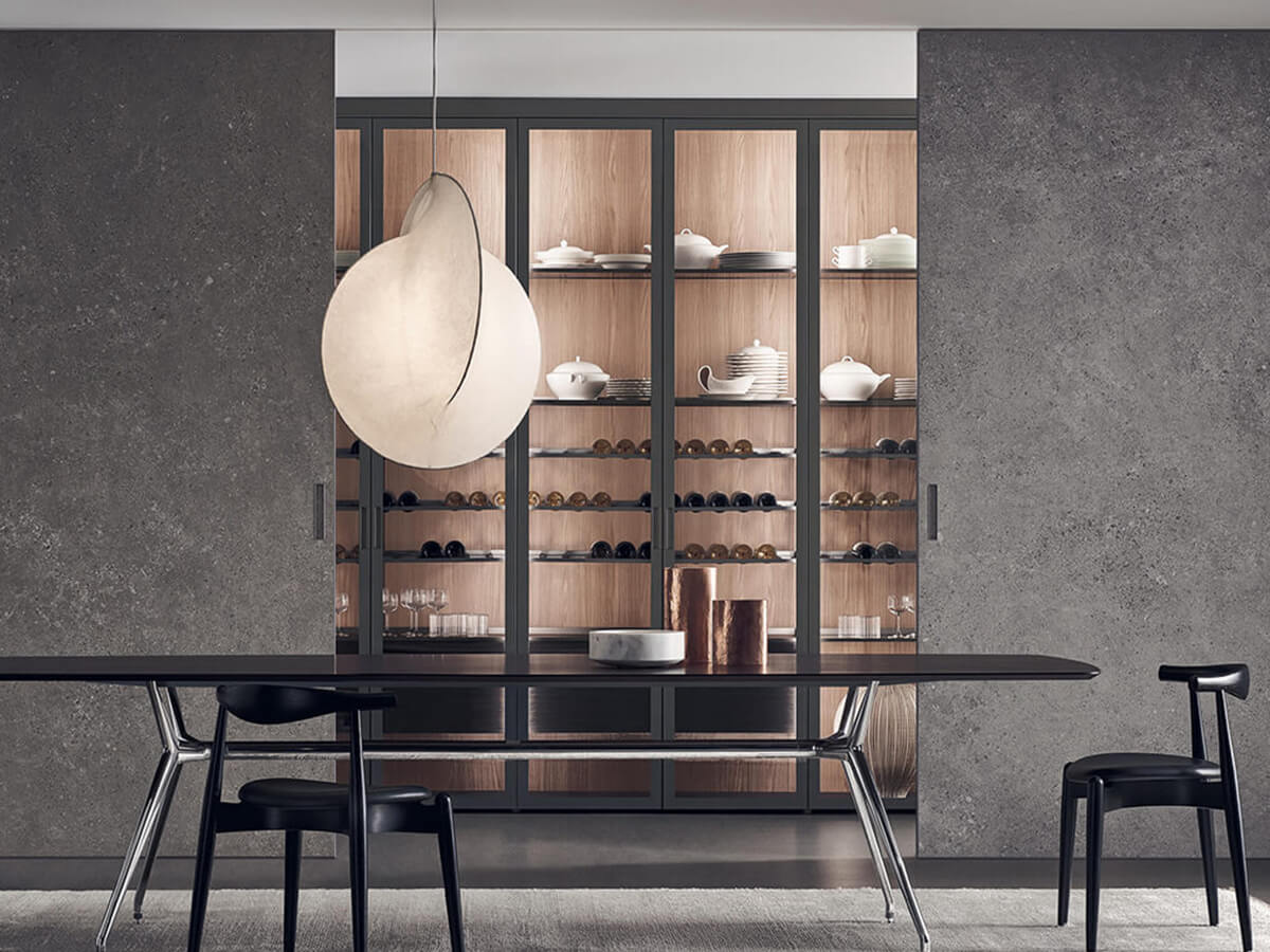 Graphis Plus is a Rimadesio sliding door system characterized by a minimalist and essential aesthetic. The panels, which can be perfectly made to measure, are totally devoid of any decorative tinsel and constitute a uniform surface interrupted only by the small graphic sign of the handle. They are therefore perfect to best express the charm of a material and, for this reason, they have a very wide range of finishes to choose from, starting from dozens of variants of classic Rimadesio glass (with all its Ecolorsystem lacquering system and countless reflective, mirroring, etched and much more variants), passing through imitation leather up to warmer materials such as wood.