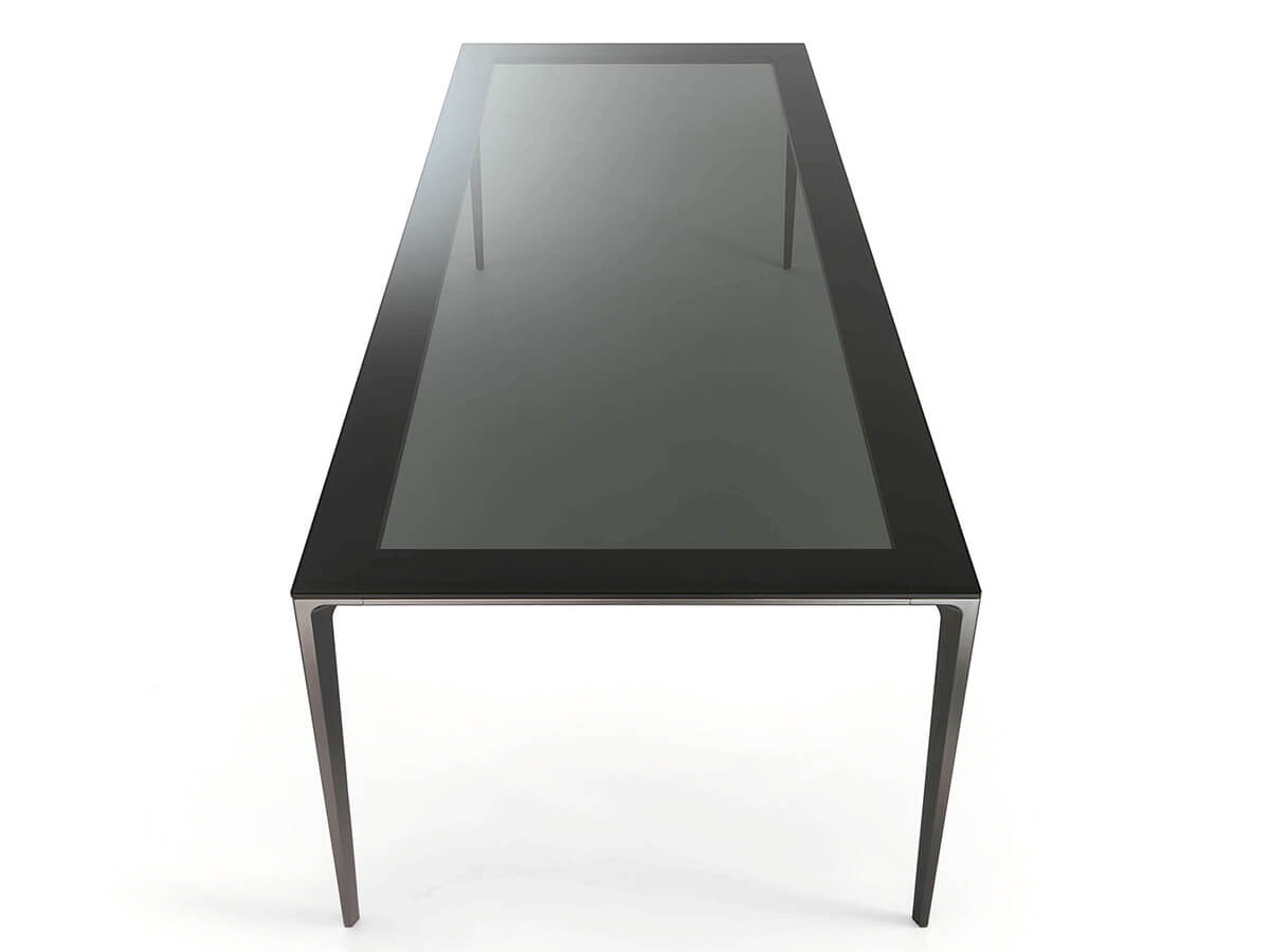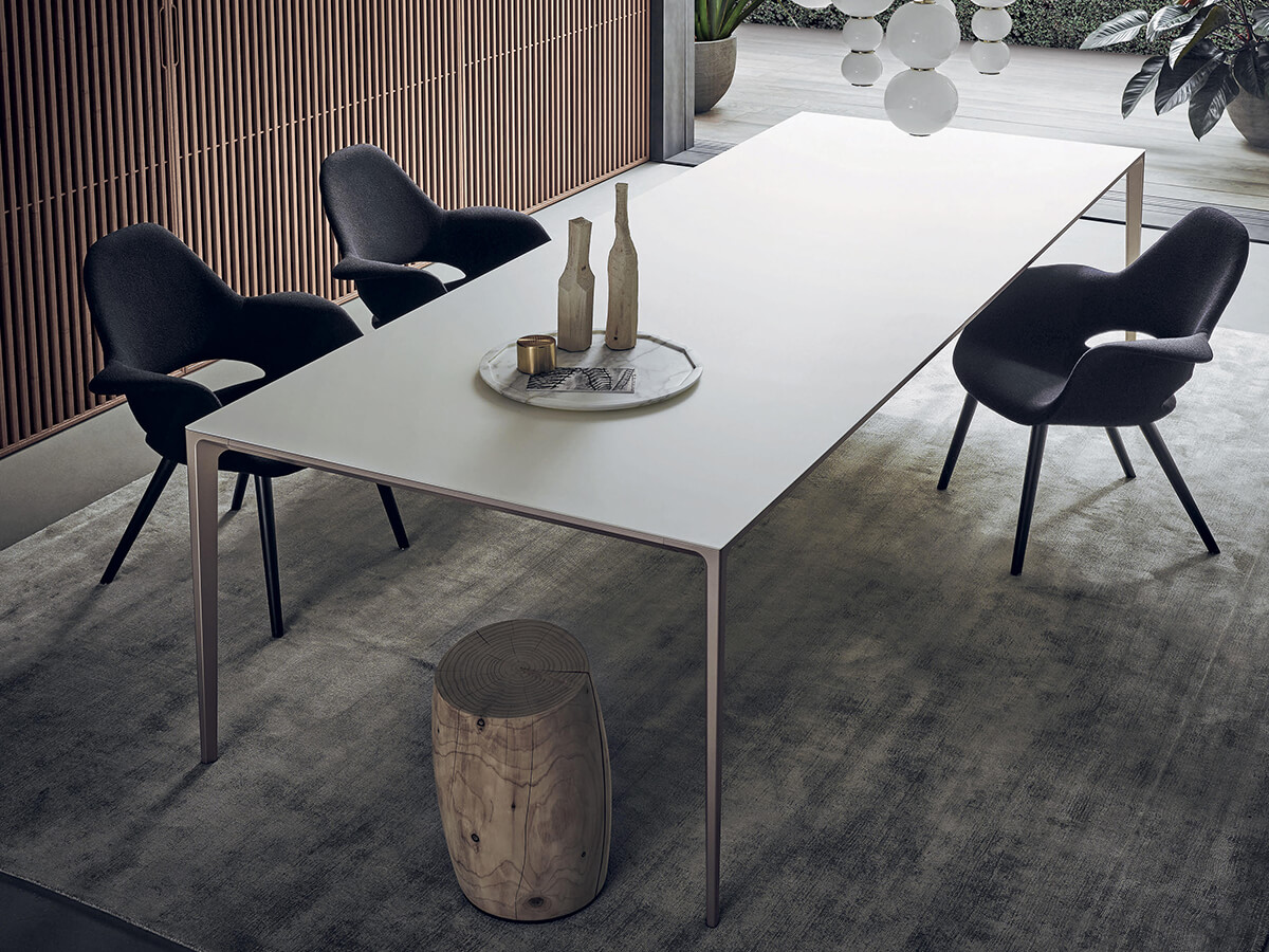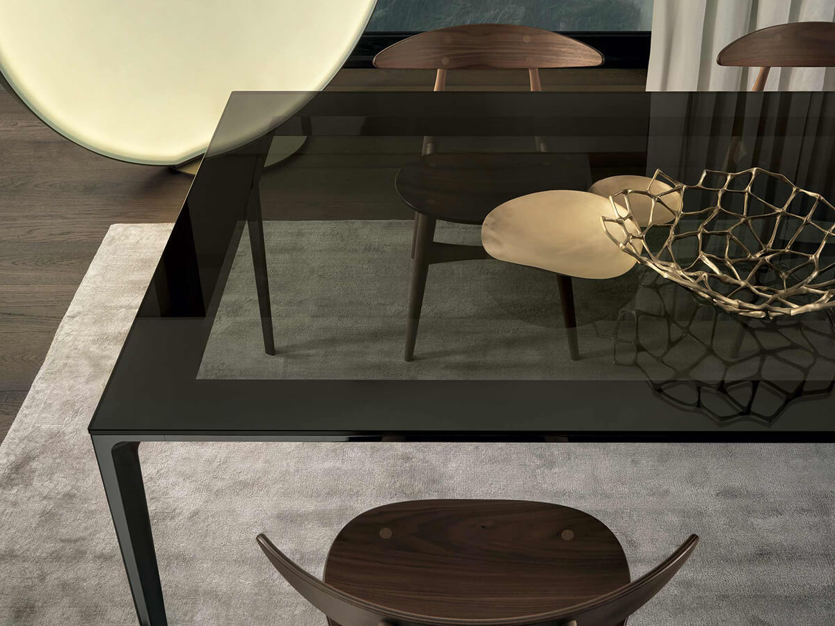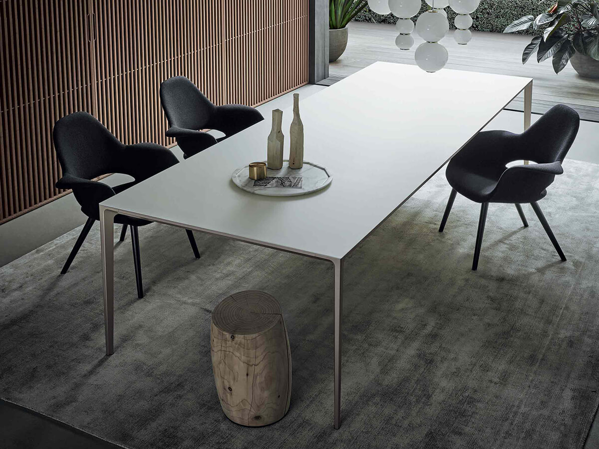 Long Island is a minimalist but at the same time technically refined table, in line with the traditional Rimadesio philosophy that combines cold and essential shapes with complex and highly valuable constructive solutions. Its clean lines are strongly inspired by the school of Rationalism and see their fulcrum in the four very thin legs in die-cast aluminum, on which rests a top that can be customized in a variety of finishes. In addition to the fixed version, Long Island is also available as an extendable table, guided by an invisible and sophisticated mechanism.* Technical features: the versions with lacquered glass top can be equipped with cable ducts