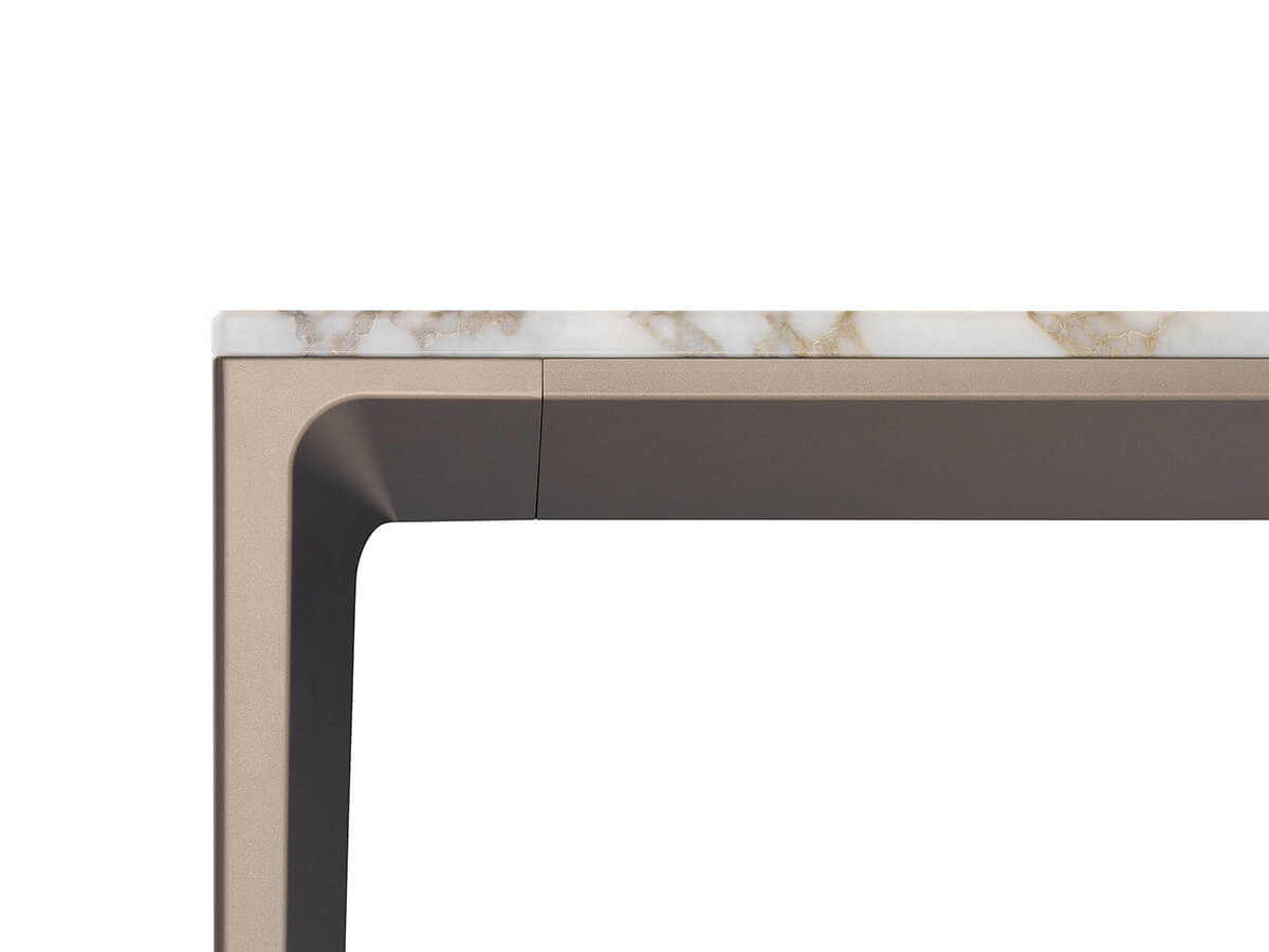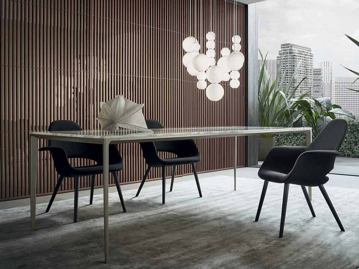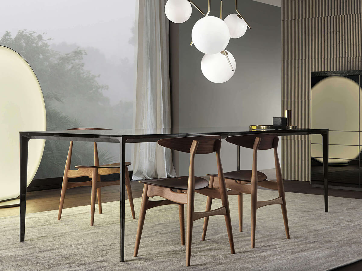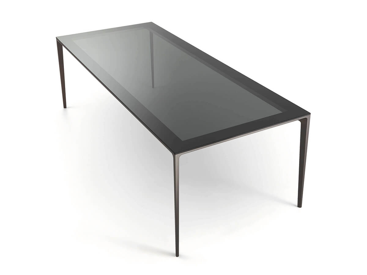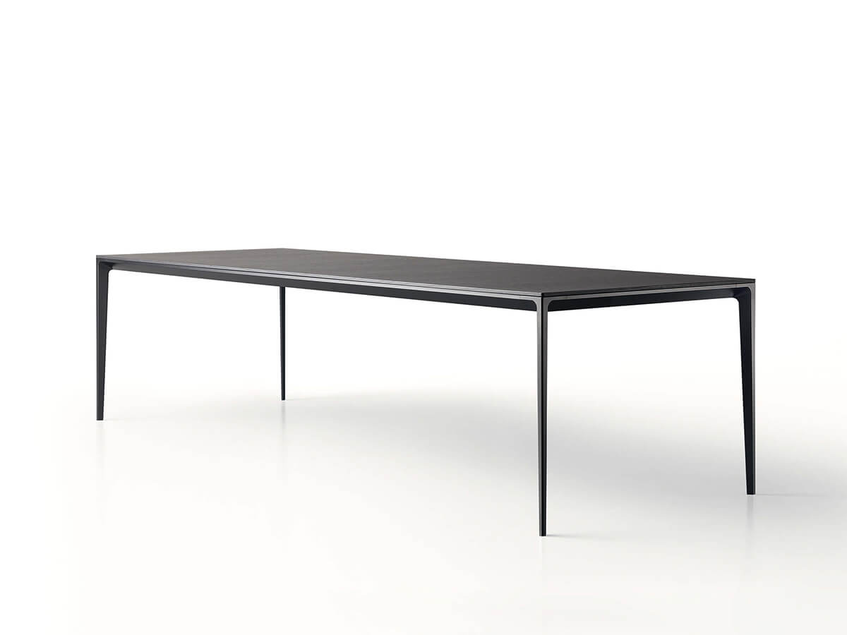 Long Island is a minimalist but at the same time technically refined table, in line with the traditional Rimadesio philosophy that combines cold and essential shapes with complex and highly valuable constructive solutions. Its clean lines are strongly inspired by the school of Rationalism and see their fulcrum in the four very thin legs in die-cast aluminum, on which rests a top that can be customized in a variety of finishes. In addition to the fixed version, Long Island is also available as an extendable table, guided by an invisible and sophisticated mechanism.* Technical features: the versions with lacquered glass top can be equipped with cable ducts