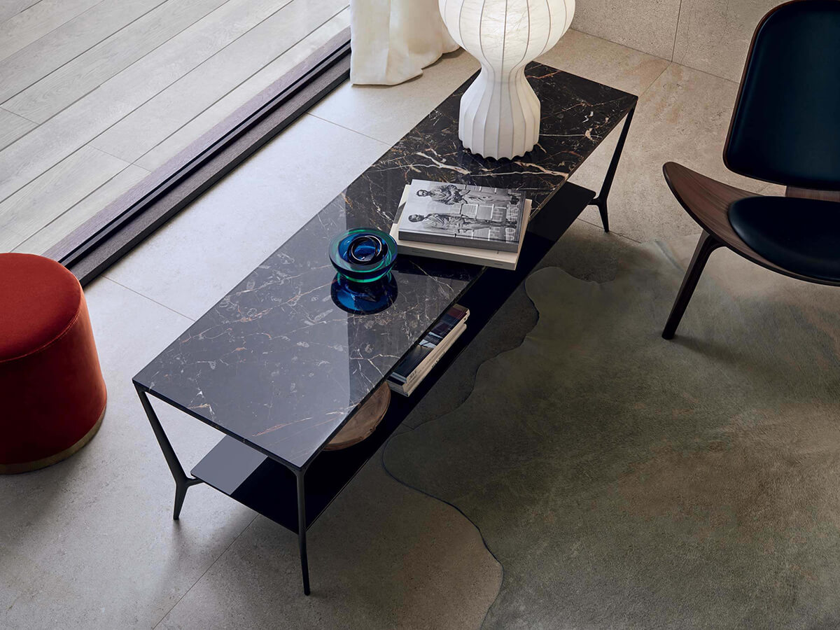 In a perfect balance of shapes, the Planet coffee table by Rimadesio consists of two superimposed tops supported by thin legs with a decisive sign that give the composition a harmonious effect of dynamism. Its aesthetic peculiarity is contained in the contrasting game between the floors, with the larger upper one and the lower one that incorporates the same geometries in restricted proportions but in a different material and in a different thickness, in a solution of great scenographic effect but not devoid of practical utility that multiplies the support capacity. Planet declines this refined concept in different shapes, with round, square or rectangular tops also designed to be combined with each other in pleasant compositions of tables.* Technical features: the lower top is only available in glossy or matt lacquered glass