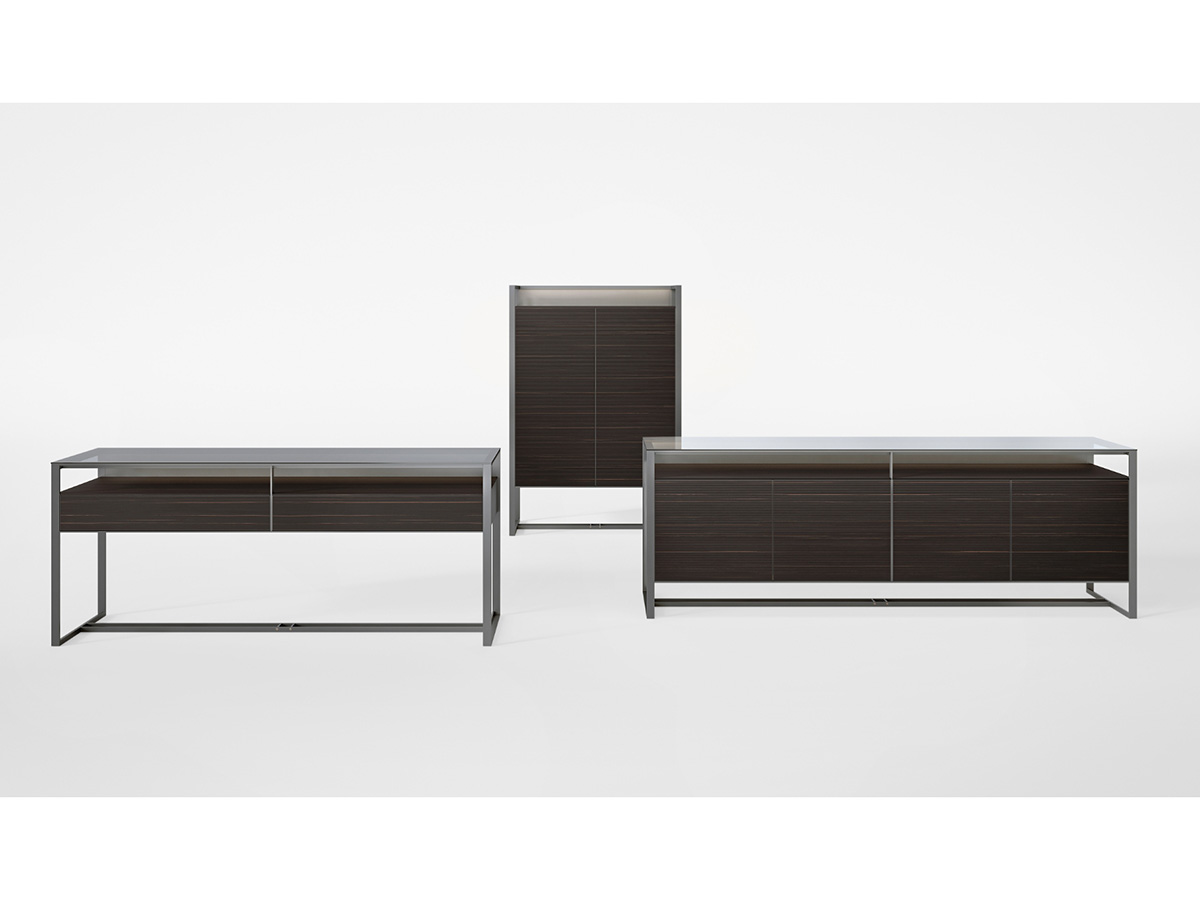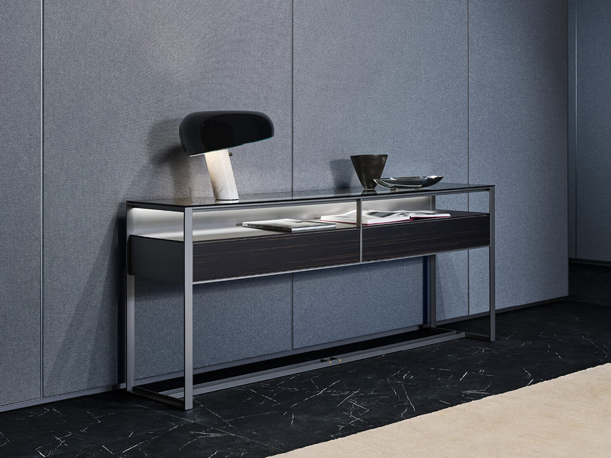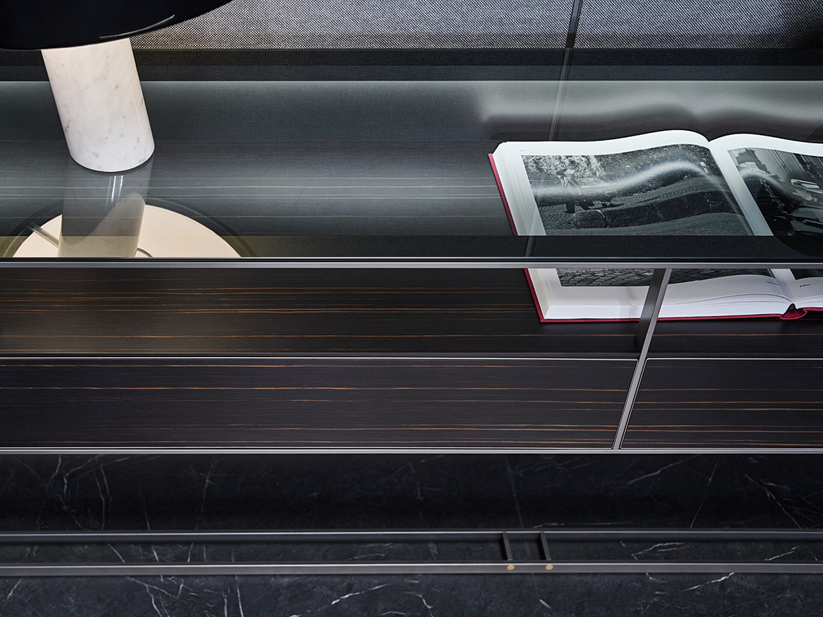 The Rialto collection is characterized by the aesthetic and formal research carried out on each of its elements which include numerous proposals including a sideboard, a coffee table, a console and more. Each is designed to furnish a modern and functional home, where aesthetics intertwine with the needs of daily life. The Rialto console was born precisely from this precious conceptual research, resulting in a further object of common use that enriches and fills spaces with a burst of beauty. Like the other elements, it features a precious glass top that lightens and makes the figure cooler. Available in numerous woods and colors to better adapt to living and dining spaces, or even for studies or public spaces.