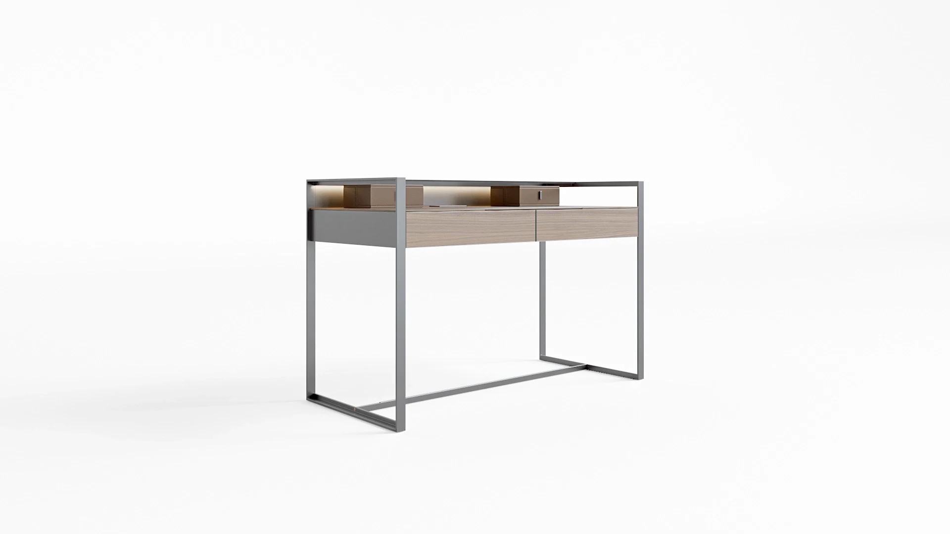 Elegance and design united in a single common denominator, designed for the home office but also for anyone who needs a space in which to store documents, objects or carry out small office tasks. Rialto is a desk with a rigorous and sophisticated aesthetic that combines numerous materials and elements in order to create a real graft of multiple volumes. Wood, glass and metal intertwine, giving life to a contemporary aesthetic that goes well with the most modern homes. No less important is the possibility of placing this element in any room of the house thanks to its neutral aesthetic and minimal cut.
