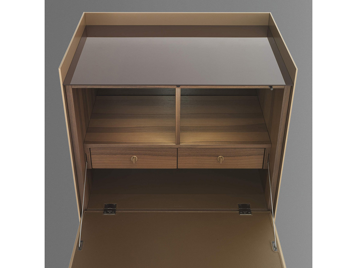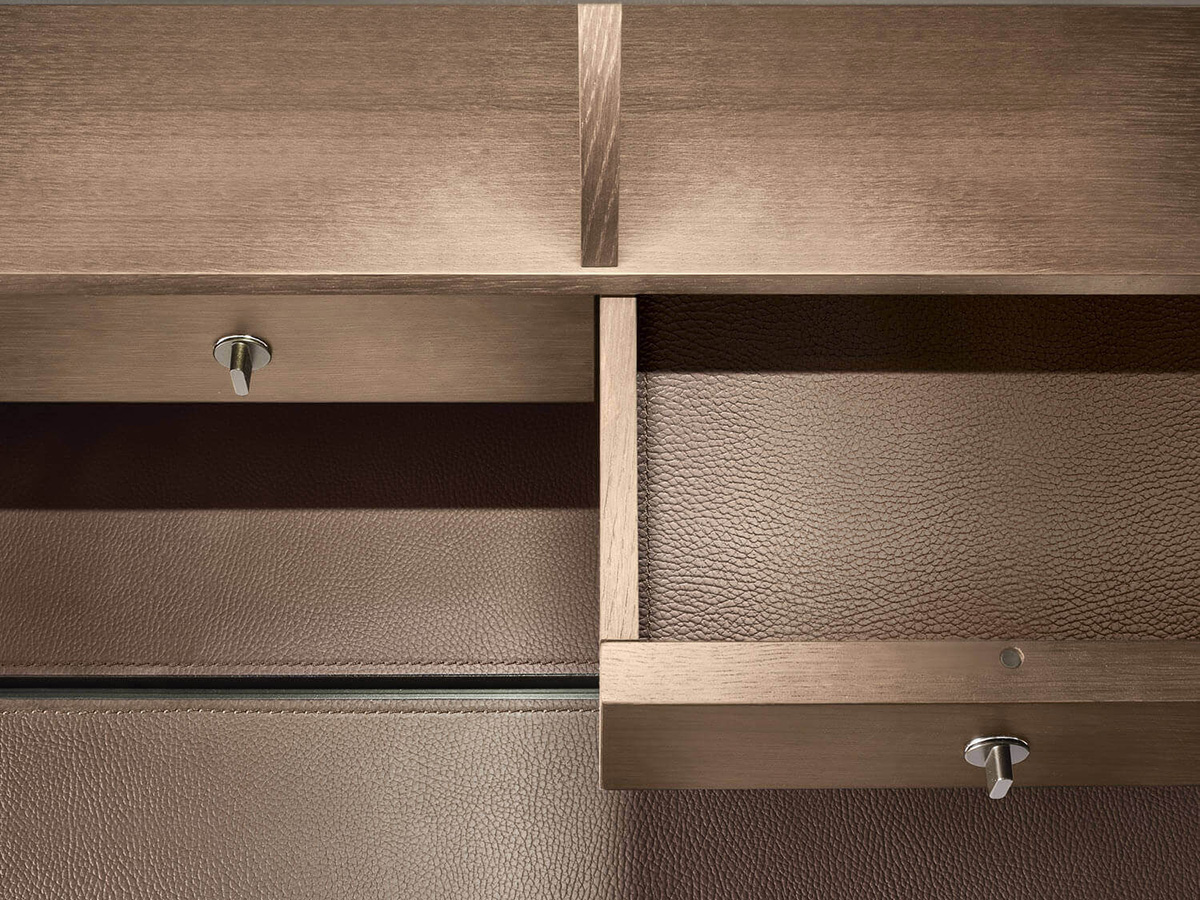 A collection of chests of drawers of extreme elegance and beauty, born from the intention of creating a precious connection between wood and glass. The Self collection includes some variants including Self, Self Up and Self Bold for an almost inexhaustible range of choice that aims to accommodate even the most demanding requests. The system includes internal LED lighting with an infrared ignition sensor and an internal power supply to illuminate the interior and make interaction with this object easier. The numerous materials used are interesting, including glass, copper and walnut wood.
