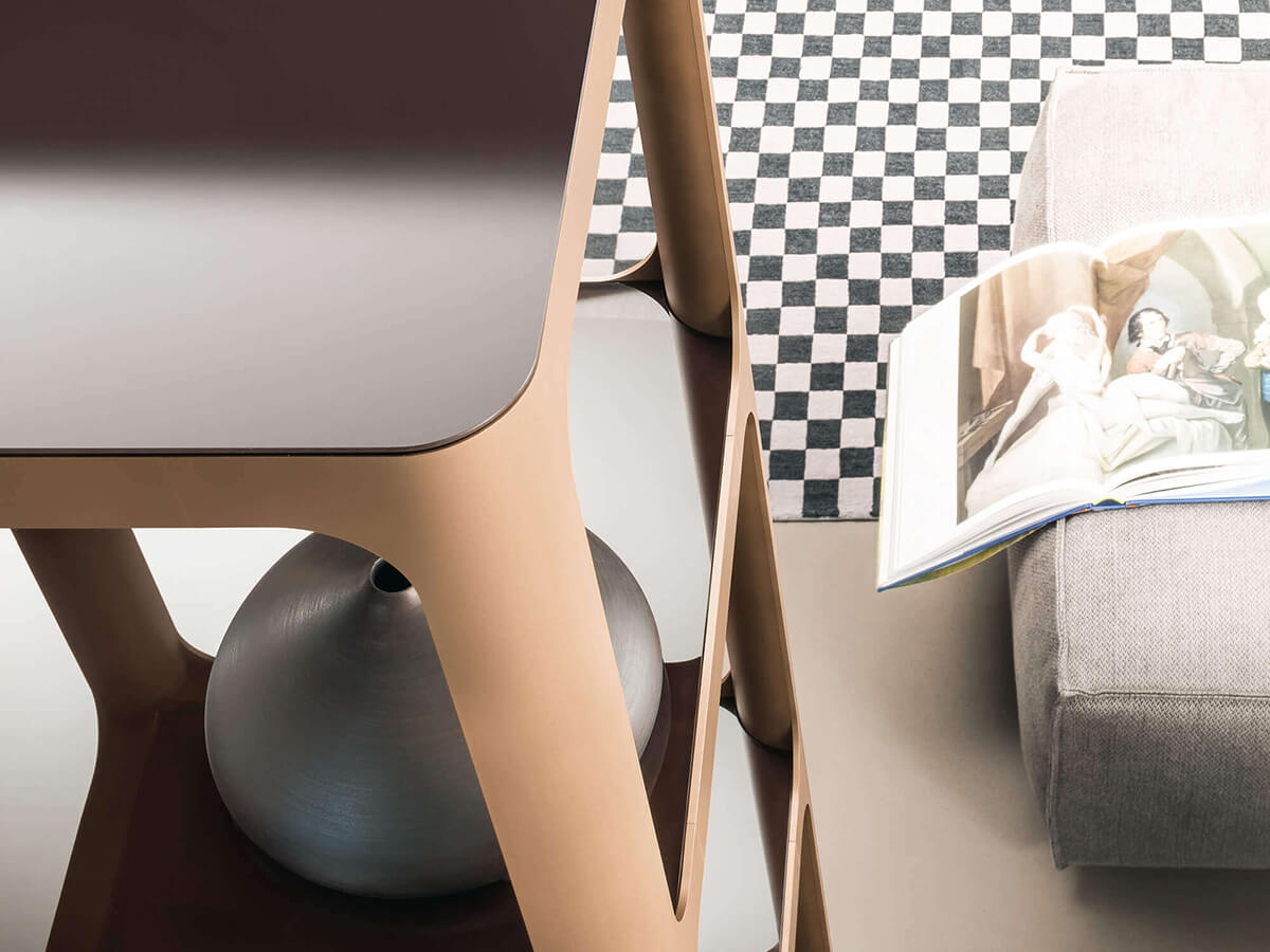 The Sixty coffee table by Rimadesio, signed like all the rest of the brand's collections by Giuseppe Bavuso, takes on a distinct personality thanks to the unusual design of the aluminum structural profile. The frame, with markedly rounded corners and without edges that give the structure a particularly gentle flow, creates in fact a sort of “cage” that frames two superimposed levels, of equal shapes and sizes. The two tops can also share the same materials, thus giving the table a monolithic and uniform appearance, or they can be made in different finishes, in a game of contrasts that adds variety to the sculptural lines of the table.* Technical features: with upper top in wood, lower top available only in glossy or matt lacquered glass