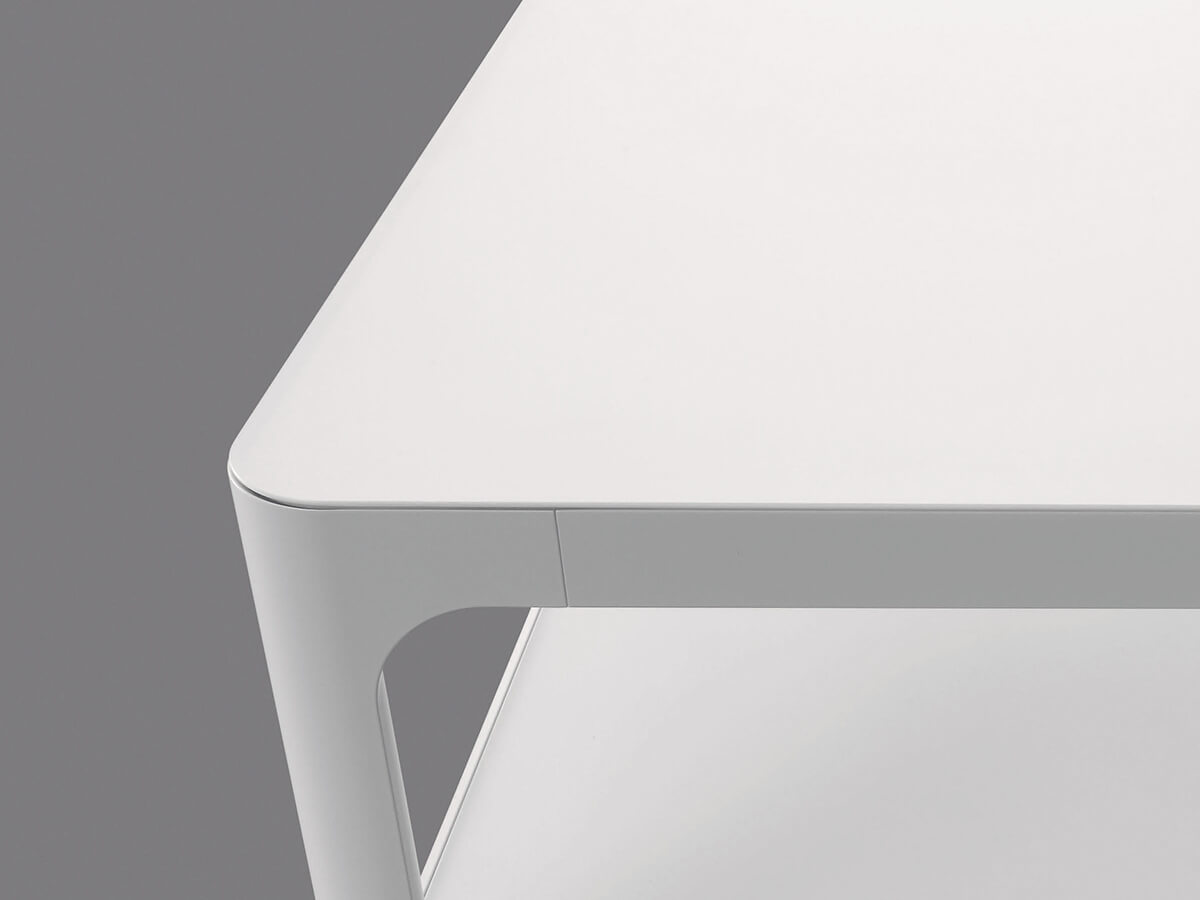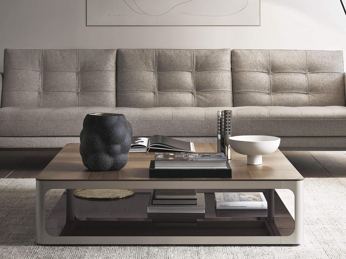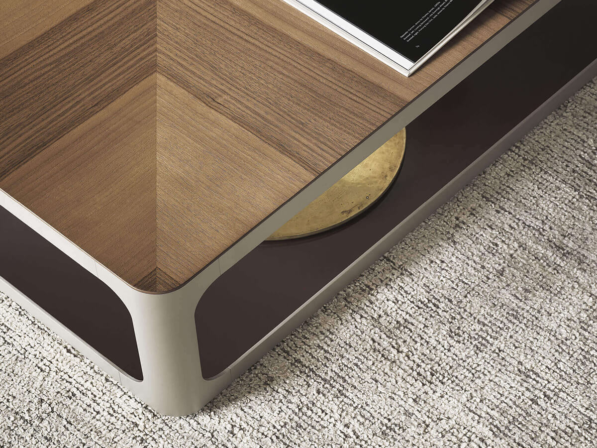 The Sixty coffee table by Rimadesio, signed like all the rest of the brand's collections by Giuseppe Bavuso, takes on a distinct personality thanks to the unusual design of the aluminum structural profile. The frame, with markedly rounded corners and without edges that give the structure a particularly gentle flow, creates in fact a sort of “cage” that frames two superimposed levels, of equal shapes and sizes. The two tops can also share the same materials, thus giving the table a monolithic and uniform appearance, or they can be made in different finishes, in a game of contrasts that adds variety to the sculptural lines of the table.* Technical features: with upper top in wood, lower top available only in glossy or matt lacquered glass