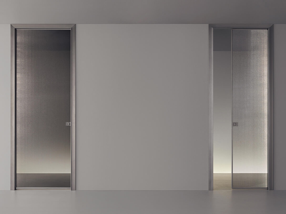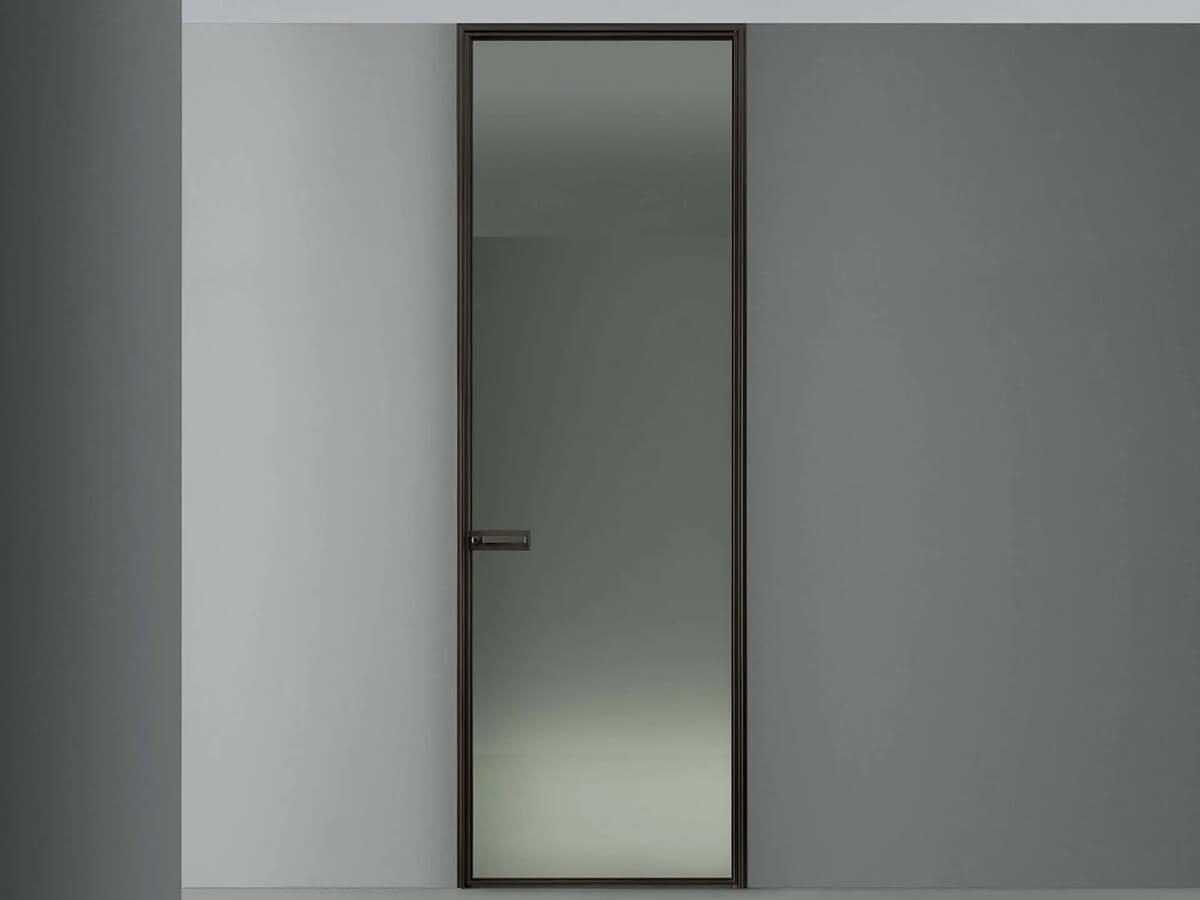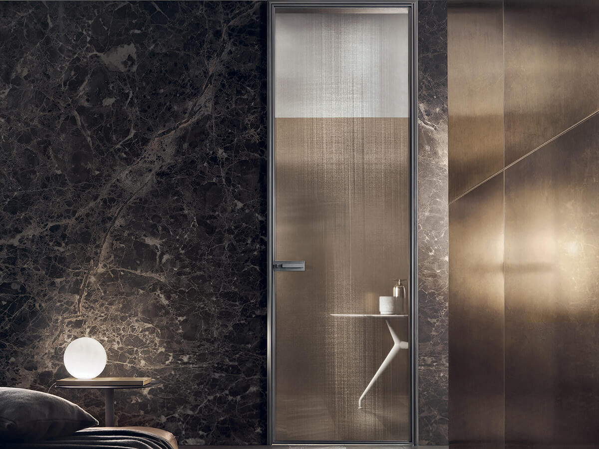 The Spin model by Rimadesio is a door with a cold and austere look, of impeccable elegance. Available in both hinged and internal sliding versions, it bases its charm on a jamb and a frame with reduced thickness but strongly marked in relief that frame the central glass panel in a rigidly geometric frame. Spin can take on a very different aesthetic depending on the finish chosen for the glass of the door panel, which can be transparent, glossy lacquered in different colors, mirrored or integrated with an internal mesh that gives it a highly refined appearance. The magnetic closure lock is an exclusive Rimadesio patent.