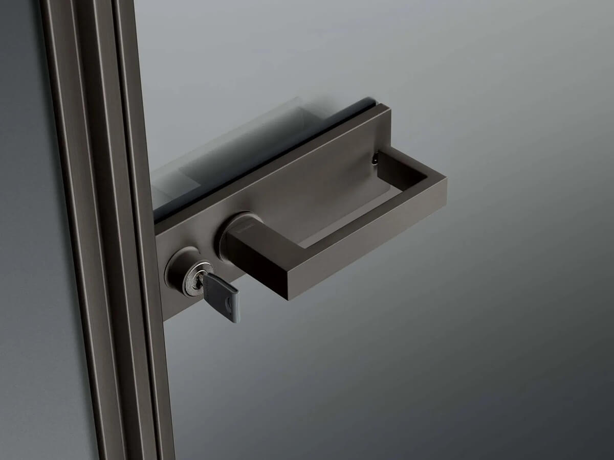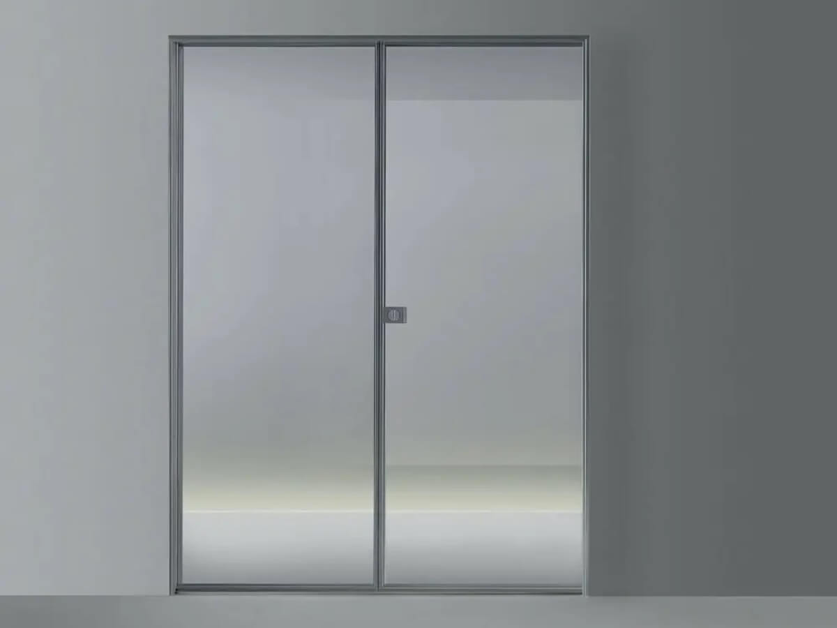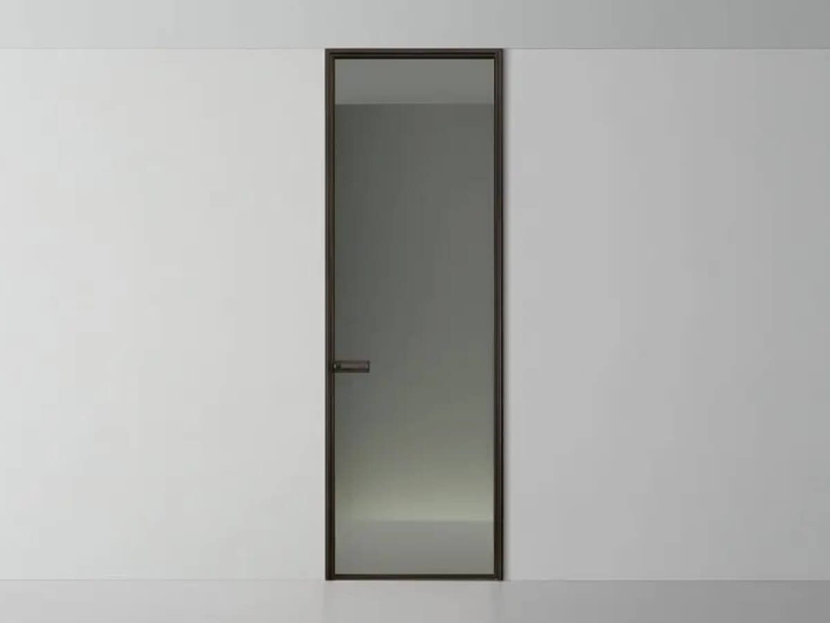 The Spin model by Rimadesio is a door with a cold and austere look, of impeccable elegance. Available in both hinged and internal sliding versions, it bases its charm on a jamb and a frame with reduced thickness but strongly marked in relief that frame the central glass panel in a rigidly geometric frame. Spin can take on a very different aesthetic depending on the finish chosen for the glass of the door panel, which can be transparent, glossy lacquered in different colors, mirrored or integrated with an internal mesh that gives it a highly refined appearance. The magnetic closure lock is an exclusive Rimadesio patent.