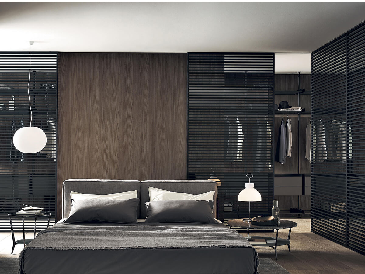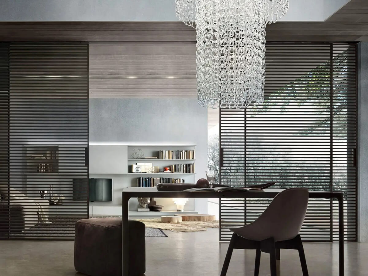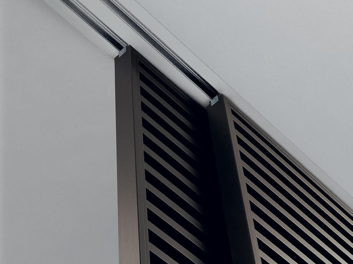 The surface of the Stripe sliding door by Rimadesio is crossed on both sides of the panels by a dense succession of thin horizontal crosspieces, thus partially obscuring the transparencies of the underlying glass. In this way, an evocative optical effect is created that allows you to only partially glimpse the environment behind the door. The strips that characterize the shapes of Stripe can be made in different metal or wooden finishes and even the glass that forms the core of the panel is available in a great variety of finishes.