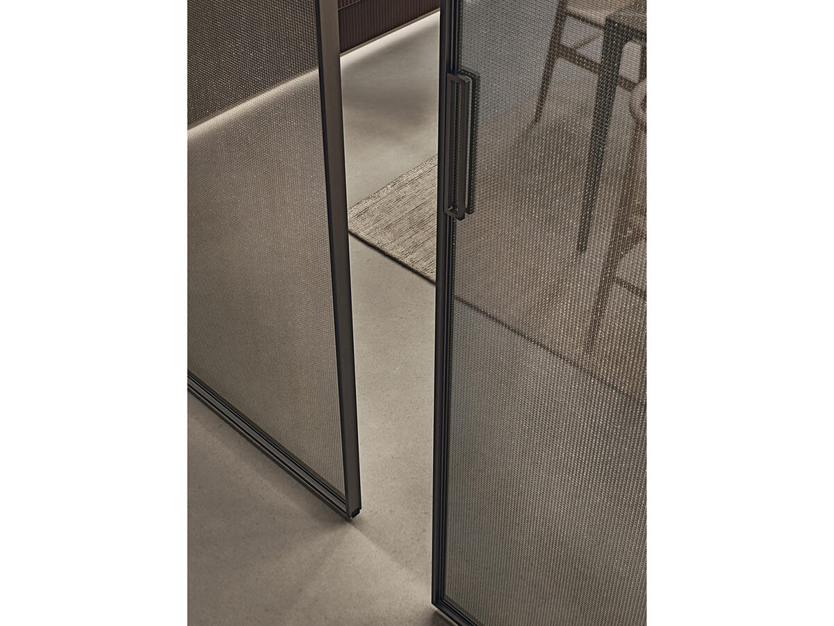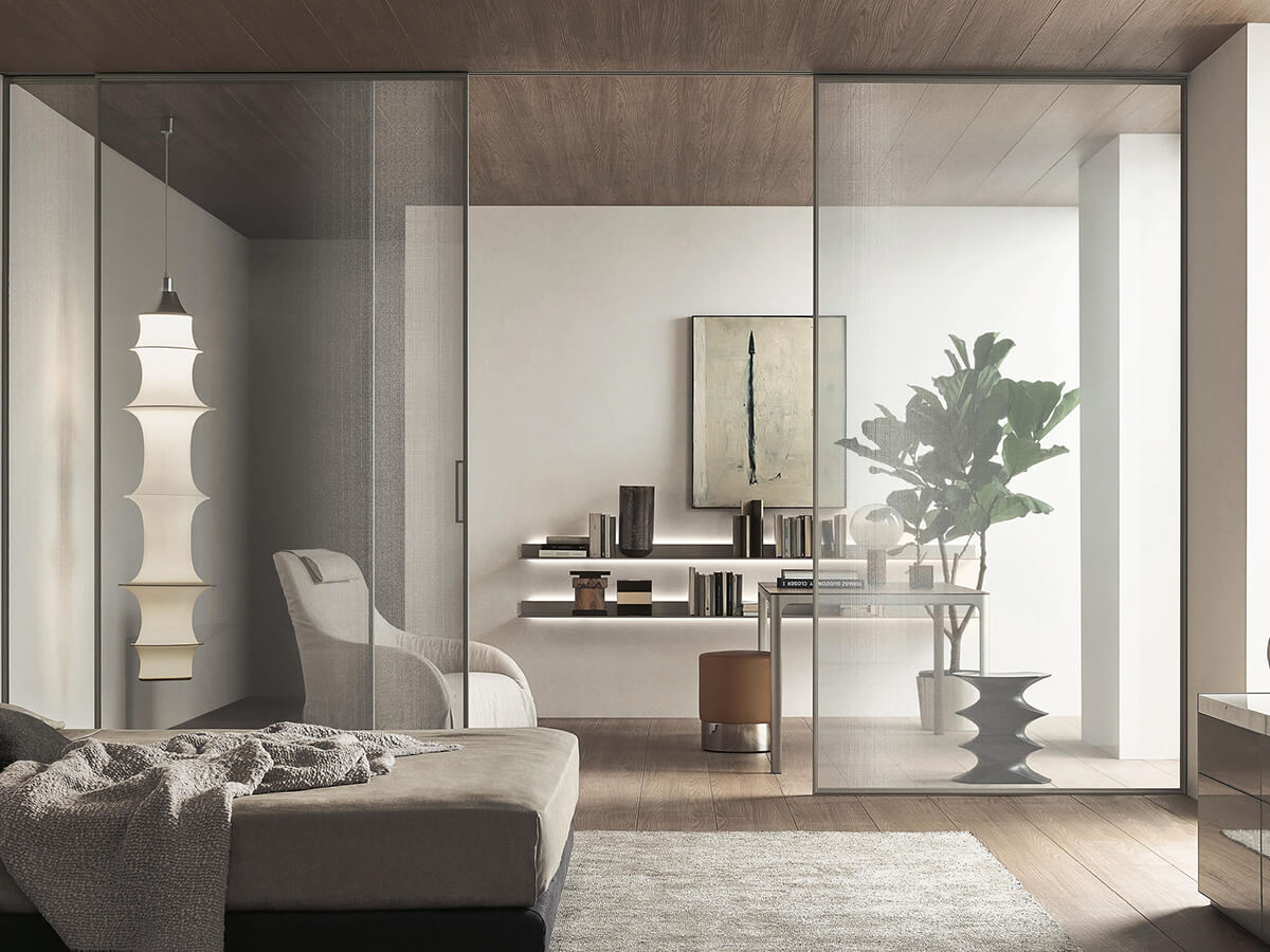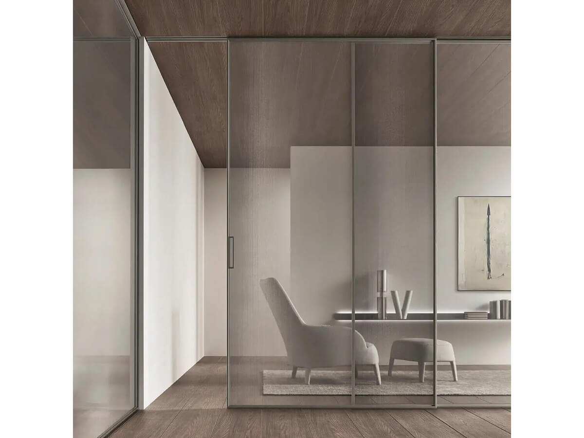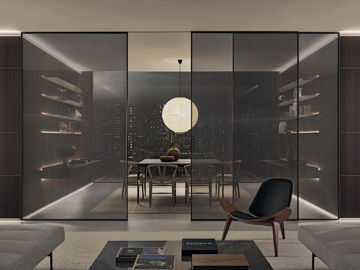The Velaria sliding door by Rimadesio bases its charm on rigor and the essentiality of the shapes. It consists of a series of panels, always made to measure, in which the thin metal perimeter frame leaves the maximum scenographic space for the finishing of the central glass. The latter can be made in an innumerable variety of finishes - transparent, bronzed, mirrored, etched, glossy and much more - thus giving the Velaria sliding door a different appearance each time depending on the project in which it will be inserted. The opening handle consists only of a slight extension of the frame along one of the sides.