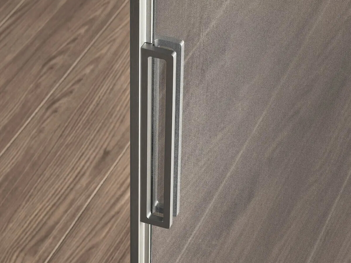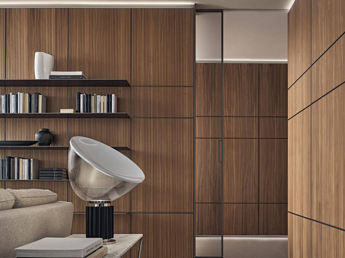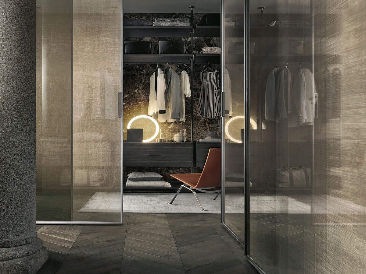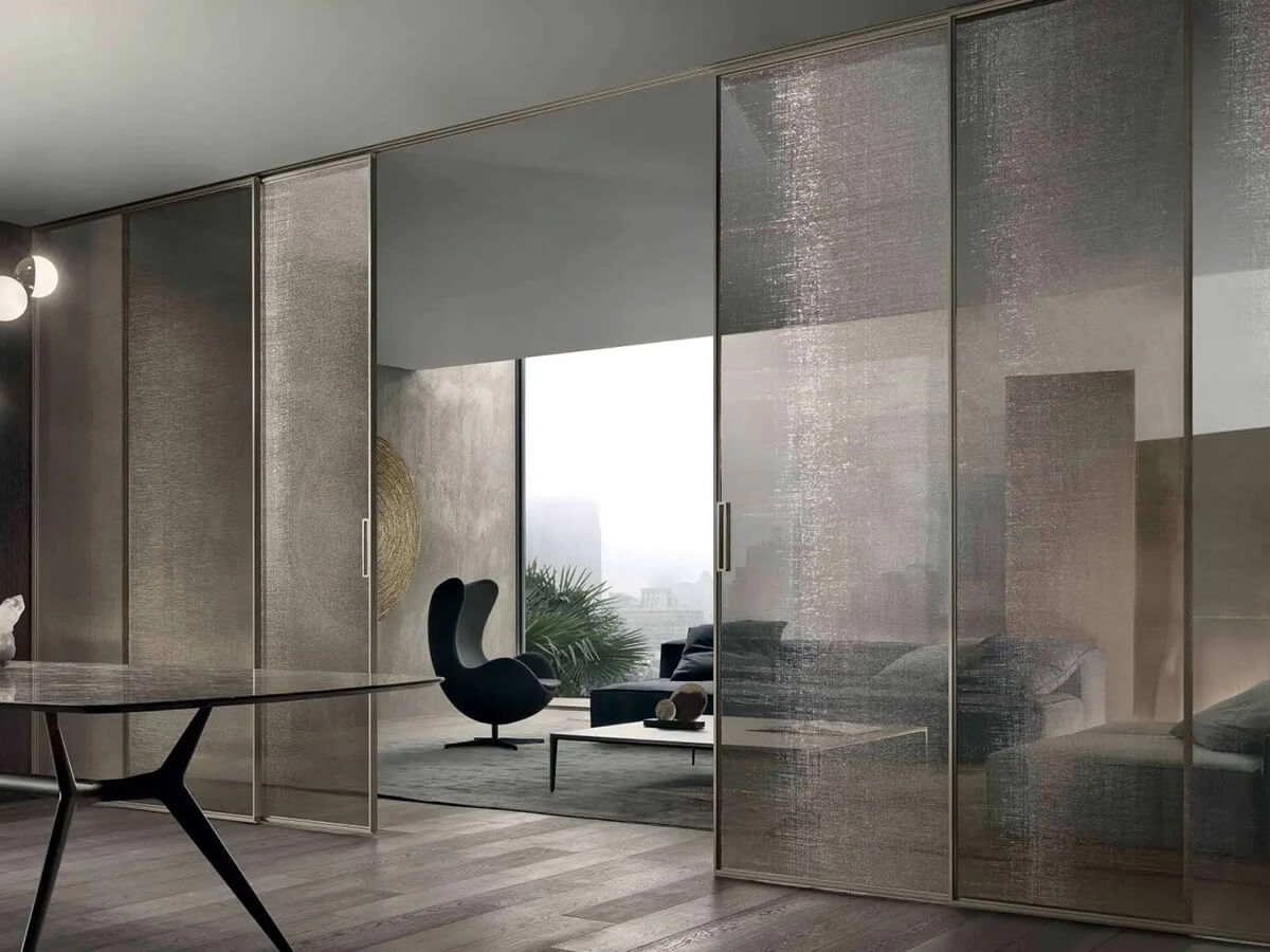 The Velaria sliding door by Rimadesio bases its charm on rigor and the essentiality of the shapes. It consists of a series of panels, always made to measure, in which the thin metal perimeter frame leaves the maximum scenographic space for the finishing of the central glass. The latter can be made in an innumerable variety of finishes - transparent, bronzed, mirrored, etched, glossy and much more - thus giving the Velaria sliding door a different appearance each time depending on the project in which it will be inserted. The opening handle consists only of a slight extension of the frame along one of the sides.