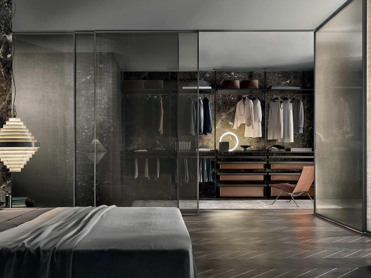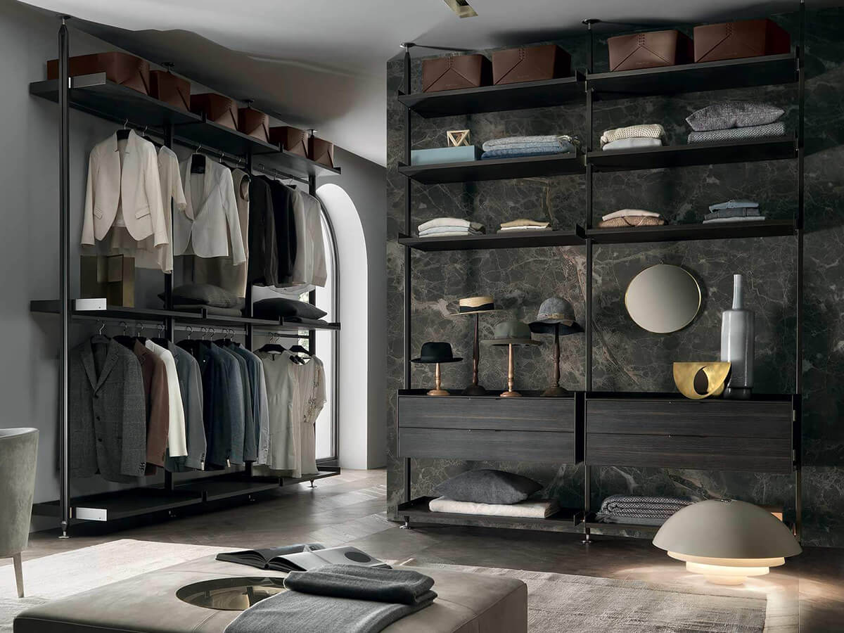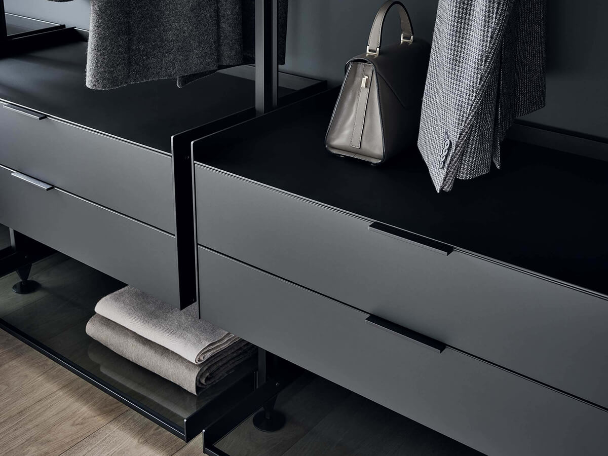 The Zenit walk-in closet by Rimadesio is a proposal in the name of rigor and lightness for setting up the sleeping area. The protagonists of the composition are the custom-made uprights, which go from the floor to the ceiling and allow a free arrangement of the equipment attached to them. The look is extremely technical, almost post-industrial, exploiting and emphasizing the functional elements for expressive purposes.Zenit takes on a radically different character depending on the finishes chosen for the equipment: the melamine version (coal larch, gray oak or elm) warmer and more natural, the option with glass shelves and drawers in glossy lacquered glass colder and more technical. or opaque, in the wide range of Rimadesio's exclusive Ecolorsystem colors.