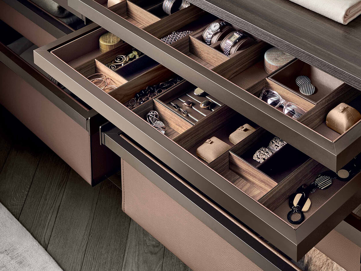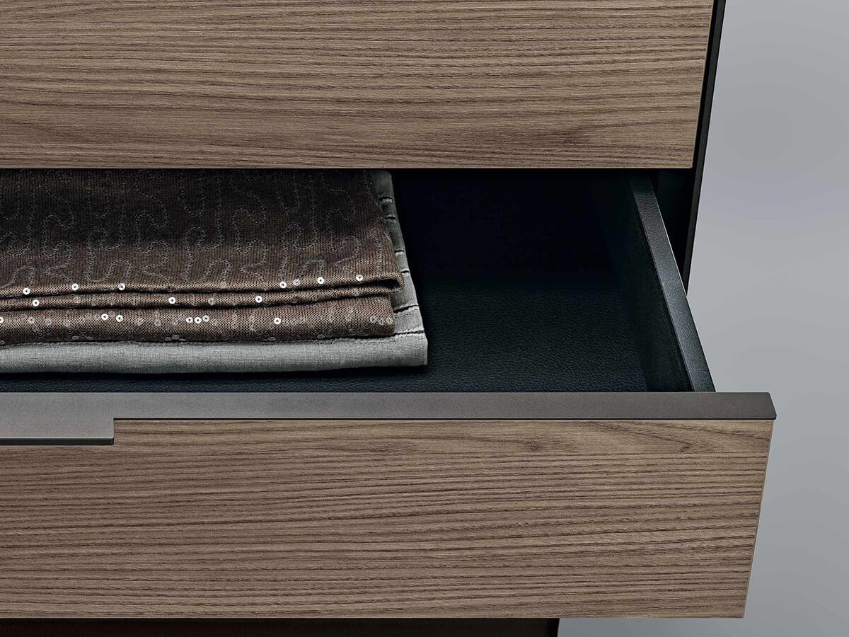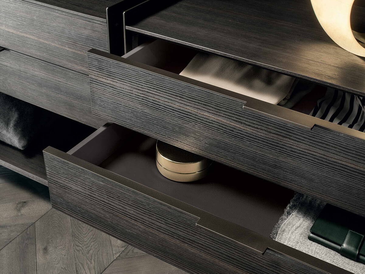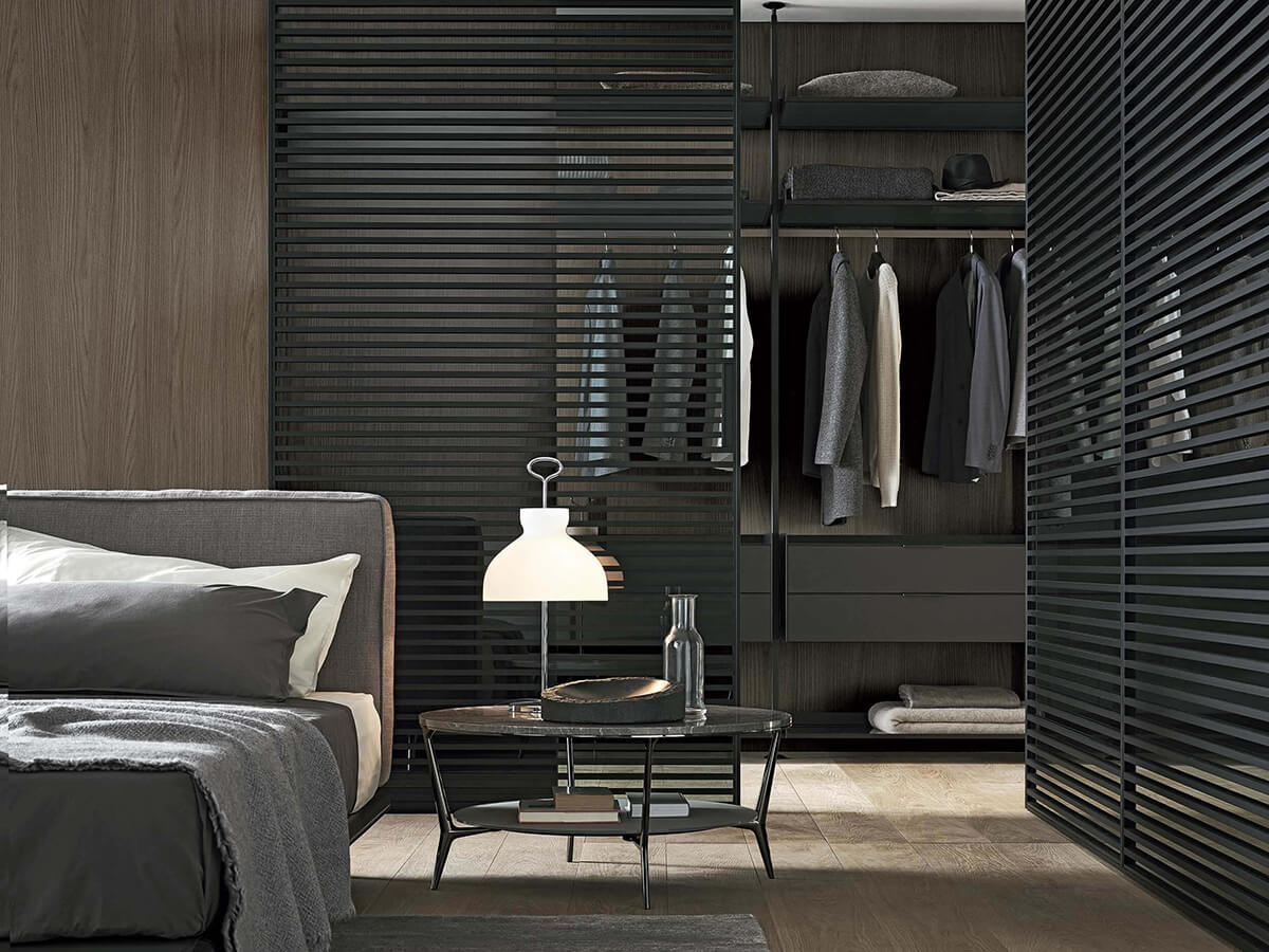 The Zenit walk-in closet by Rimadesio is a proposal in the name of rigor and lightness for setting up the sleeping area. The protagonists of the composition are the custom-made uprights, which go from the floor to the ceiling and allow a free arrangement of the equipment attached to them. The look is extremely technical, almost post-industrial, exploiting and emphasizing the functional elements for expressive purposes.Zenit takes on a radically different character depending on the finishes chosen for the equipment: the melamine version (coal larch, gray oak or elm) warmer and more natural, the option with glass shelves and drawers in glossy lacquered glass colder and more technical. or opaque, in the wide range of Rimadesio's exclusive Ecolorsystem colors.