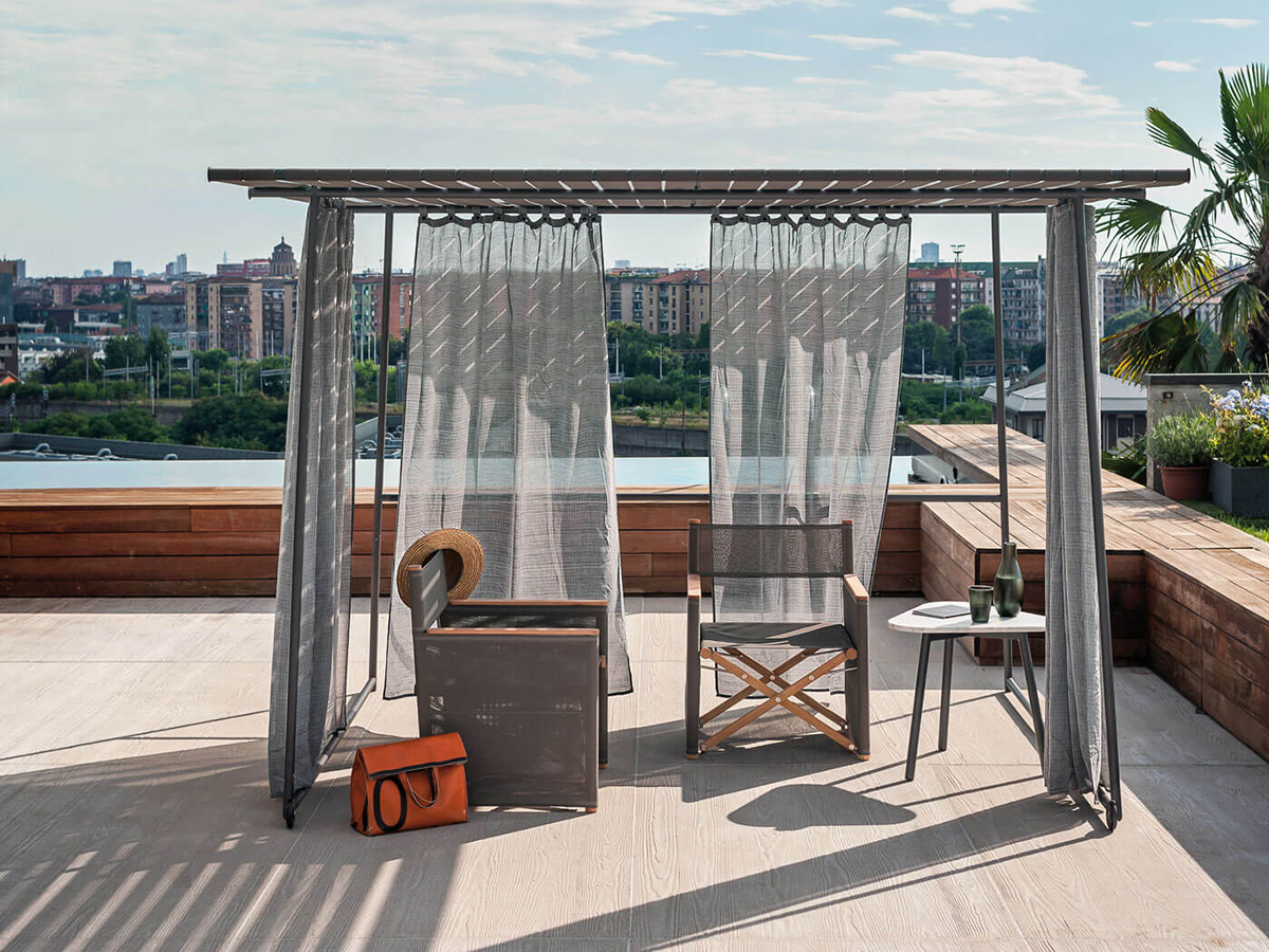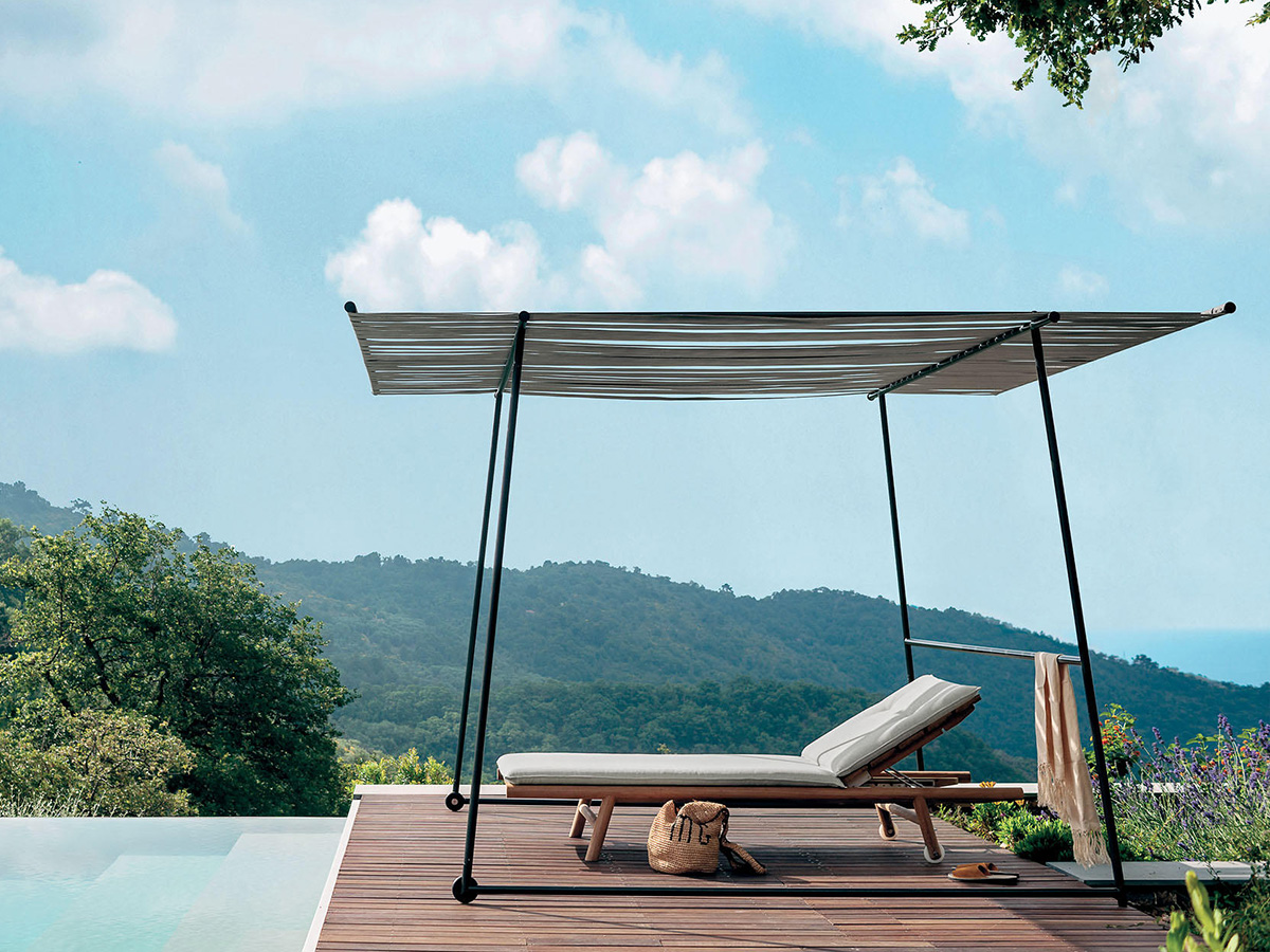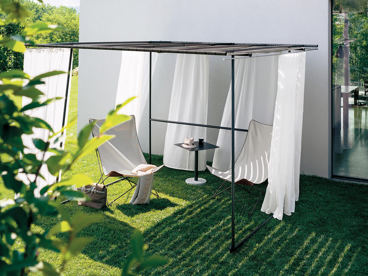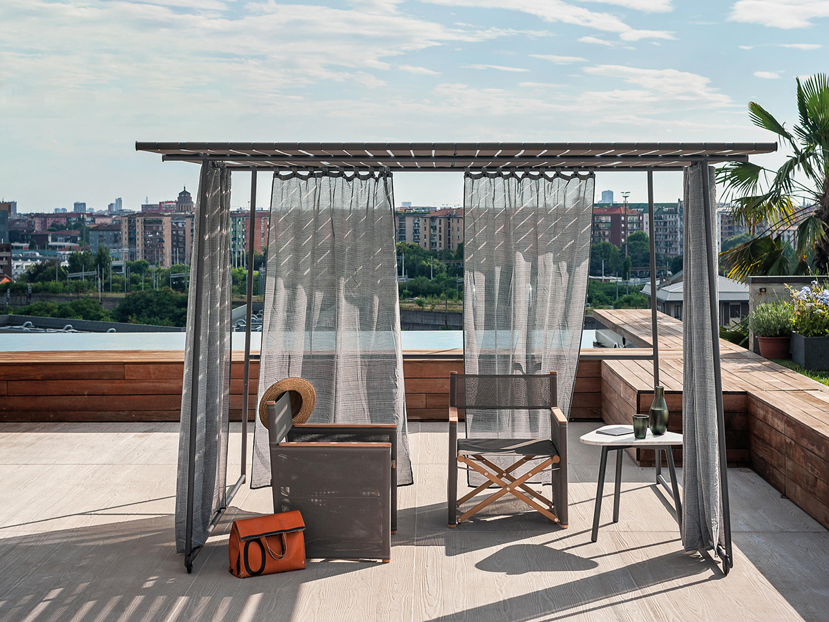 Among Roda several collections designed for all those who like to spend their time outdoors and relax thanks to resistant and comfortable furniture, you can find Ombrina, a steel gazebo that fits well on terraces or poolside spaces, as well as in the garden home. It consists of a horizontal roof that breaks up and softens the light to which a slender and transparent scaffolding is added that defines the very nature of the place. The soul of Ombrina is clearly Mediterranean due to its naturalness and the strong artisan flavor it emanates. Interesting are the wheels located at the base that allow you to move this piece of furniture freely, without particular difficulties.