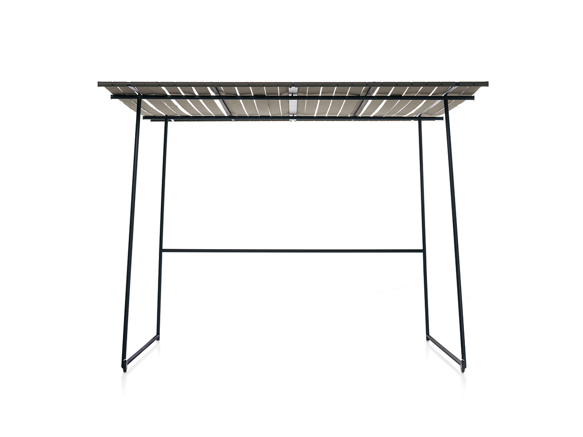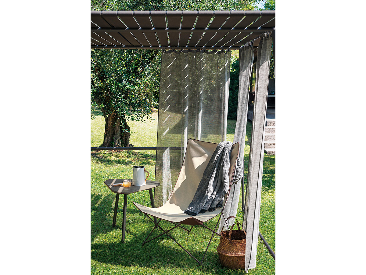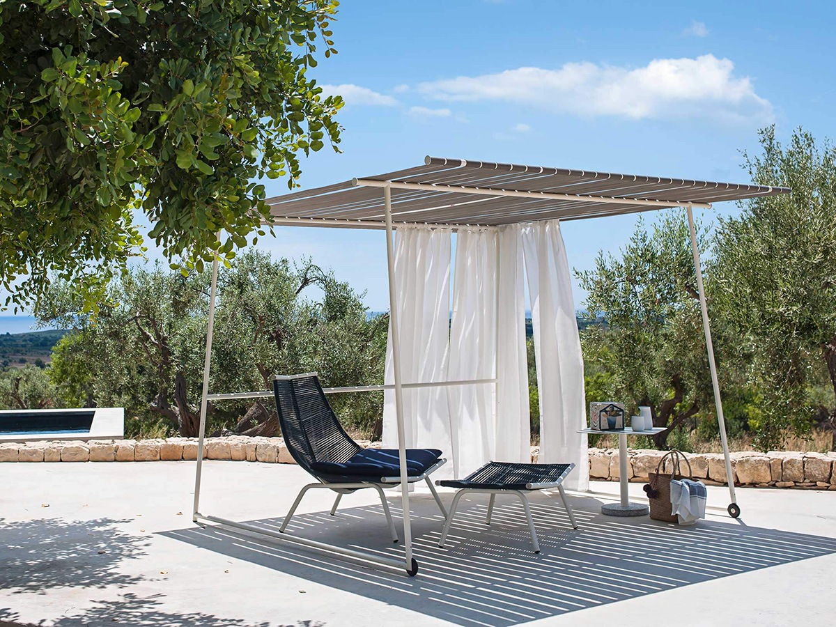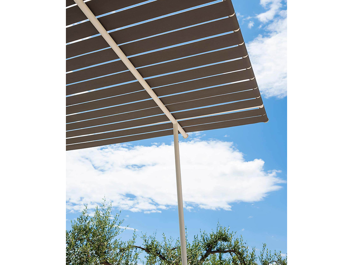 Among Roda several collections designed for all those who like to spend their time outdoors and relax thanks to resistant and comfortable furniture, you can find Ombrina, a steel gazebo that fits well on terraces or poolside spaces, as well as in the garden home. It consists of a horizontal roof that breaks up and softens the light to which a slender and transparent scaffolding is added that defines the very nature of the place. The soul of Ombrina is clearly Mediterranean due to its naturalness and the strong artisan flavor it emanates. Interesting are the wheels located at the base that allow you to move this piece of furniture freely, without particular difficulties.