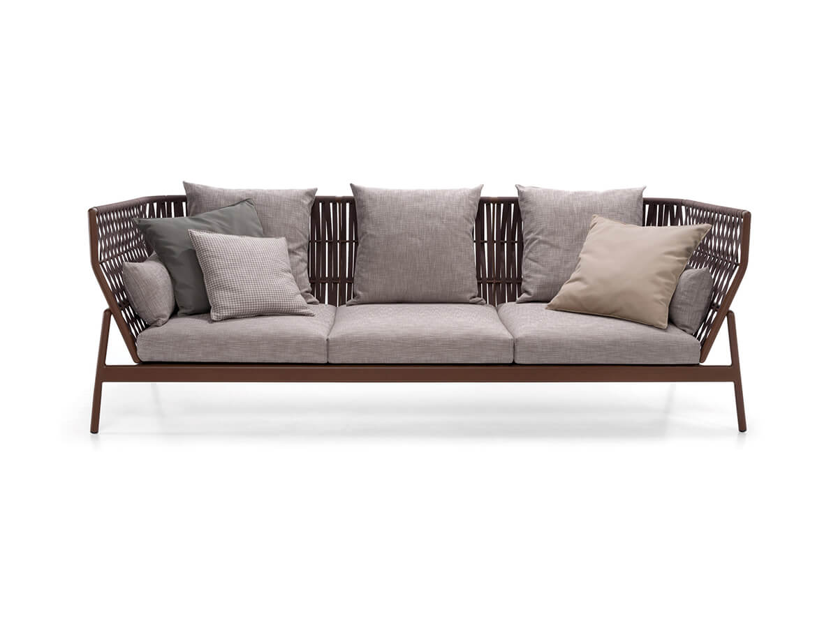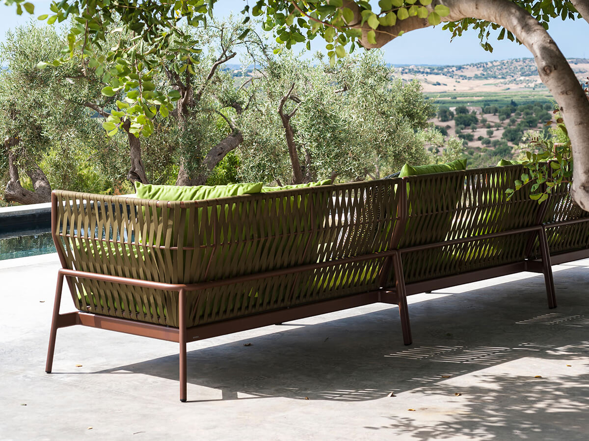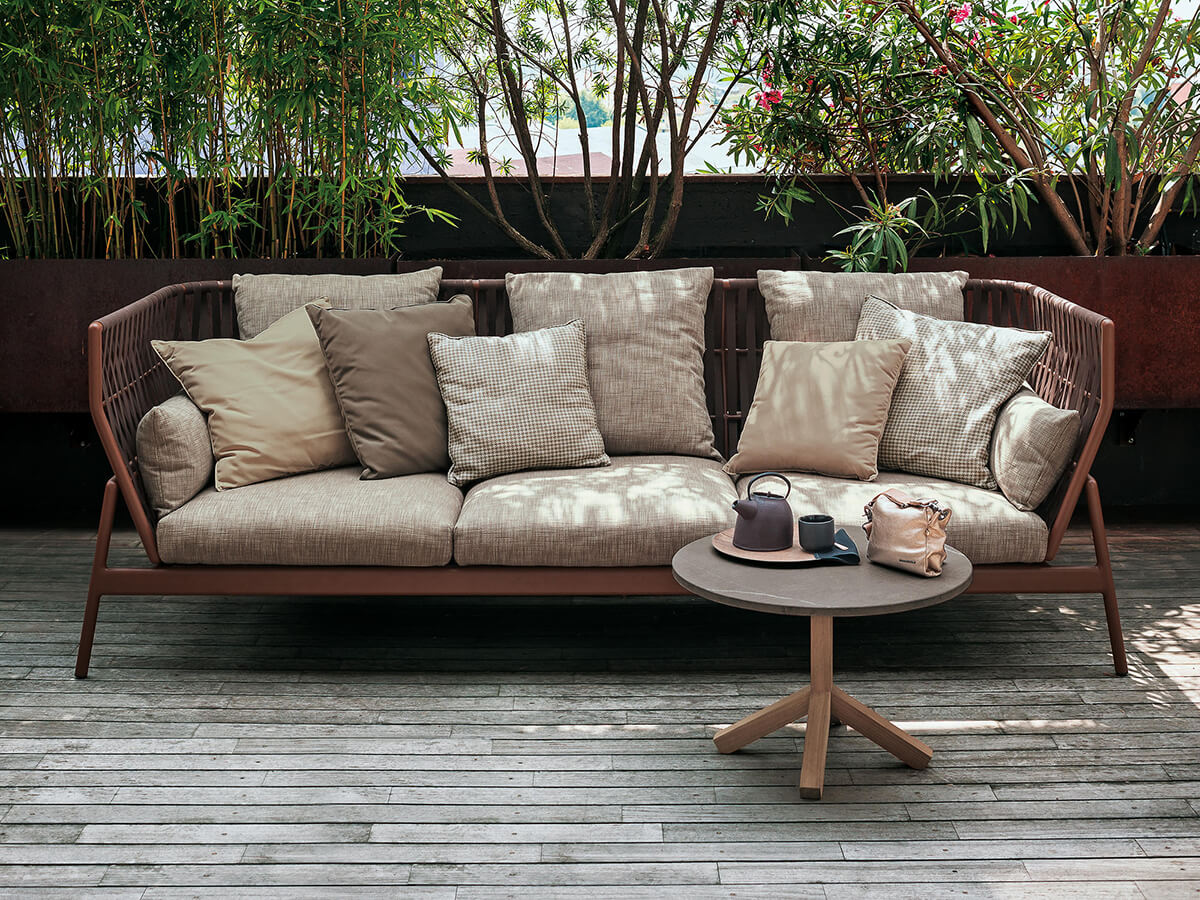 An outdoor sofa with a strong personality combined with careful attention to materials and harmonies. From the hand of Roberto Dordoni, Piper stands out for its low backrest and for the use of double material and batyline cloth. Piper is included in the Roda catalog as a new seat, structured to withstand the passing of time and prolonged use. In any context, such as a balcony, terrace, garden or more, it manages to create extremely personal atmospheres. The structure of the sofa, linear and rigorous, is combined with the studied softness of the cushions with a flavor and lines that can vary according to the customer's choice.
