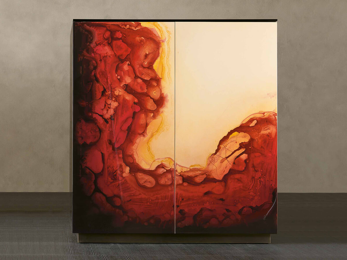 Straddling a work of art and a design object, the Atlanta sideboard expresses Rugiano's desire to be daring, challenging conventions to land in an unknown terrain where freedom of expression reigns. Formed by four doors in leather or painted, Atlanta can be distinguished by the glossy lacquered structure which gives it an elegant and extremely refined air. The drawing in the foreground stands out for the chromatic choice and compositional finesse aimed at enhancing the natural expressions of the wood but also teasing the imagination, giving life to unique landscapes and backgrounds. Ideal for those who want to offer a compositional cue to the living area, it can also be adapted to more intimate contexts such as the bedroom or a study.
