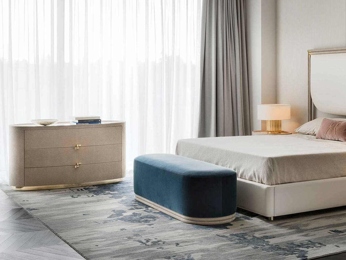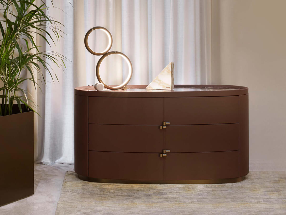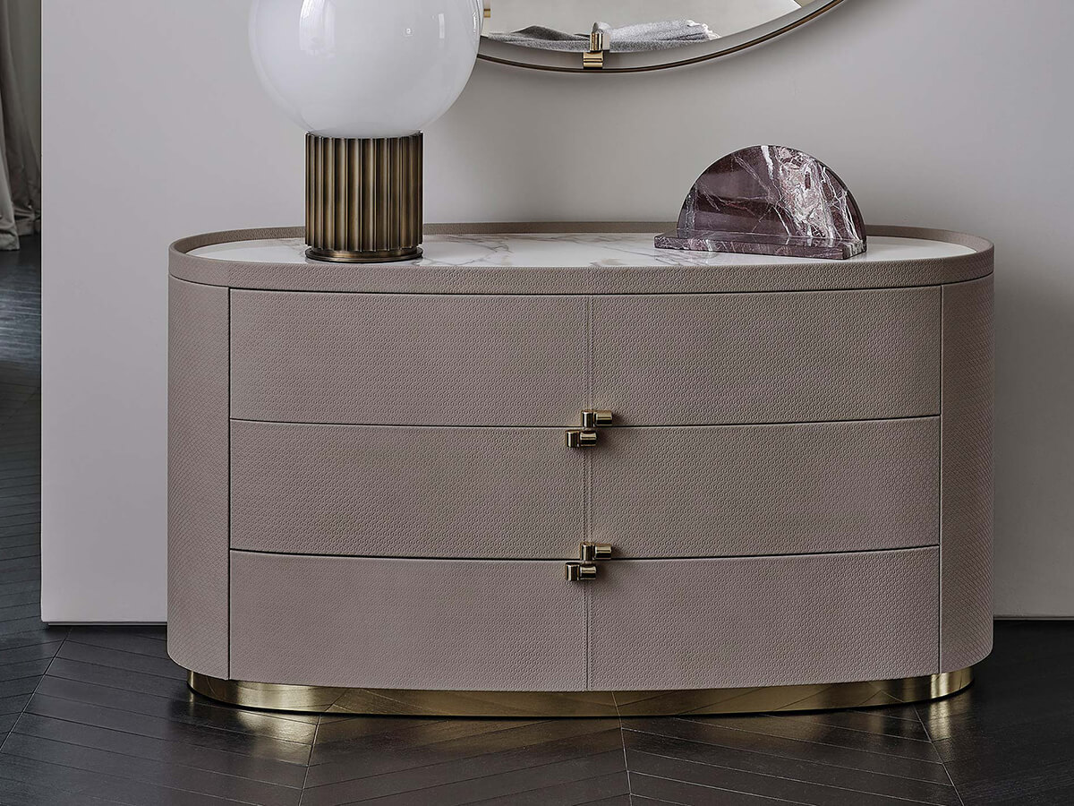 An indispensable piece of furniture for the home but above all for the bedroom where there is often the need to store clothing and numerous small objects necessary for our private life. Boheme is an elegant chest of drawers, finely designed to enhance the refinement of the rounded and modulated shapes, rounded off in order not to create roughness and angular details. The upholstery can be in leather and the top in marble with numerous details in polished brass that embellish the structure as a whole. Precisely thanks to its refined construction, Boheme fits well in refined environments, where the need for a prominent note is felt.