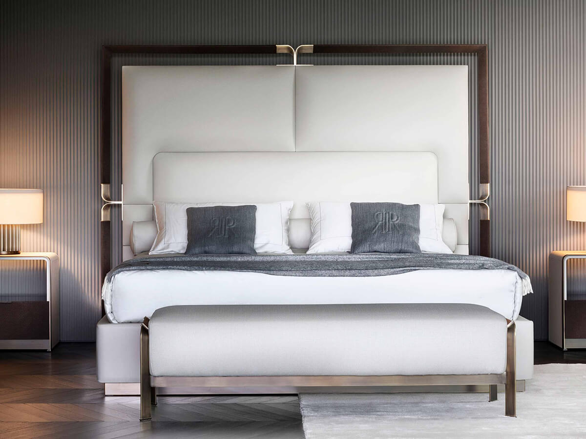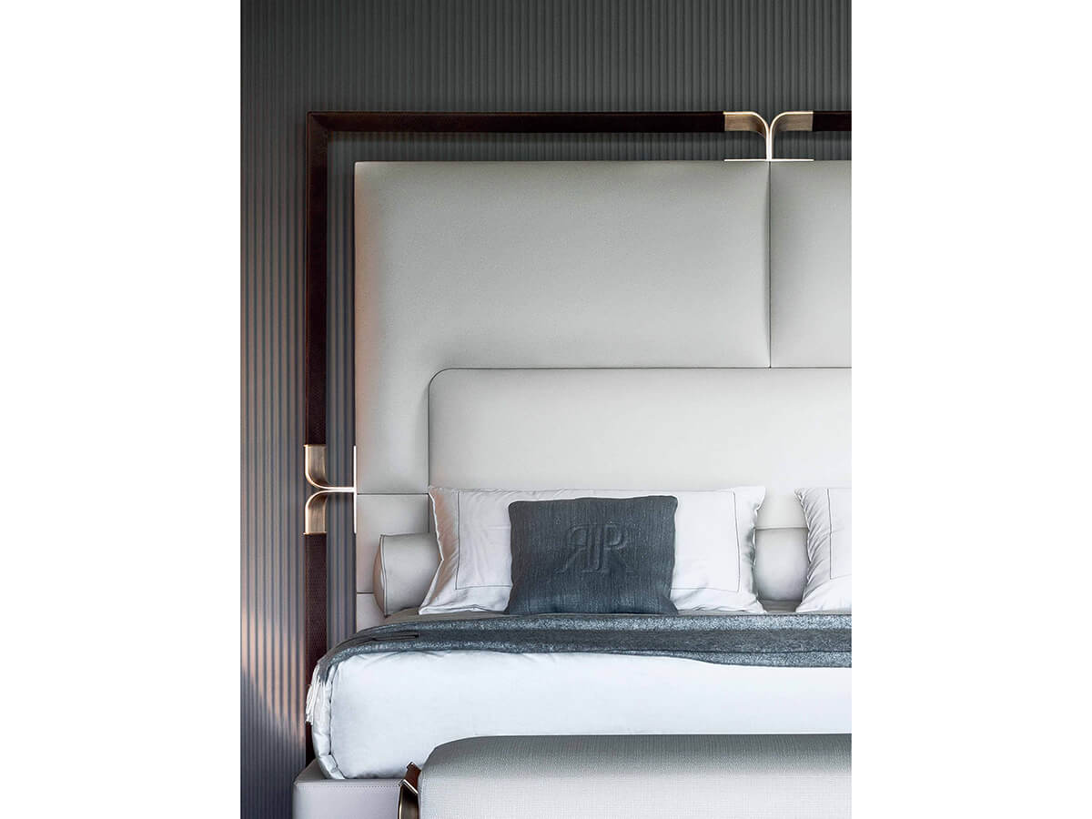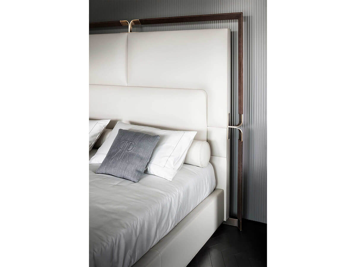 An important bed, which makes the evidence its greatest suggestion. Strong and compact, Grace stands out for its padded headboard with a metal frame upholstered in smooth or printed leather. The details along the frame are in bronze. The bed frame is upholstered to make the entire structure more comfortable and welcoming. The details of Grace abound, helping to make it an optimal and decidedly sought-after choice for anyone who is not afraid to follow their own taste. The proposal is completed by a chest of drawers and some bedside tables, the ideal culmination of the sleeping area.