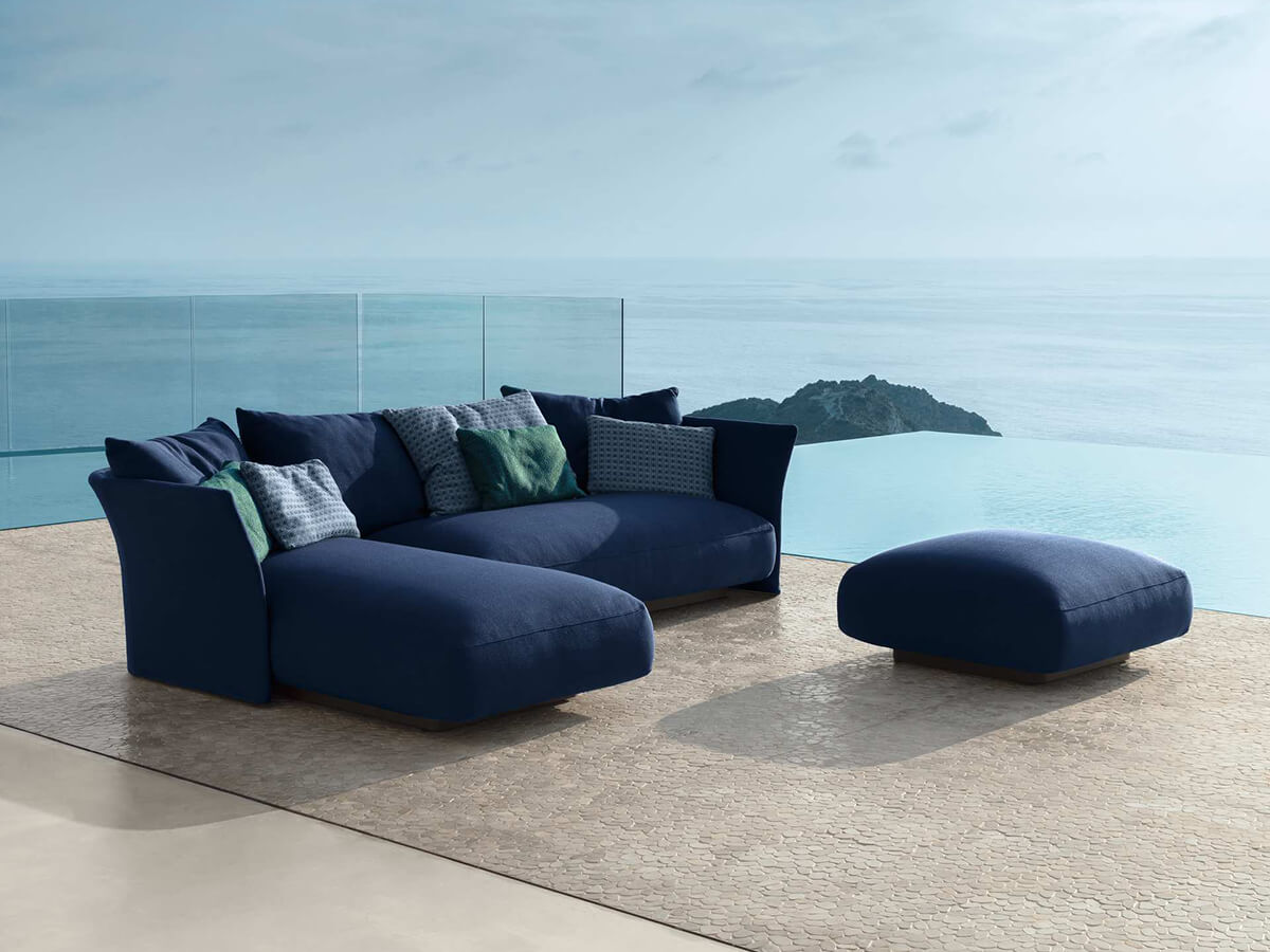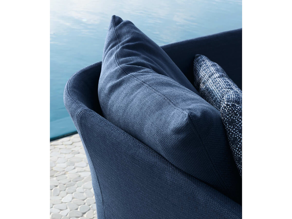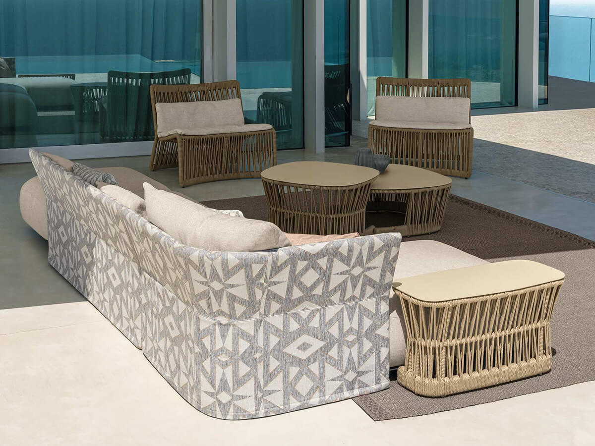 Cliff is a modular sofa belonging to the homonymous collection by Talenti. There are numerous combinations and shapes that can be adopted for this upholstery in order to create the composition that best matches the taste and needs of the environment in which it will be placed. There are also numerous materials of this sofa, aimed at increasing the customization of each piece. The modules in the woven rope version have a metal tubular structure, painted in the same color as the fabric of the cushions and rope. In the fabric elements, the aluminum-based structure is instead hidden.