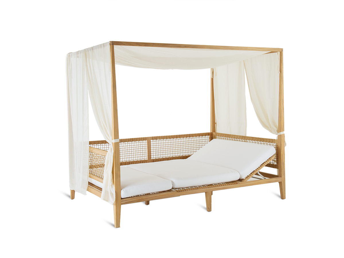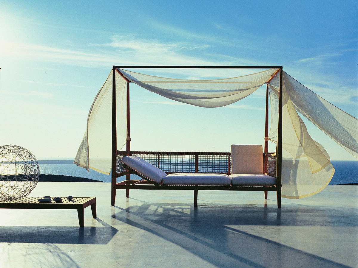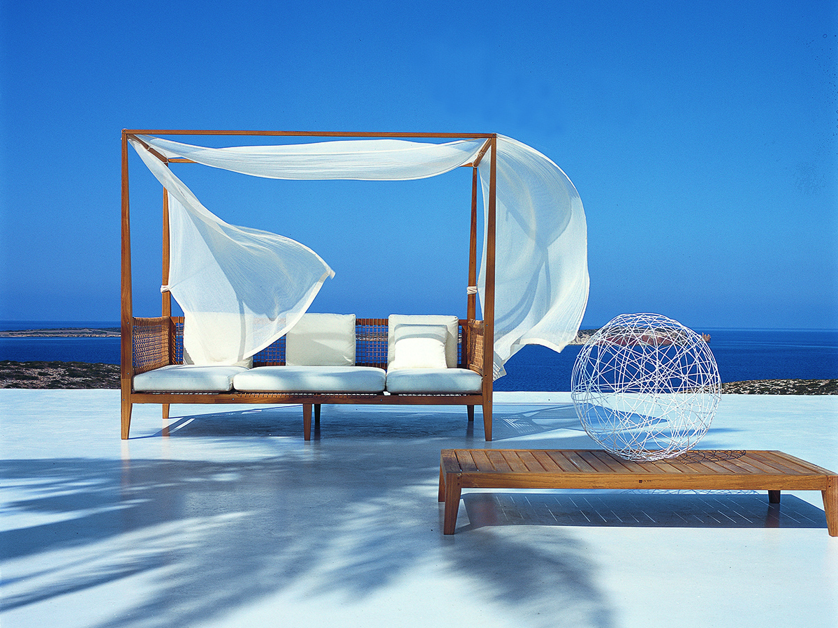 Elegant and structured, the Alcova Synthesis sofa represents an indispensable element for those who love the outdoors and above all enjoy life sheltered from the most violent rays of the sun. Its teak structure is light and pleasing to the eye, as well as particularly usable in various outdoor environments. Alcova has an adjustable top on both sides and is complete with raw white curtains with removable seat cushions. The structure is made of hand-woven synthetic fibre, for a natural look and resistant to atmospheric agents.