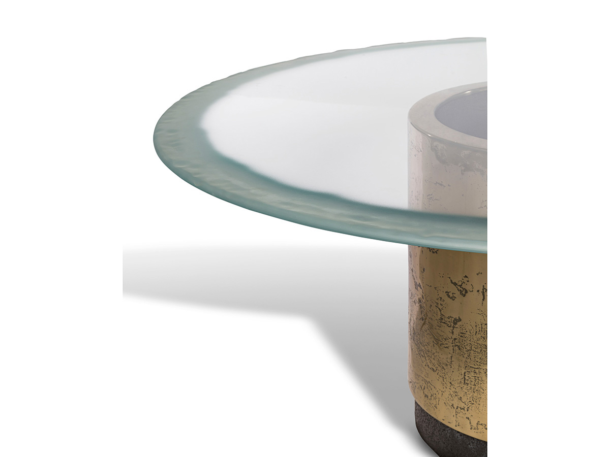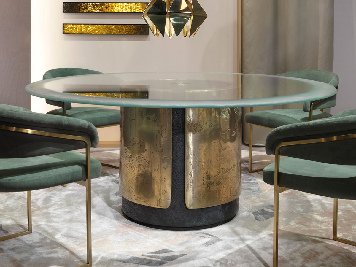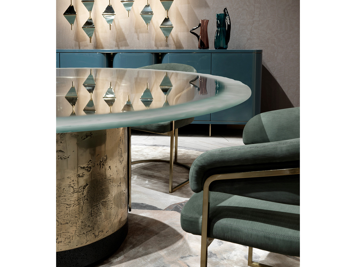 An unconventional dining table certainly outside the box, whose structure seems designed to catalyze attention by offering a stylish alternative to living spaces and above all to the convivial area for lunch or dinner. Amos has a main structure in concrete finished with black wax and gold lacquered aluminum fusion. The circular top is in frosted extra-clear glass, sandblasted by hand to guarantee a perfect result. The beauty of Amos consists in knowing how to combine different materials and materials into a whole of extreme elegance and sophisticated finesse.