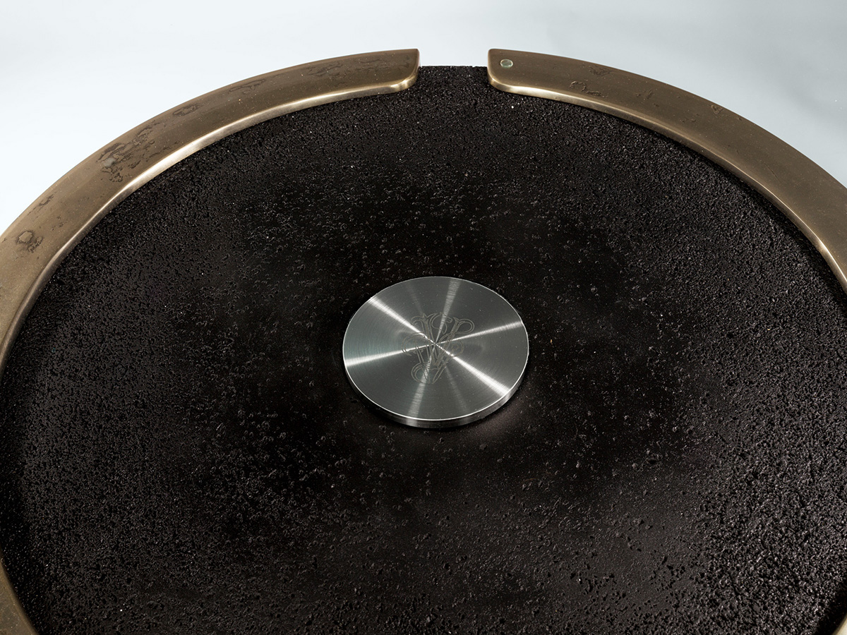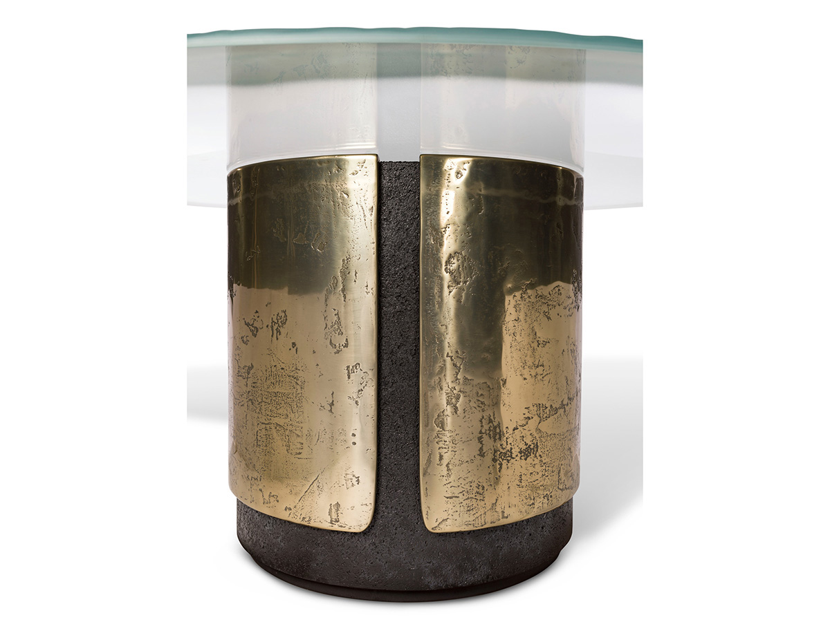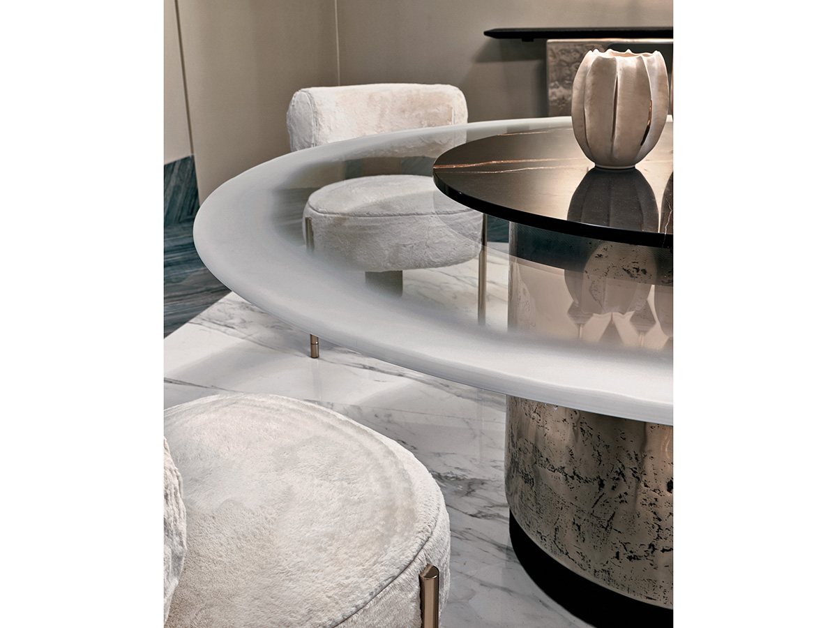 An unconventional dining table certainly outside the box, whose structure seems designed to catalyze attention by offering a stylish alternative to living spaces and above all to the convivial area for lunch or dinner. Amos has a main structure in concrete finished with black wax and gold lacquered aluminum fusion. The circular top is in frosted extra-clear glass, sandblasted by hand to guarantee a perfect result. The beauty of Amos consists in knowing how to combine different materials and materials into a whole of extreme elegance and sophisticated finesse.