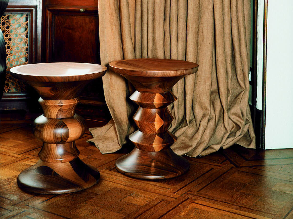 Elegance and simplicity combined in a piece of furniture with an exquisitely retro flavor. In 1950 Charles & Eames were commissioned by Time Inc. to furnish the interiors of their three lobbies at the Rockefeller in New York. For this commission, the two designers created the famous Lobby Chairs and a series of walnut stools. Stools was born right here, from a lathe process that guarantees solidity and lightness. The conformation adopted allows these models to also be used as side tables. In the different versions available, it is possible to appreciate the many conformations meticulously studied and artfully made to guarantee a variety of choices.