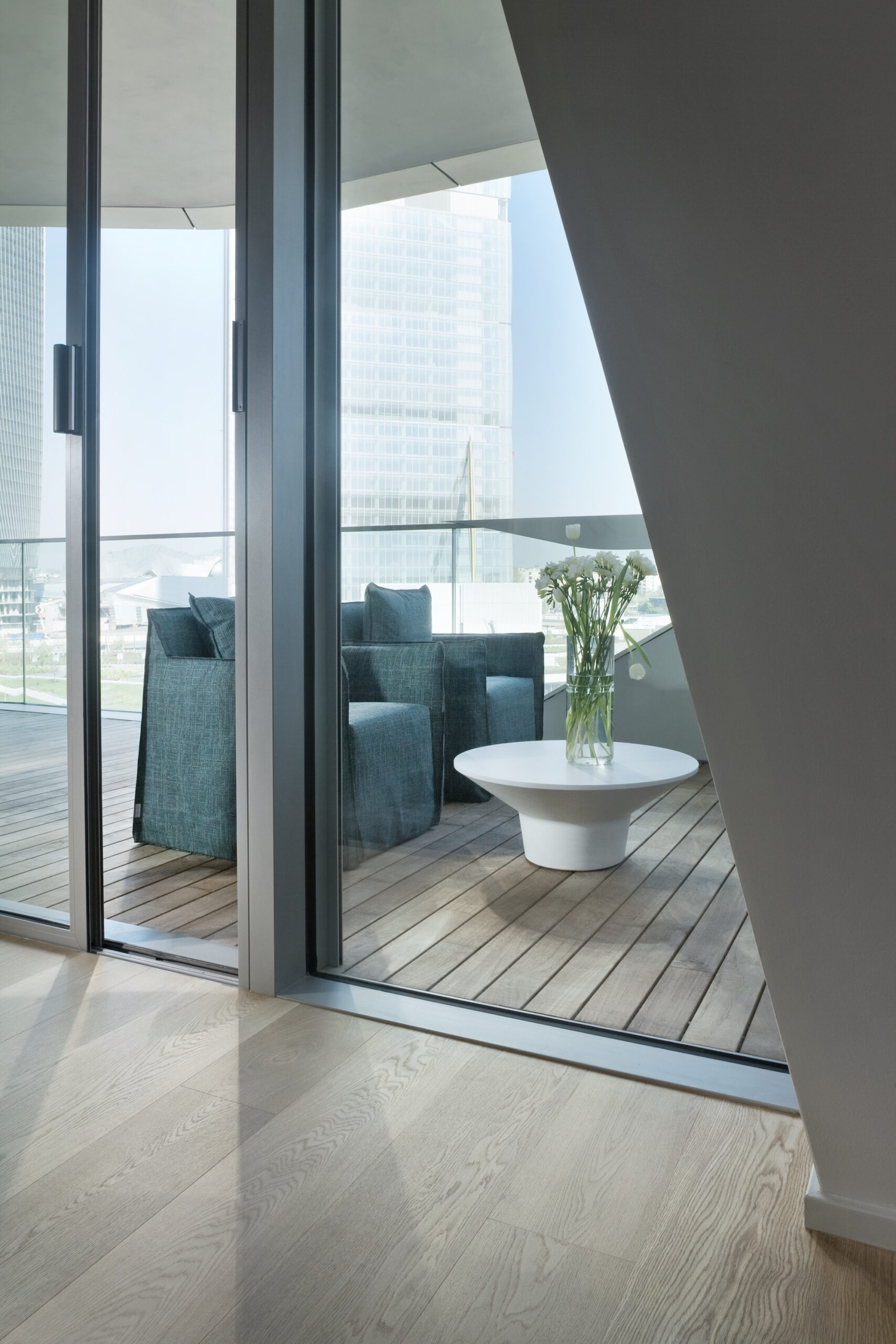 The guest bathroom and the terrace complete the project. In the first, the choice of furnishing elements by antoniolupi is a tribute to Hadid’s lines. The second is instead refined by B&B Outdoor tables and Gervasoni armchairs whose palettes refer to indoor shades.