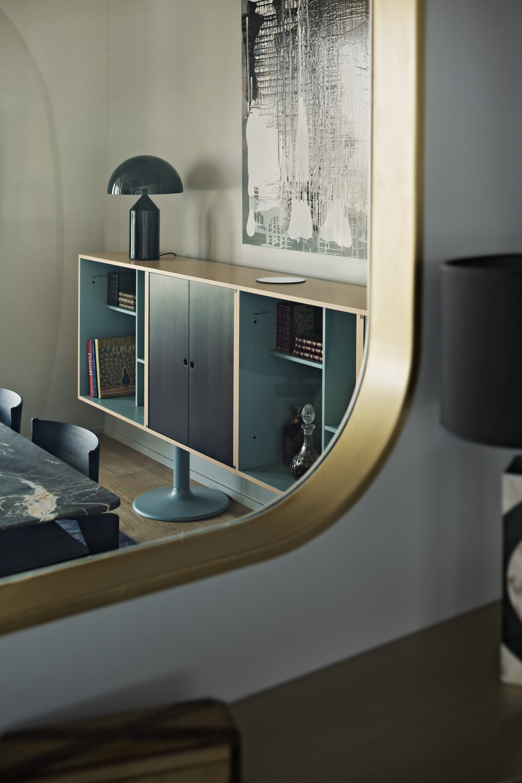 A passing living room hosts Maxalto armchairs and sofas nearby Baxter Made in Italy coffee tables. The blue and light blue shades characterize this space where large oval mirrors facing the neighboring buildings bring together the inside and the outside in a game of breathless reflections. A custom-made bookcase and Flos floor lamps complete this highly suggestive corner, full of aesthetic and design references.
