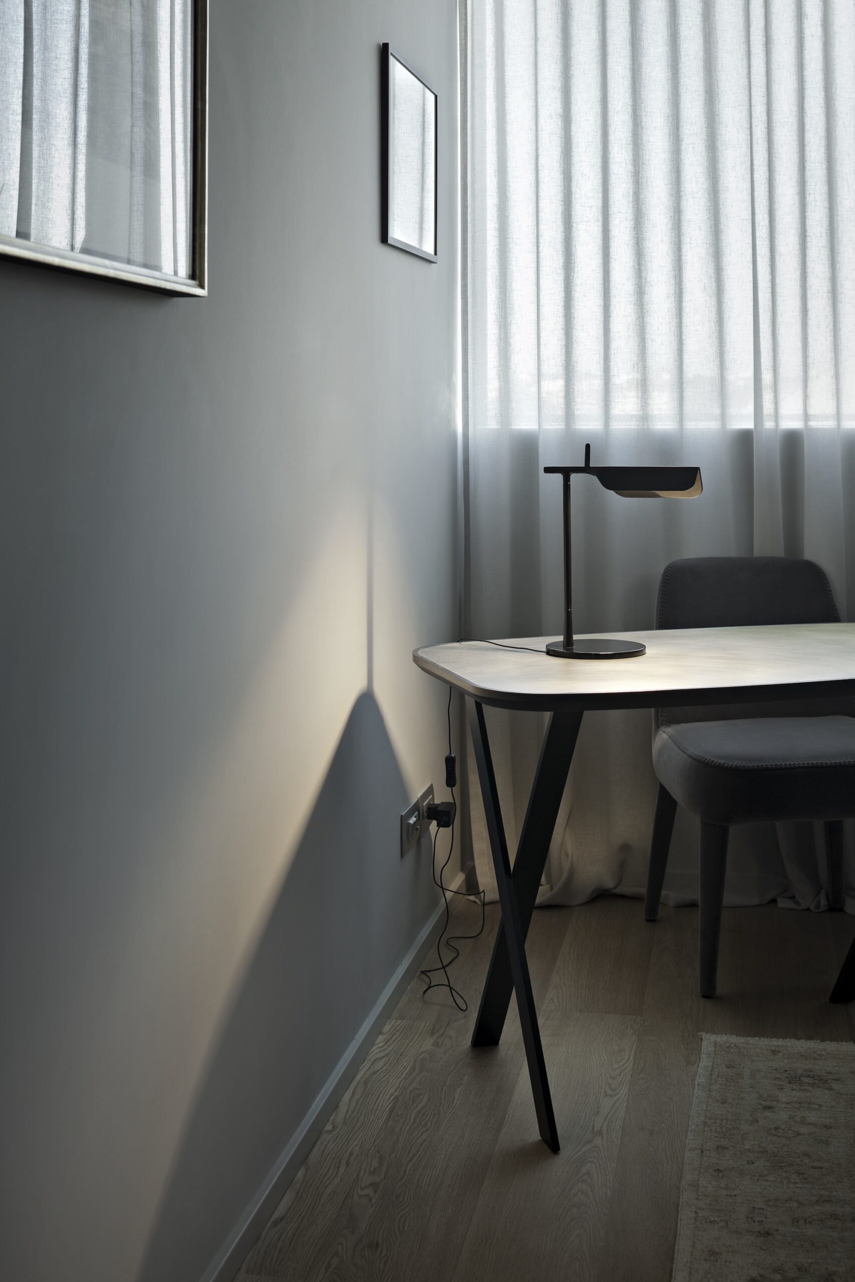 The same palette of colors tending to blue guides the eye towards the spaces reserved for the relax, consisting of a large master bedroom and a small bedroom. Among the precious furnishing choices there are the Molteni & C armchairs, Baxter Made in Italy coffee tables and Vitra chairs. Among the furnishing reserved for the home office space, the Meridiani desk stands out.
