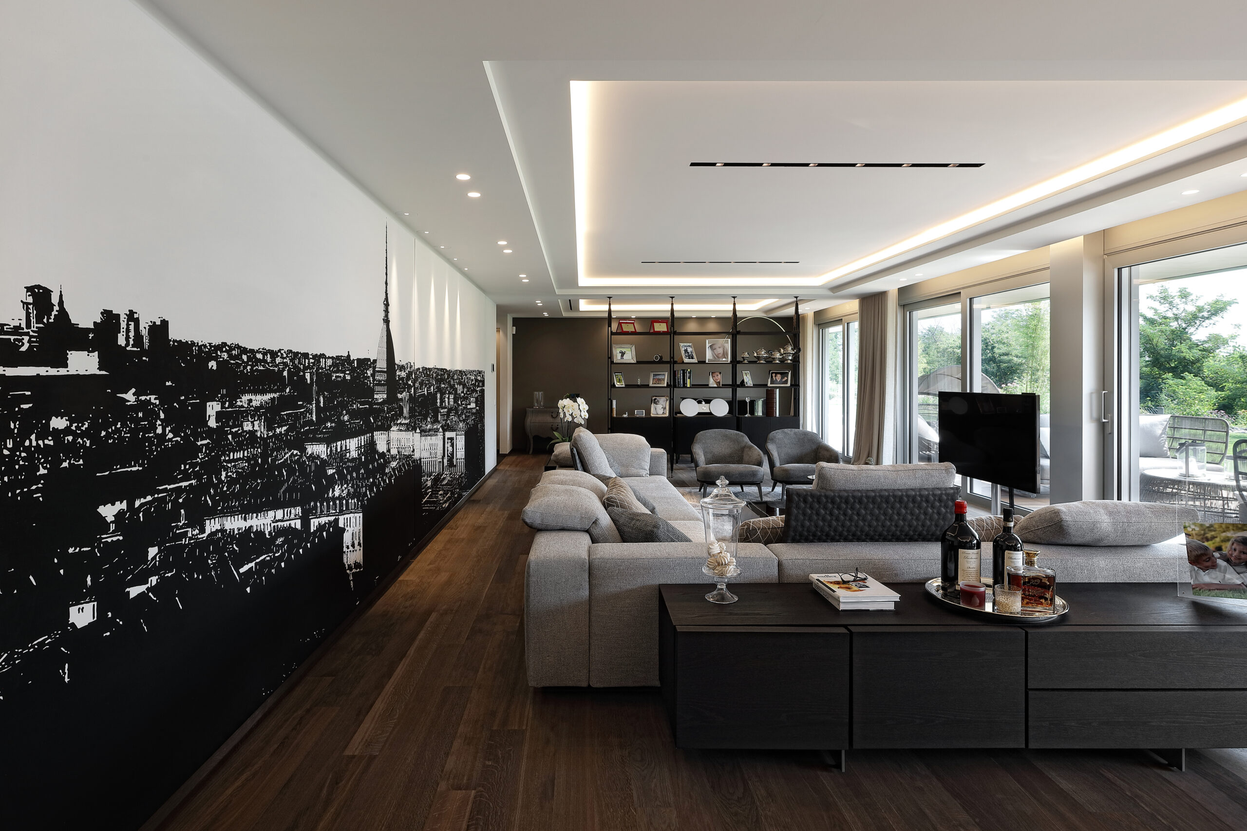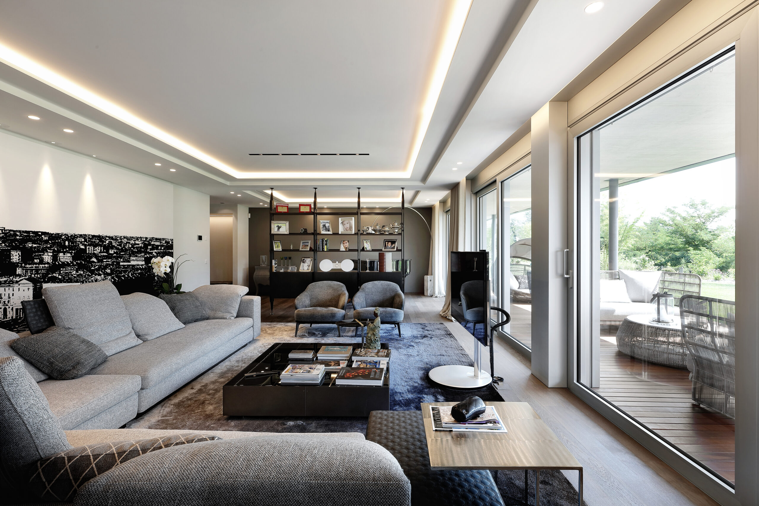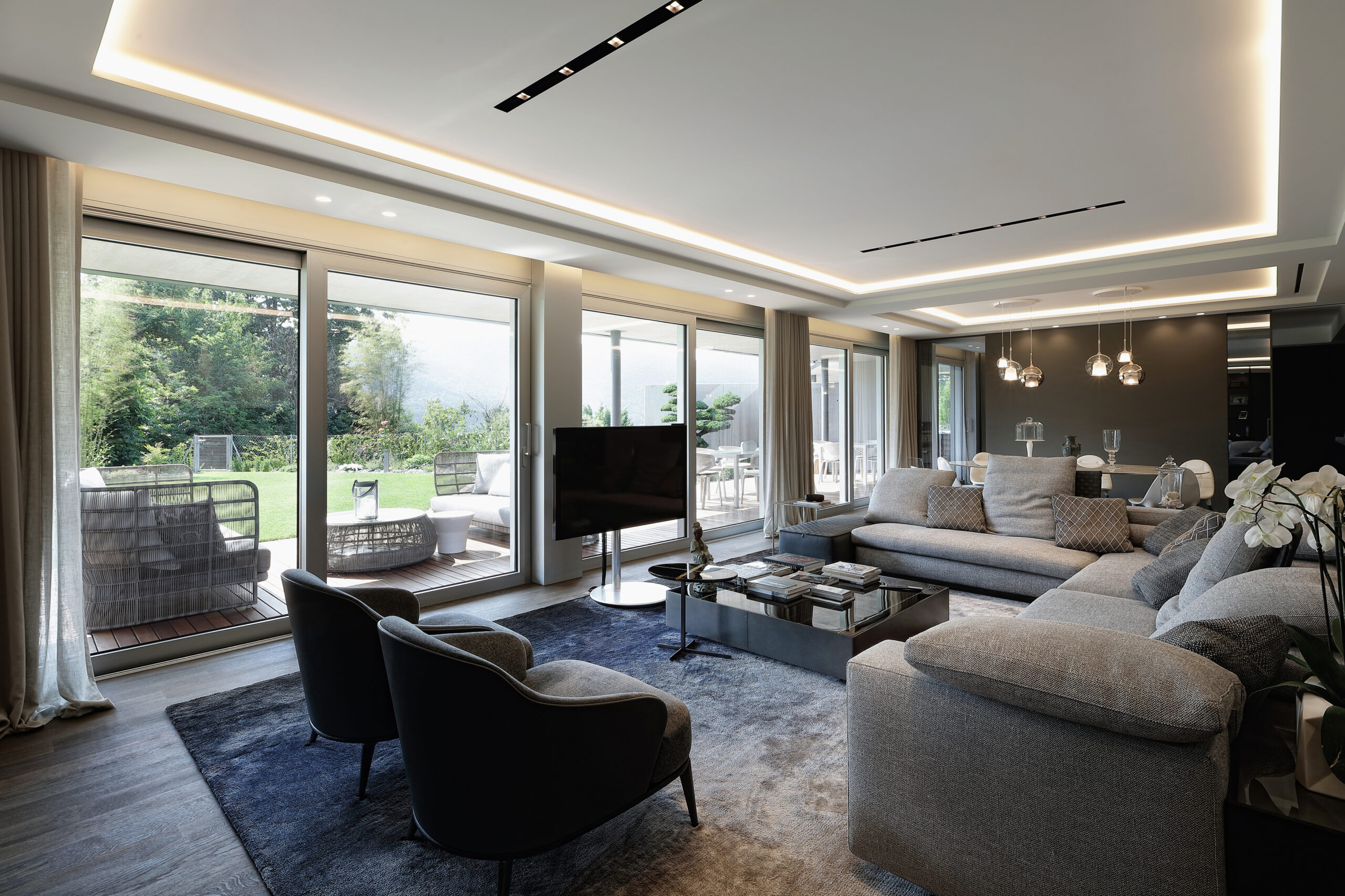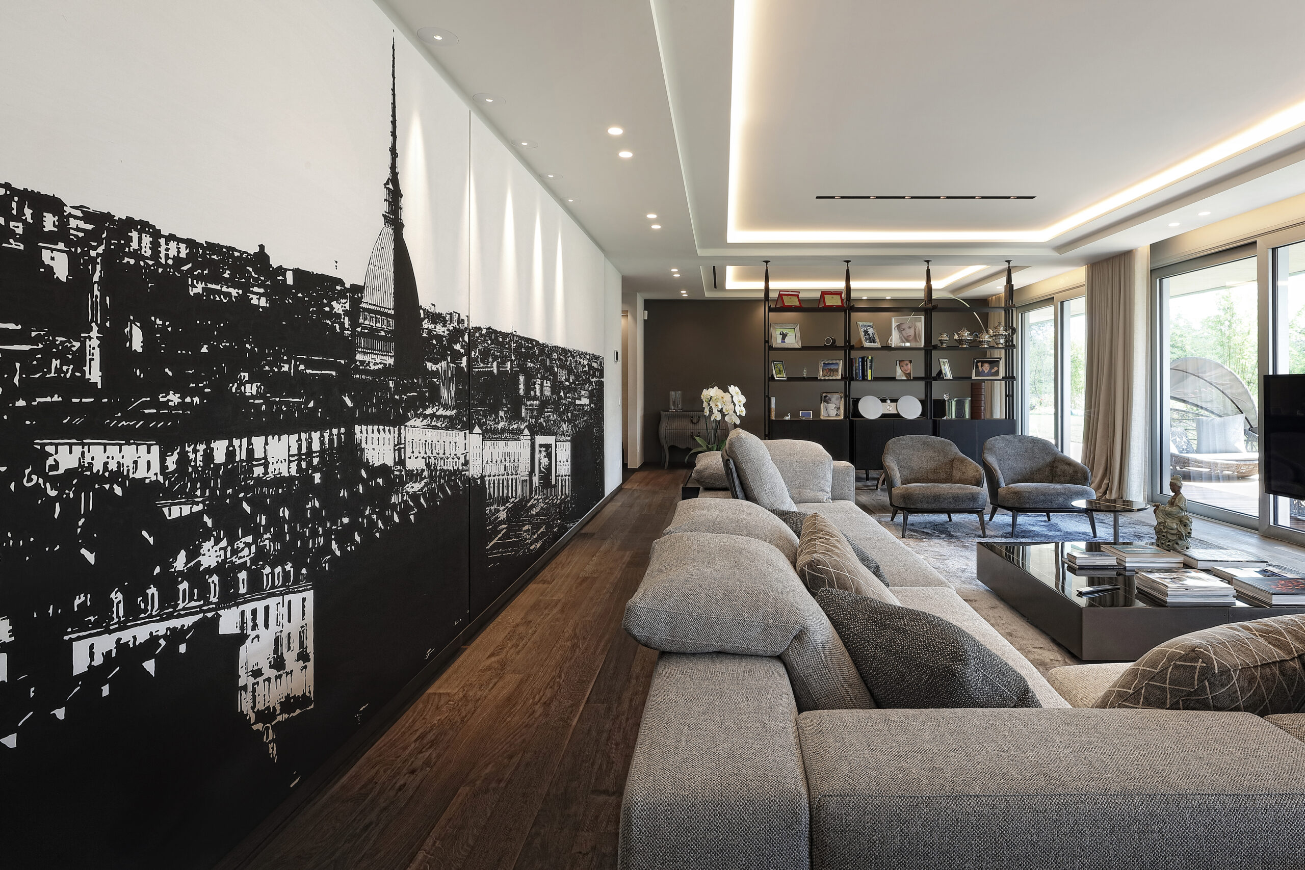 Completely open toward the garden, furnished with Dedon’s Seashell seats, the living room is suitable for both comfort and recreational activities, guaranteed by a wide selection of Minotti products such as the Tang sofa and Leslie armchairs, together with the Elliot tables, Joy “Jut out” and the Dibbets Rainbow carpet. Cassina’s Infinito bookcase separates this space from a more sheltered area, dominated by a half-tailed piano and the iconic Arco lamp by Flos.
