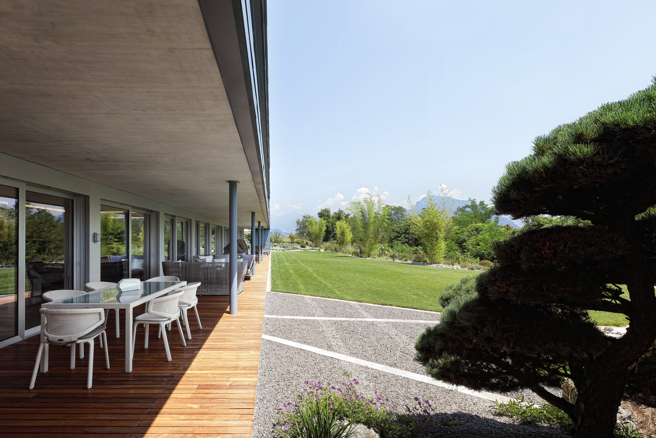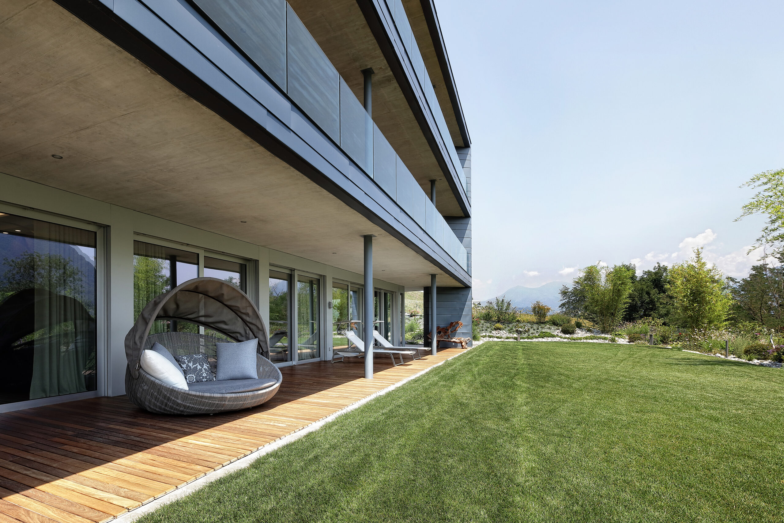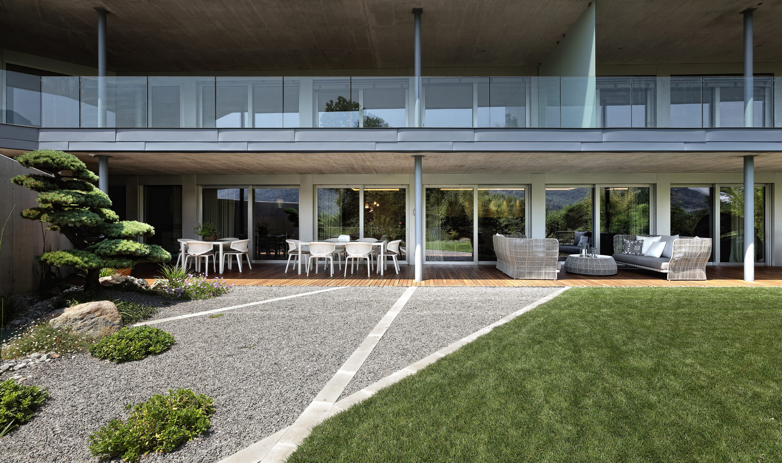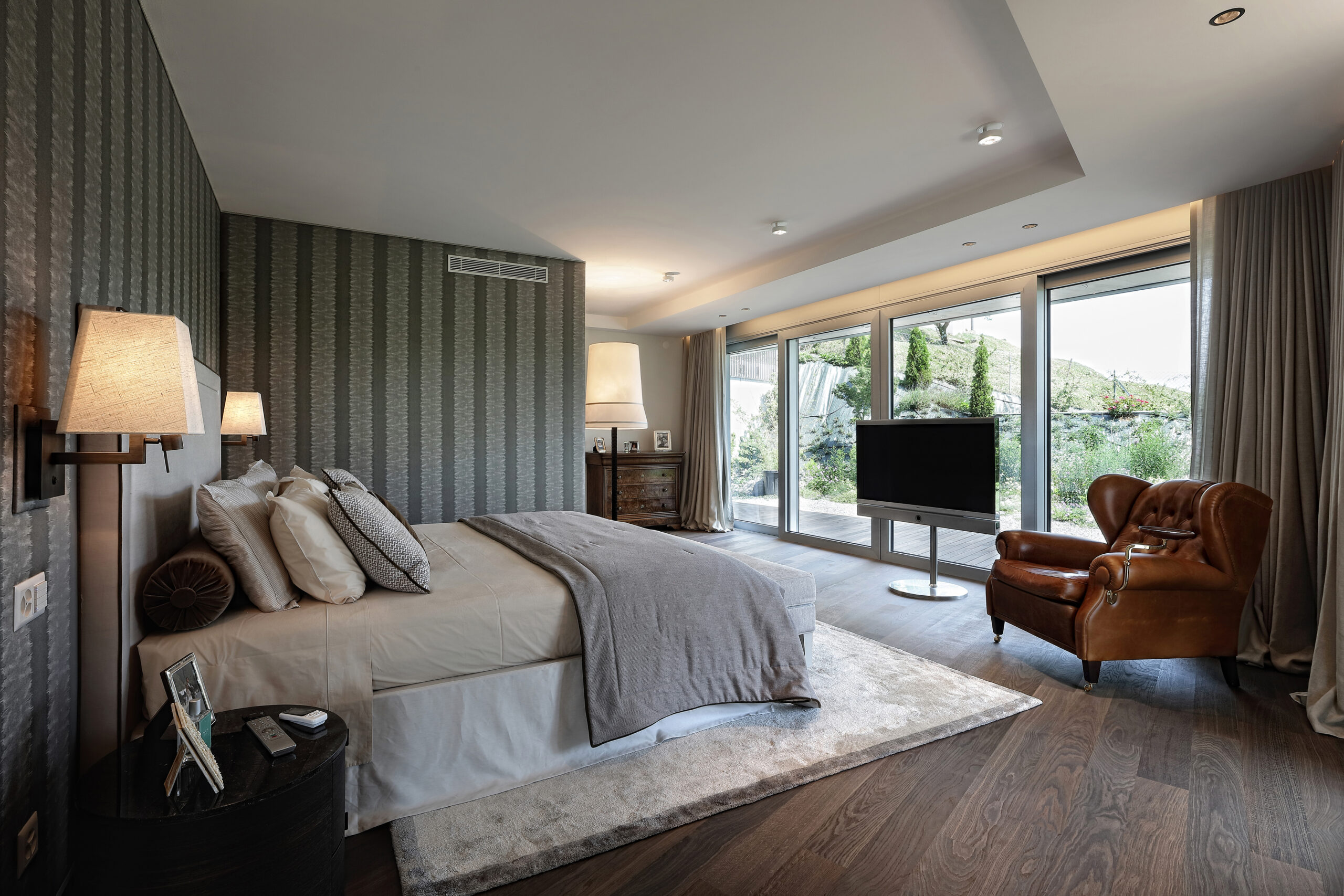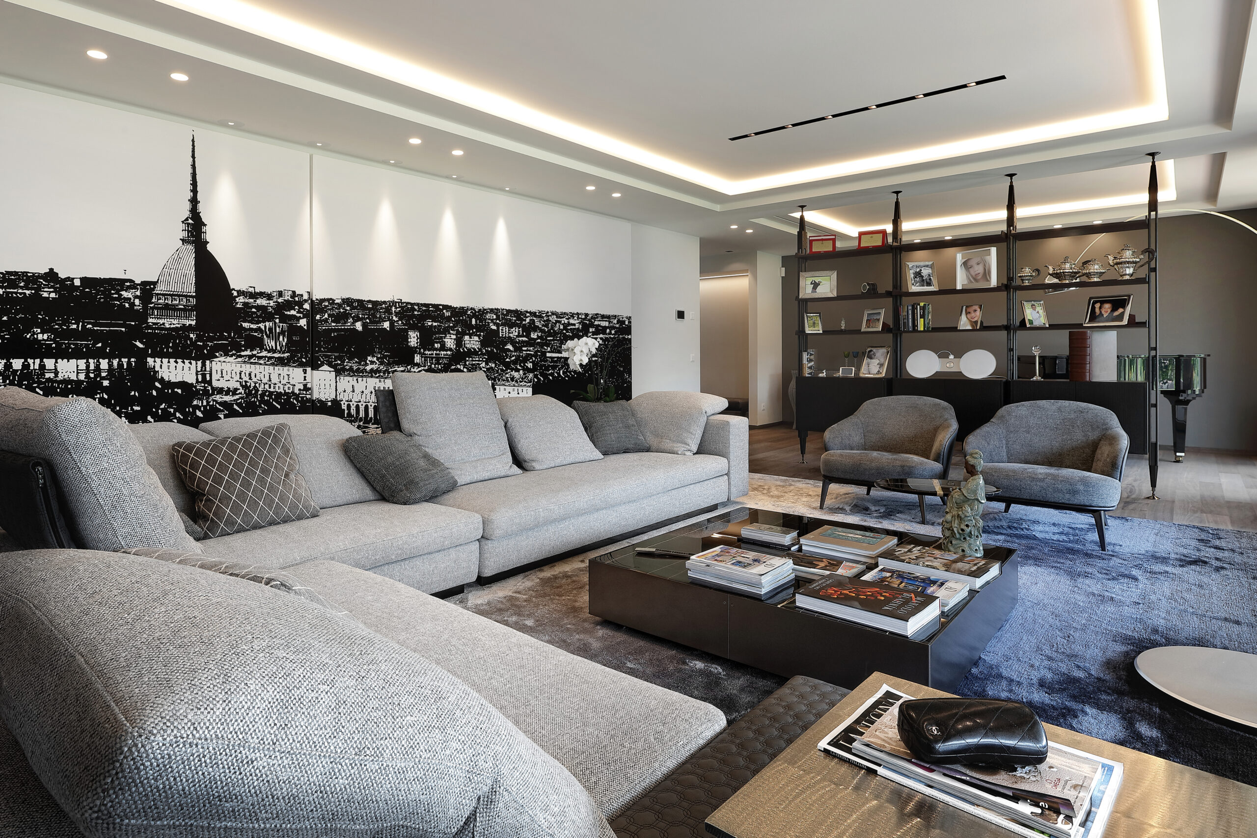 Completely open toward the garden, furnished with Dedon’s Seashell seats, the living room is suitable for both comfort and recreational activities, guaranteed by a wide selection of Minotti products such as the Tang sofa and Leslie armchairs, together with the Elliot tables, Joy “Jut out” and the Dibbets Rainbow carpet. Cassina’s Infinito bookcase separates this space from a more sheltered area, dominated by a half-tailed piano and the iconic Arco lamp by Flos.