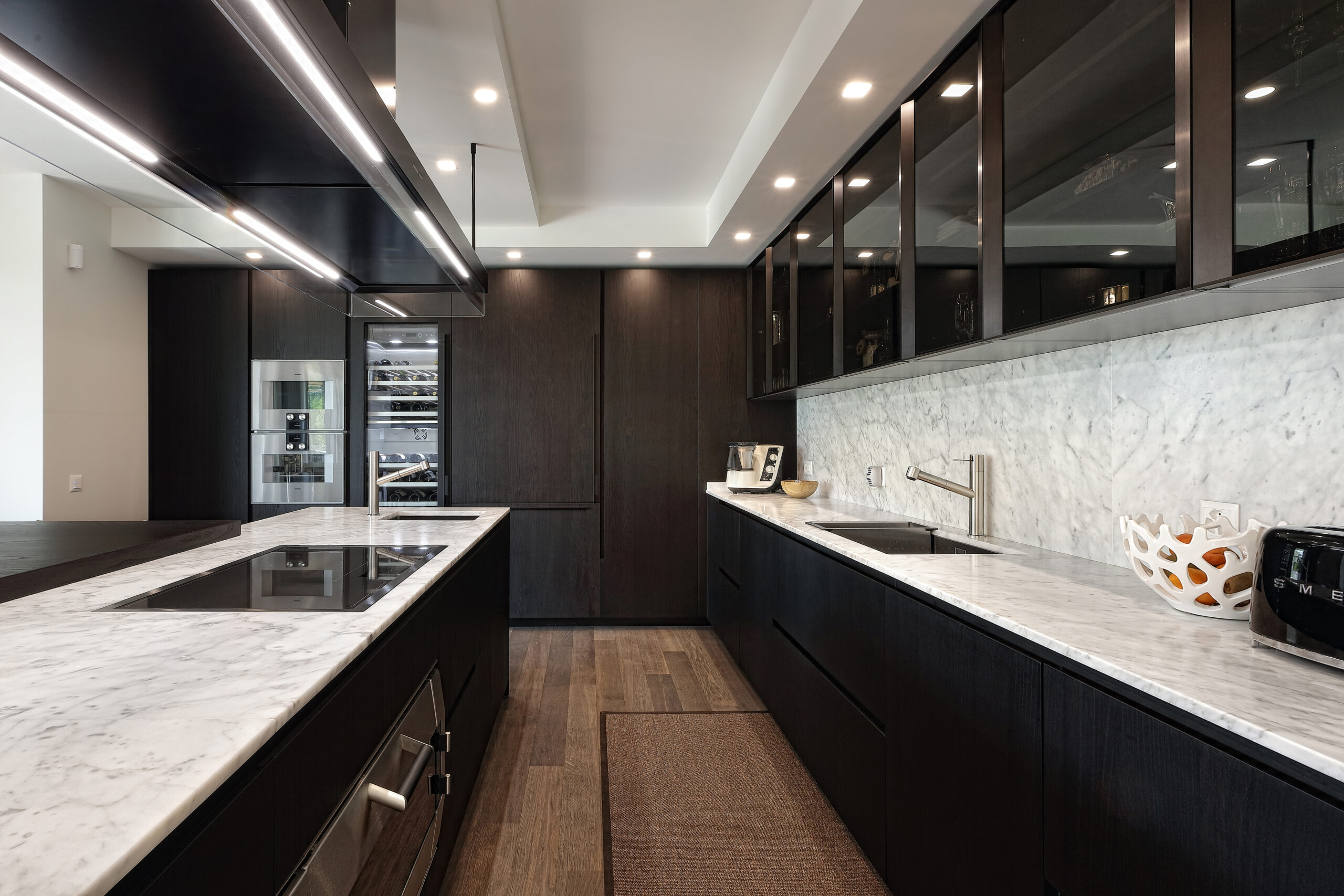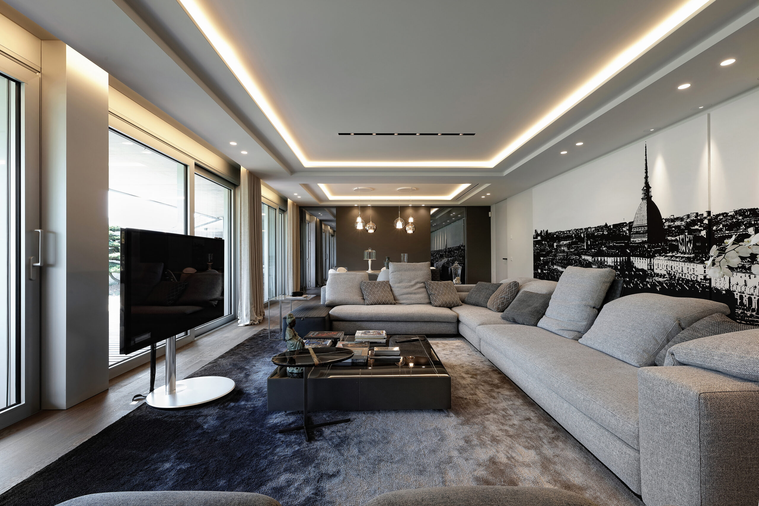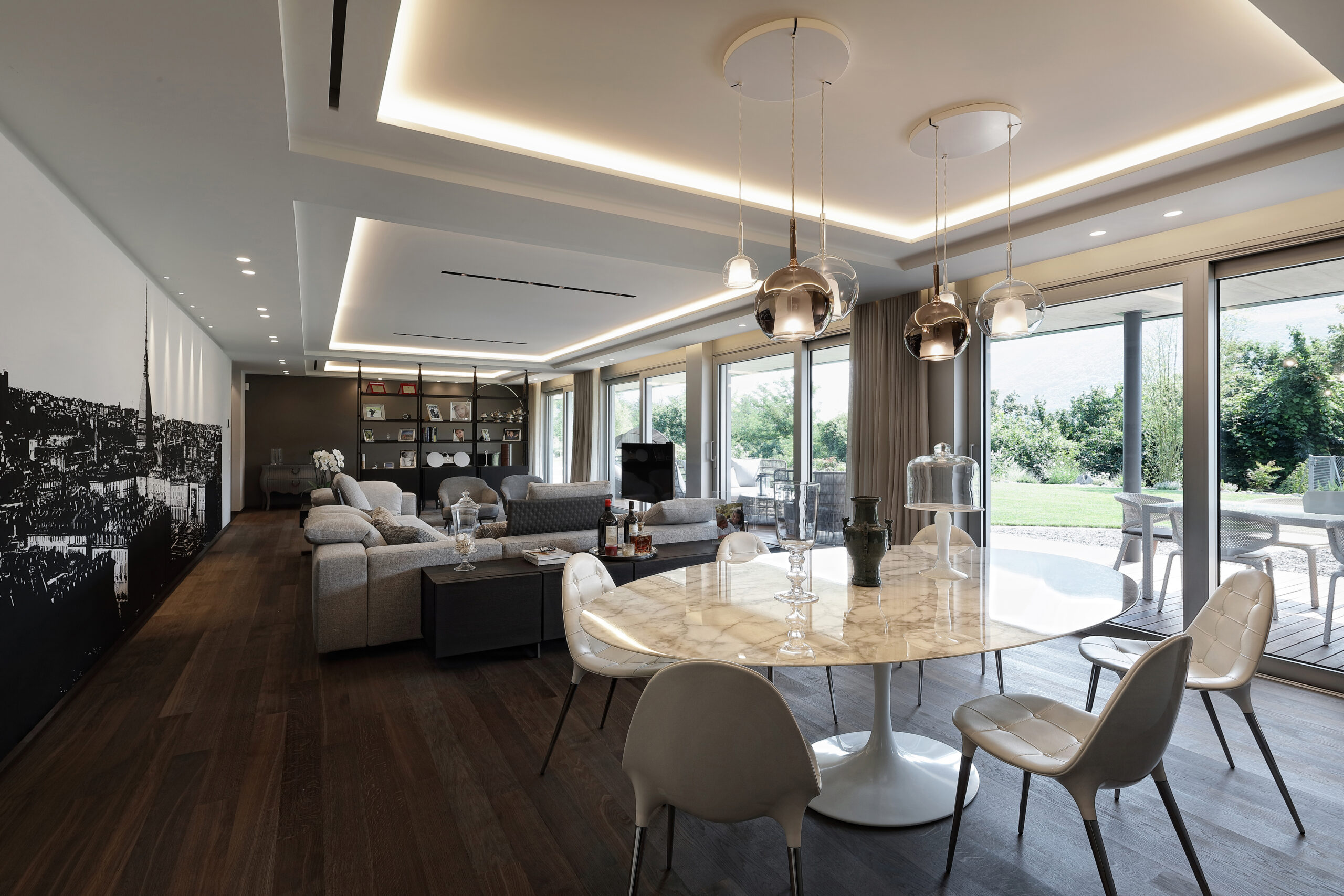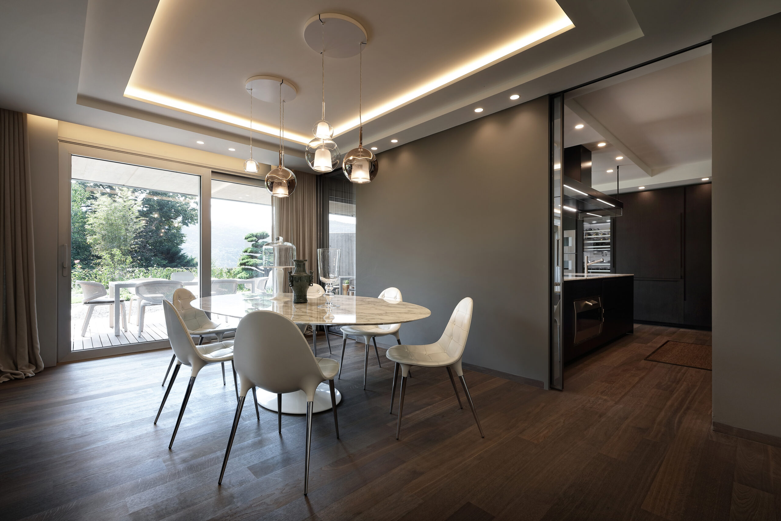 Going along the living area, there is the dining area, preceded by the Poliform Pandora sideboard and illuminated by the Glo lamps by Penta. The absolute protagonist of this space is the Saarinen marble table by Knoll, surrounded by the Caprice chairs by Cassina. The soft colors and the perfect balance of shapes give maximum elegance to this area, delimited further by Poliform’s Alea kitchen.