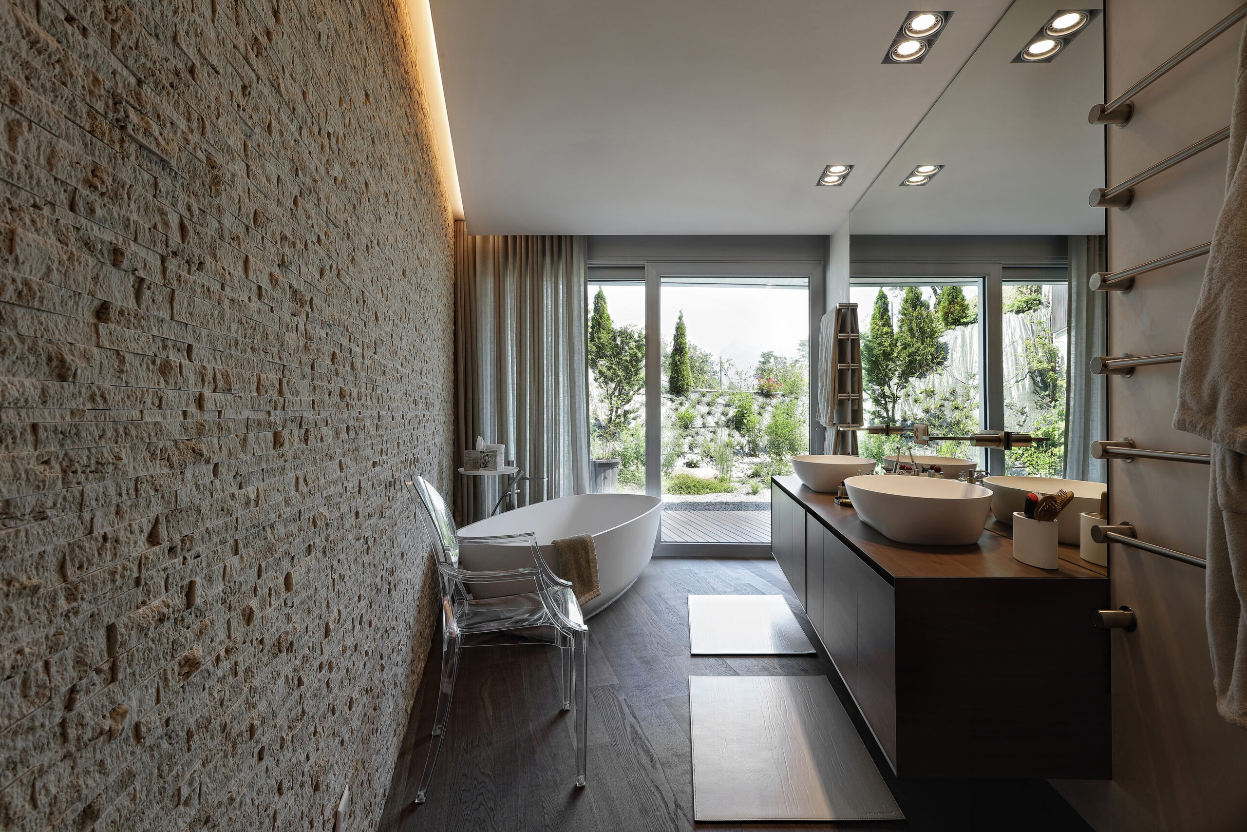 More intimate, albeit equally refined in the details of the walls and finishes, is the large master bathroom, enriched with a fine selection of products by antoniolupi, among which the PantaRei models of the bathroom cabinet and the Ago tub stand out. The iconic Louis Ghost chair by Kartell gives a further note of freshness to the whole environment, accentuated already by the large wall mirror and the windows overlooking the green space outside.