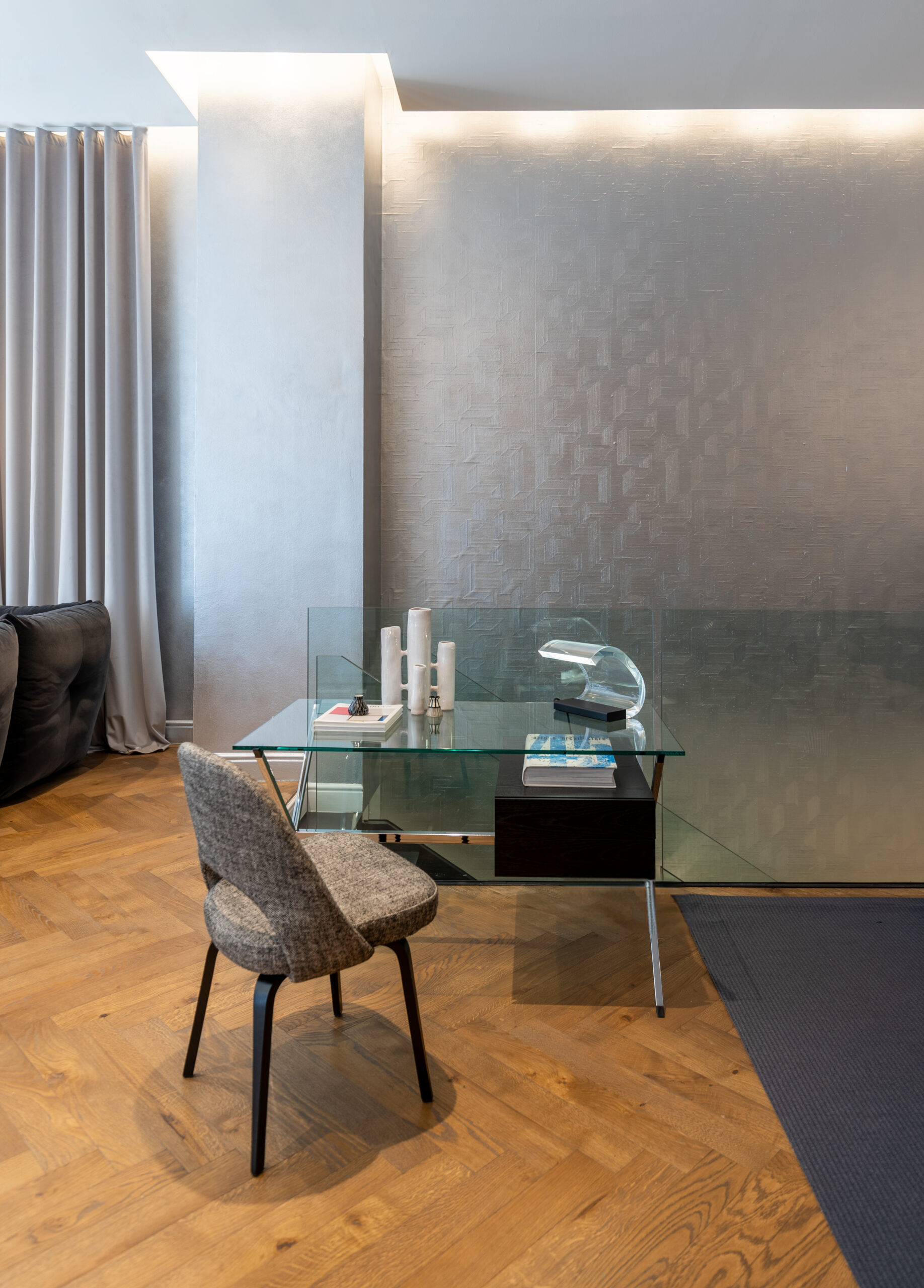 A large curtain divides this first composition from a second one located further inside, orchestrated to offer a slightly more intimate version of the living area. The black colors give way to blue, white and silver flaunted by the famous Florence Knoll sofa and the even more iconic Platner armchairs accompanied by the Saarinen and Platner coffee tables. These unmistakable elements of the Knoll collection give life to a sober and welcoming environment, the ideal example of a living room where you can converse and spend pleasant hours alone or in company.