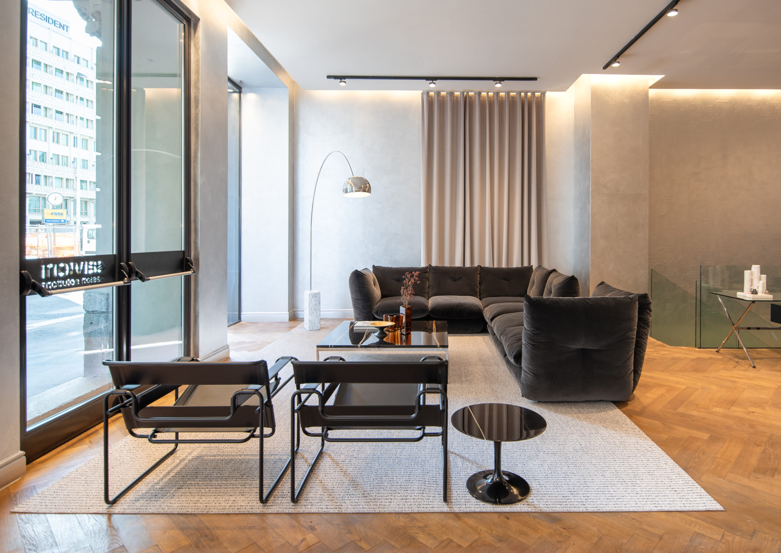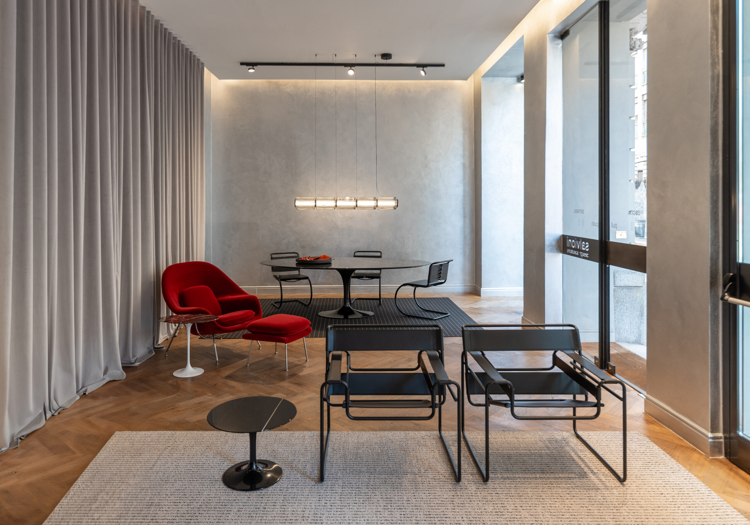 Upon entering, the visitor is greeted by two living areas, the first dominated by the Wassily armchairs and the Perron Pillo sofa in strictly black shades; the second warmed by a burnished red Womb Chair and a Saarinen marble table. The dark and sophisticated tones are perfect for enhancing the shapes and translating the play of volumes desired by the company, where the surfaces intertwine with each other creating an environment that dialogues both visually and conceptually.
