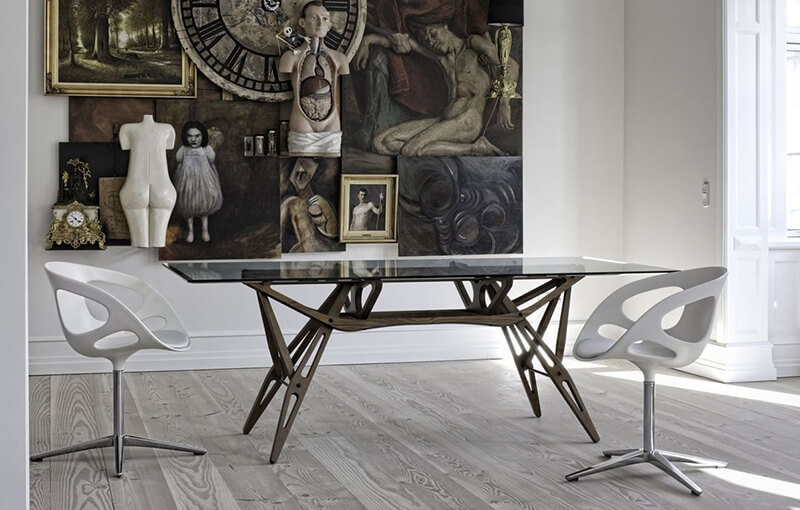Il tavolo Reale di Zanotta è uno dei progetti più affascinanti dello storico architetto e designer torinese Carlo Mollino. Il suo fascino risiede nella base, dalla complessa struttura al contempo geometrica e organica, rivelata in tutta la sua bellezza dal piano in vetro. Un’articolata simmetria di flessuose traverse in legno, compatta e trasparente, in cui ogni elemento si incastra agli altri con precisione.