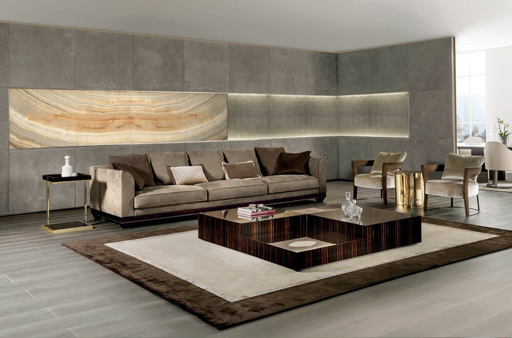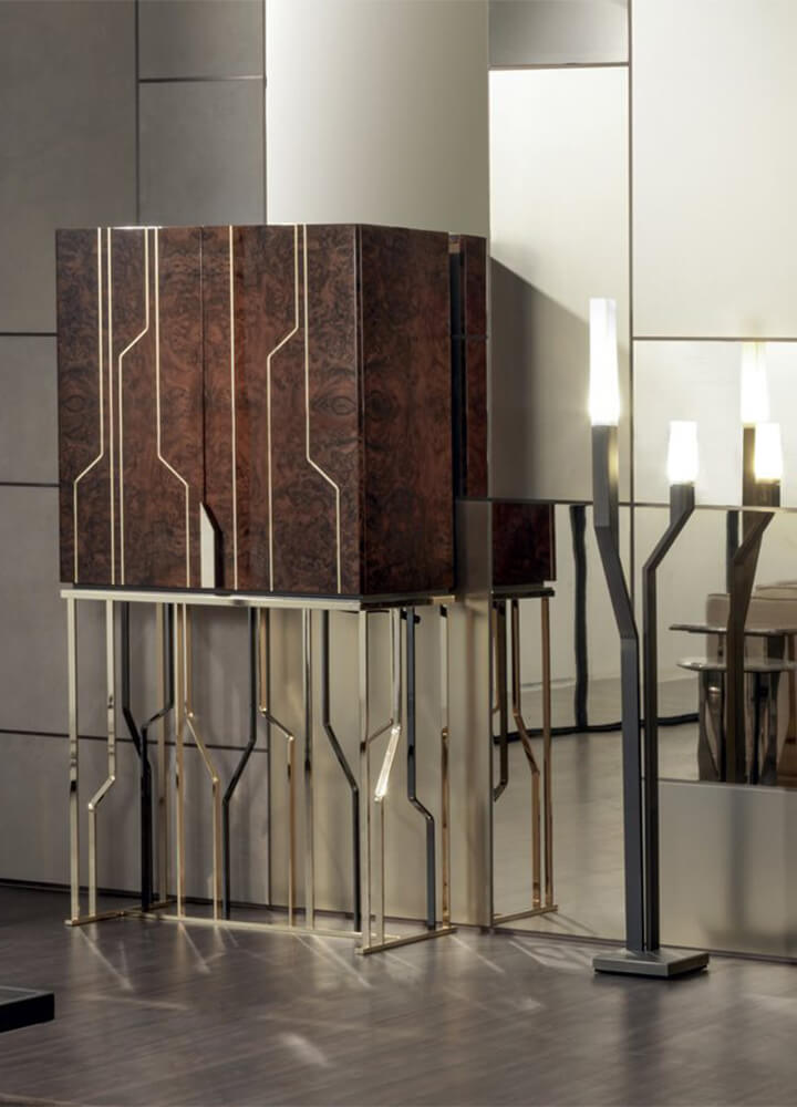Il lusso degli arredi Longhi nasce in primo luogo dall’uso di materiali di finissima qualità: divani e poltrone realizzati a mano, rivestiti con pelli trattate unicamente con procedimenti naturali o velluti di pregio; tavoli e tavolini con piani in marmo o onice e madie realizzate in legni dalle essenze rare di prima categoria. Ogni pezzo va a costituire un catalogo di proposte ricche e sfarzose, pensate per una clientela in cerca di eccellenza.