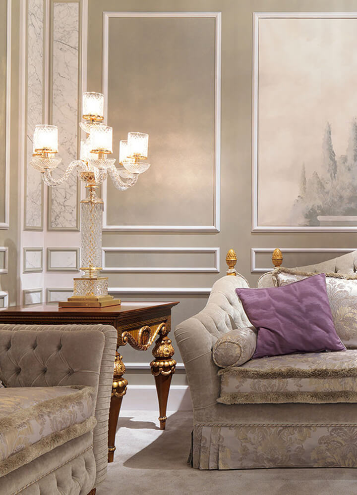 Partendo dal legno massello, i maestri ebanisti di Zanaboni intagliano la struttura successivamente decorata da pitture, cui vengono poi a sommarsi lavorazioni in rilievo a gesso. Di particolare rilevanza l’esclusivo intarsio in madreperla che si ritrova nel modello di comò W017, un pezzo unico e straordinario.