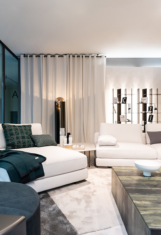 Completano l’esposizione il pouf Moon e la panca Olivier, utilizzati per dare ancor più vitalità e naturalezza all’intera composizione, nonché le suggestive librerie CC Light, una forma d’arredo luminoso che ben si presta a conferire un ulteriore tocco di luce.