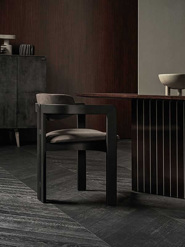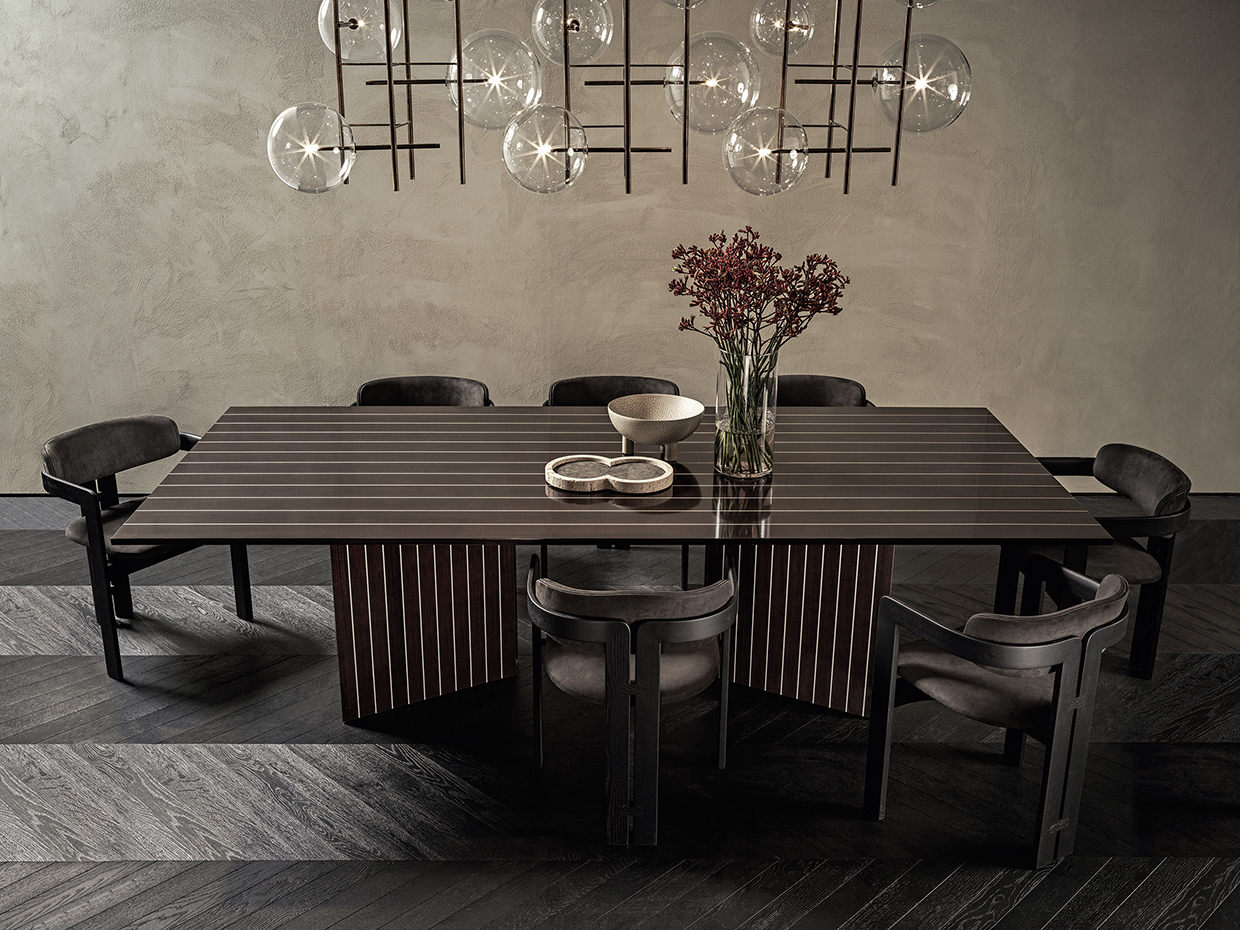 Il tavolo Prism si distingue per la chiara linea progettuale, le geometrie solide e la struttura che abilmente fonde legno e metallo nello snodarsi del piano rettangolare a forma di prisma; il legno Palissandro India, impreziosito da intarsi in alluminio che percorrono la struttura, celebra un’eleganza rara, perfetta per accostarsi a stili d’arredo in genere preclusi a quel tipo di materiale. Peculiarità della lavorazione sono l’inserimento di sottili lamine di alluminio tra le lastre volte a far risaltare ancor più la naturale venatura del legno e la scelta dei progettisti david/nicolas di svuotare la massa monolitica della struttura, donandole così leggerezza e grande trasparenza visiva.